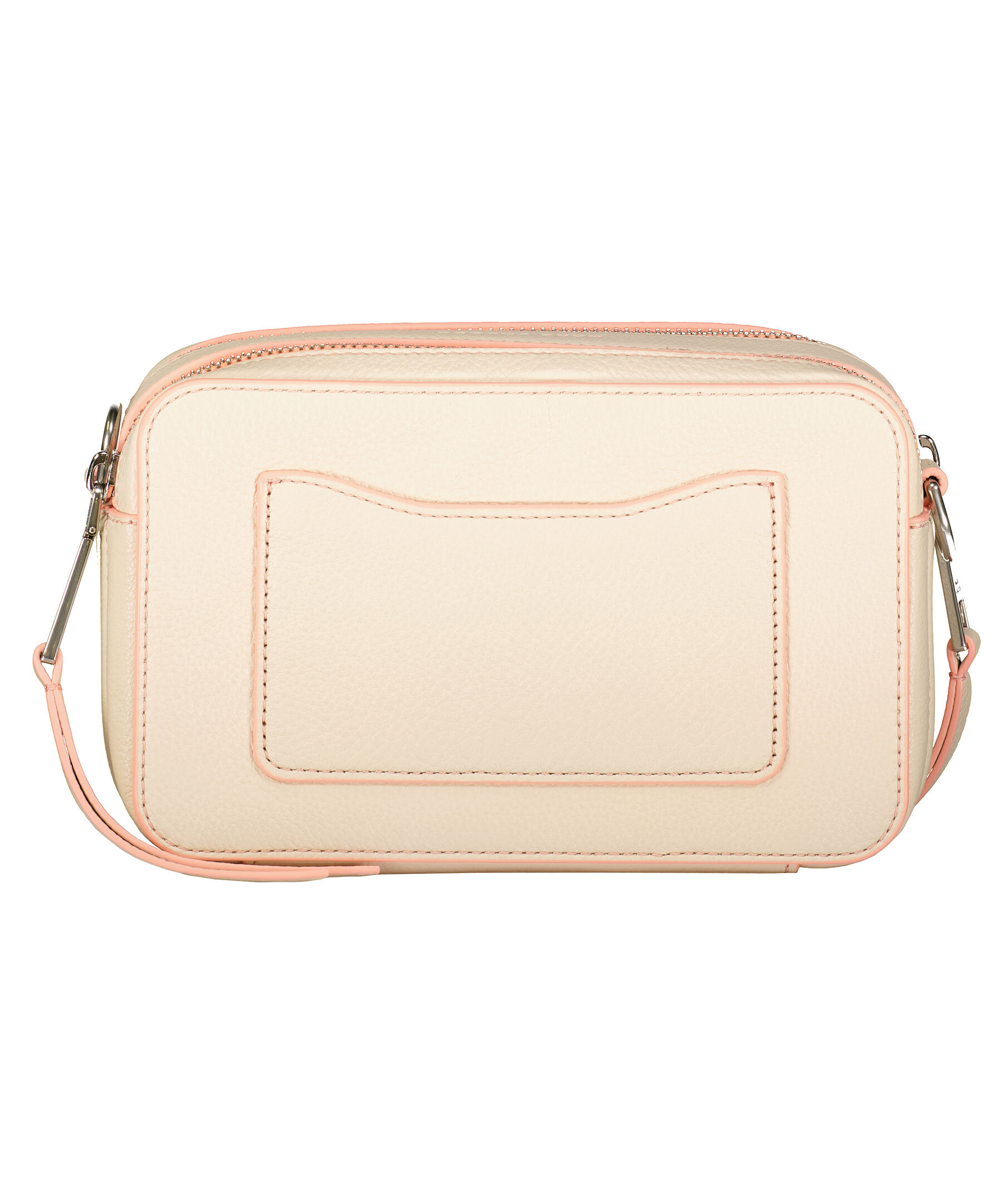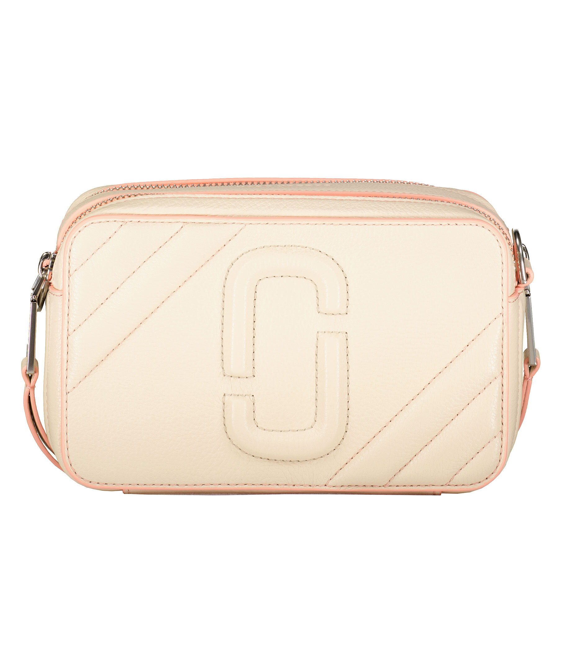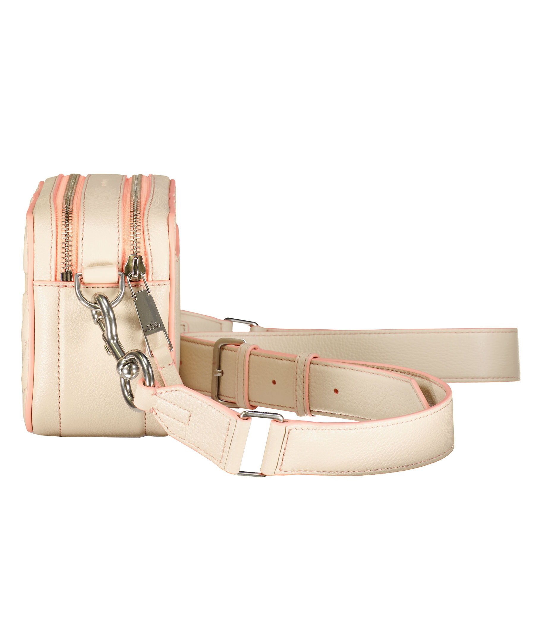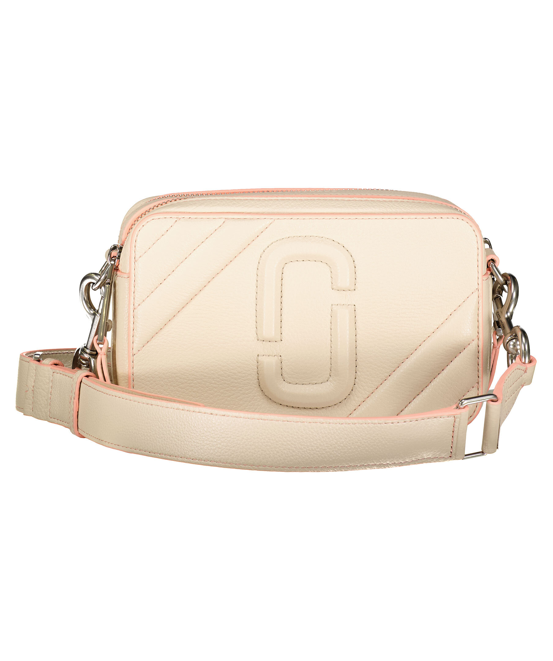 Beige handväska med rosa detaljer i läder från Marc Jacobs. Camera bag stil, justerbar bred beige och rosa läderrem. Två fack med dragkedja och en ytterficka. Embossad logotyp med sömmar runt om. Bredd: 24cm Höjd: 14cm Djup: 9cm