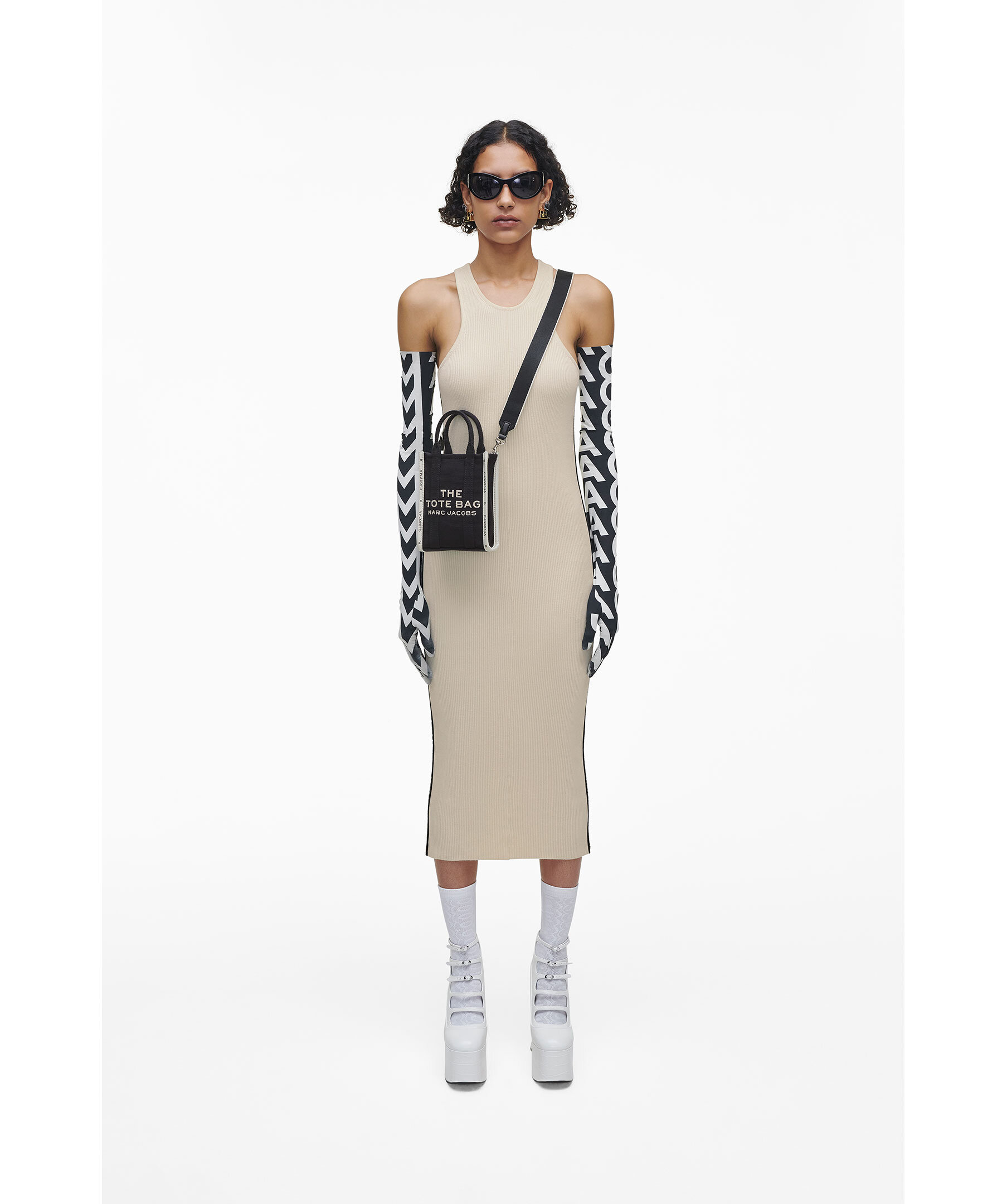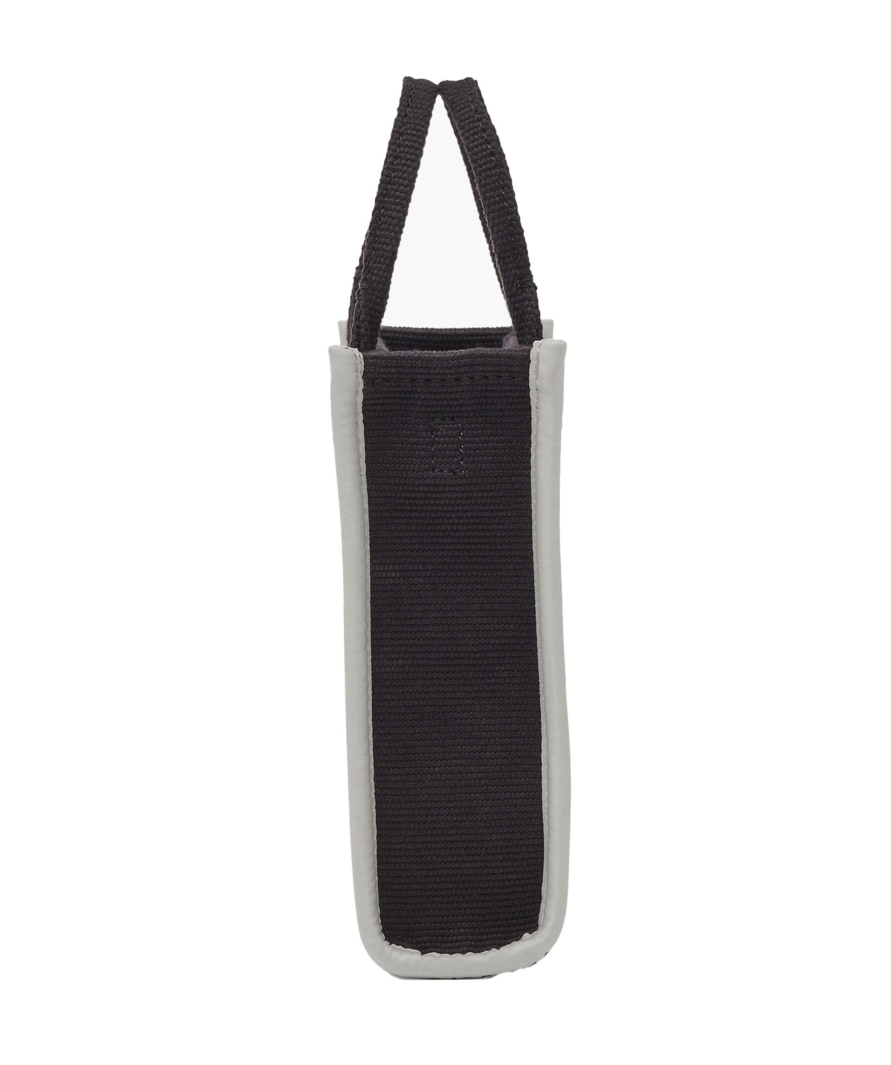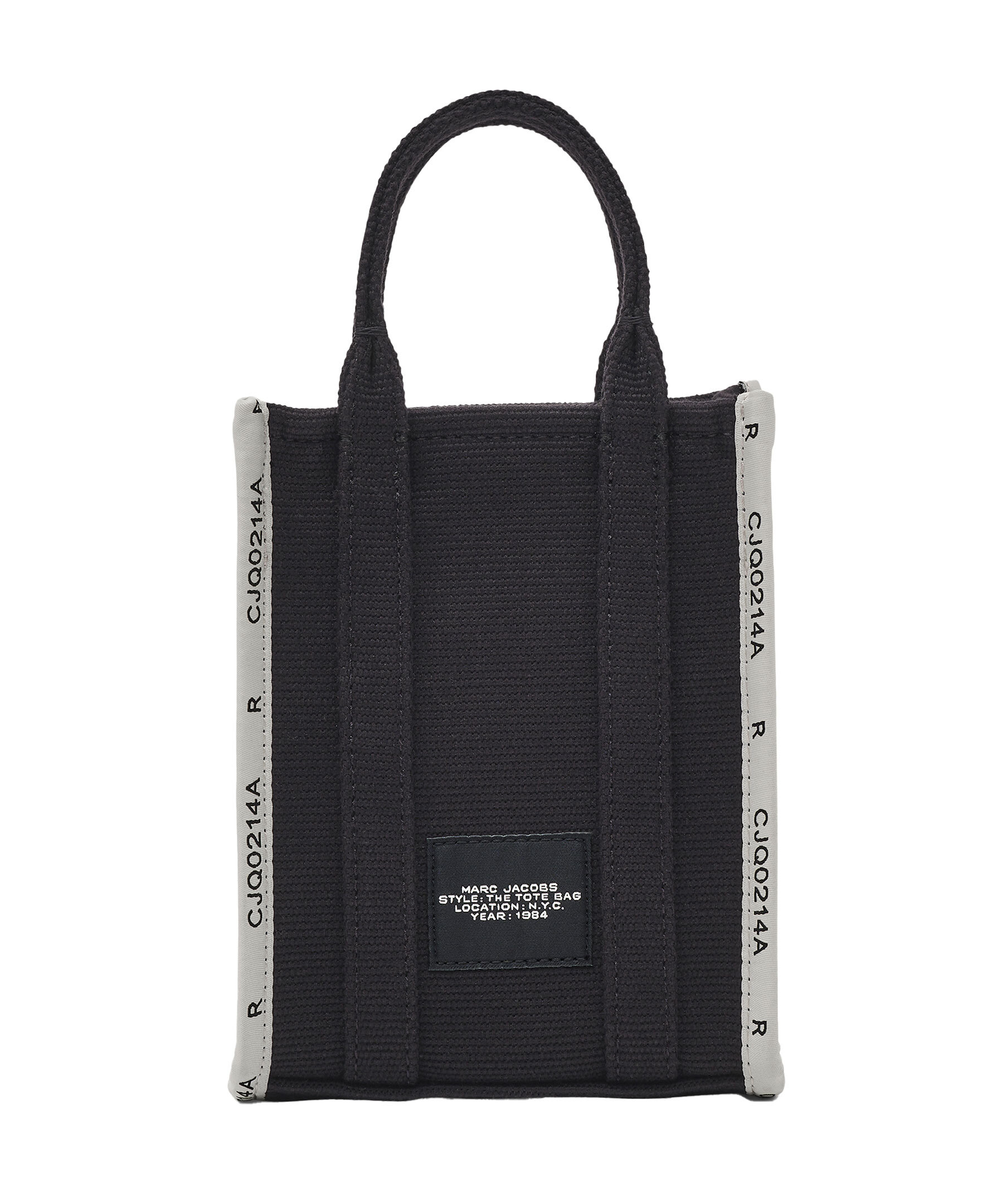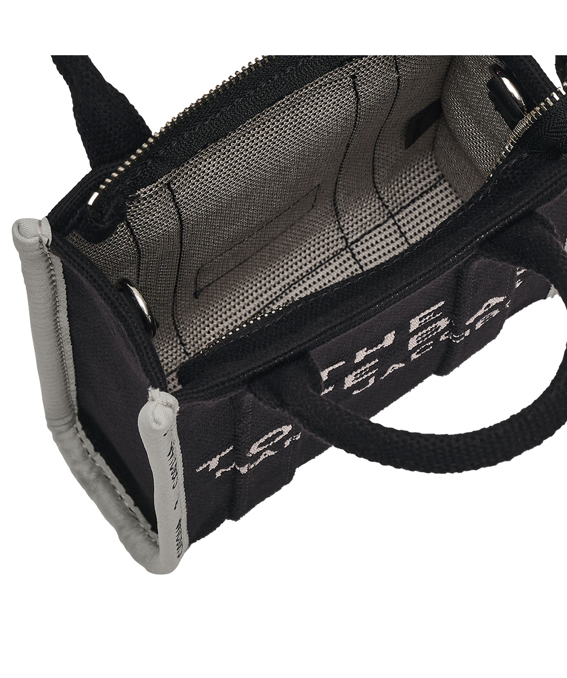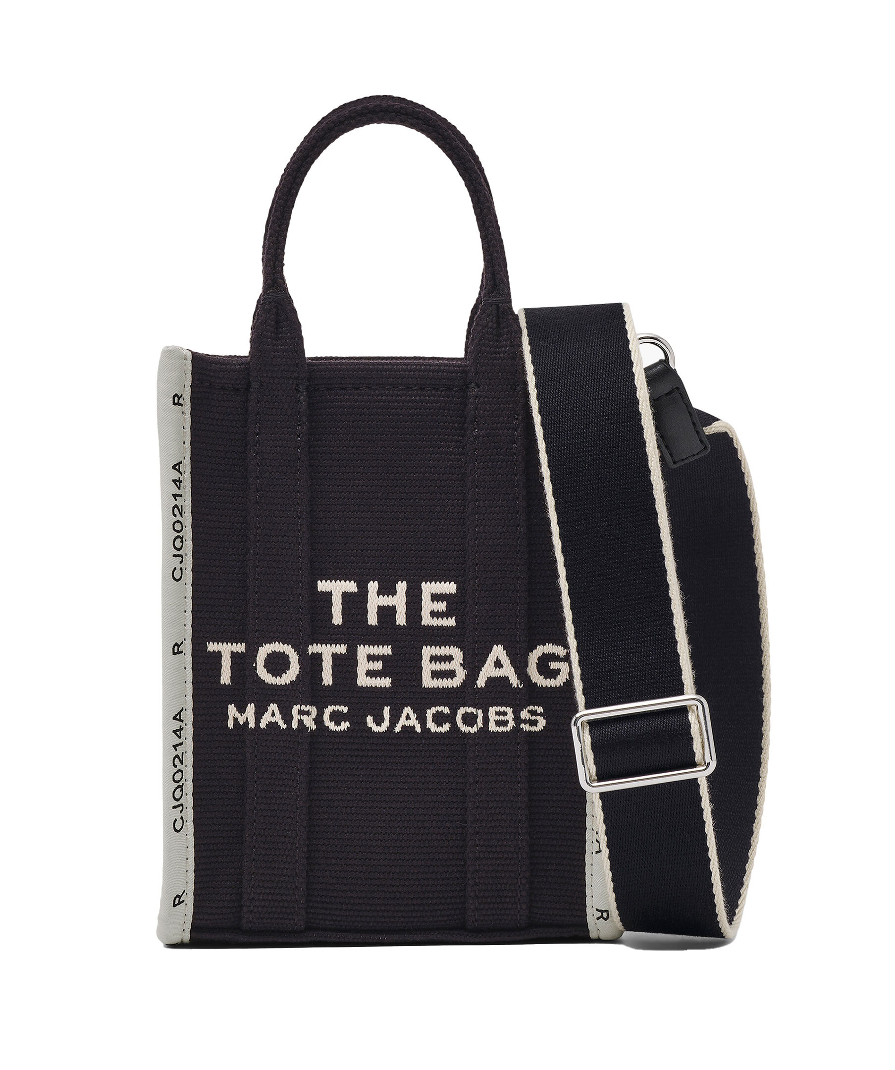 Svart Mini Tote från Marc Jacobs, den minsta väskan i deras kollektion. Tillverkad i vävd jacquard. En tjock dragkedja upptill och logotypen framtill gör den här väskan till en miniikon. Bär din i de övre handtagen eller fäst den justerbara, avtagbara crossbody-remmen för handsfree-styling. Mått: 15cm L x 6cm D x 19cm H. Rem drop 59 cm. Handtag drop 8 cm.