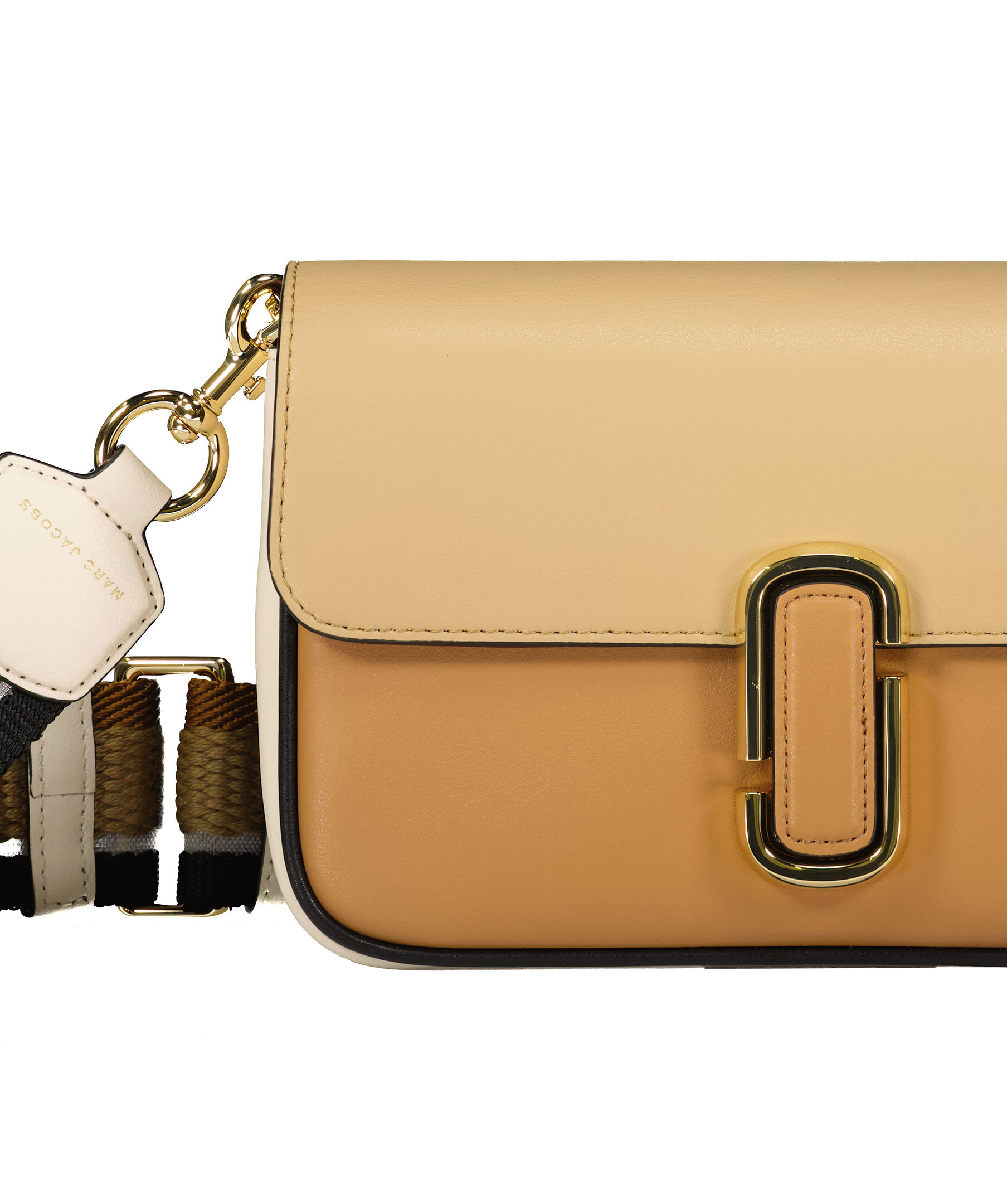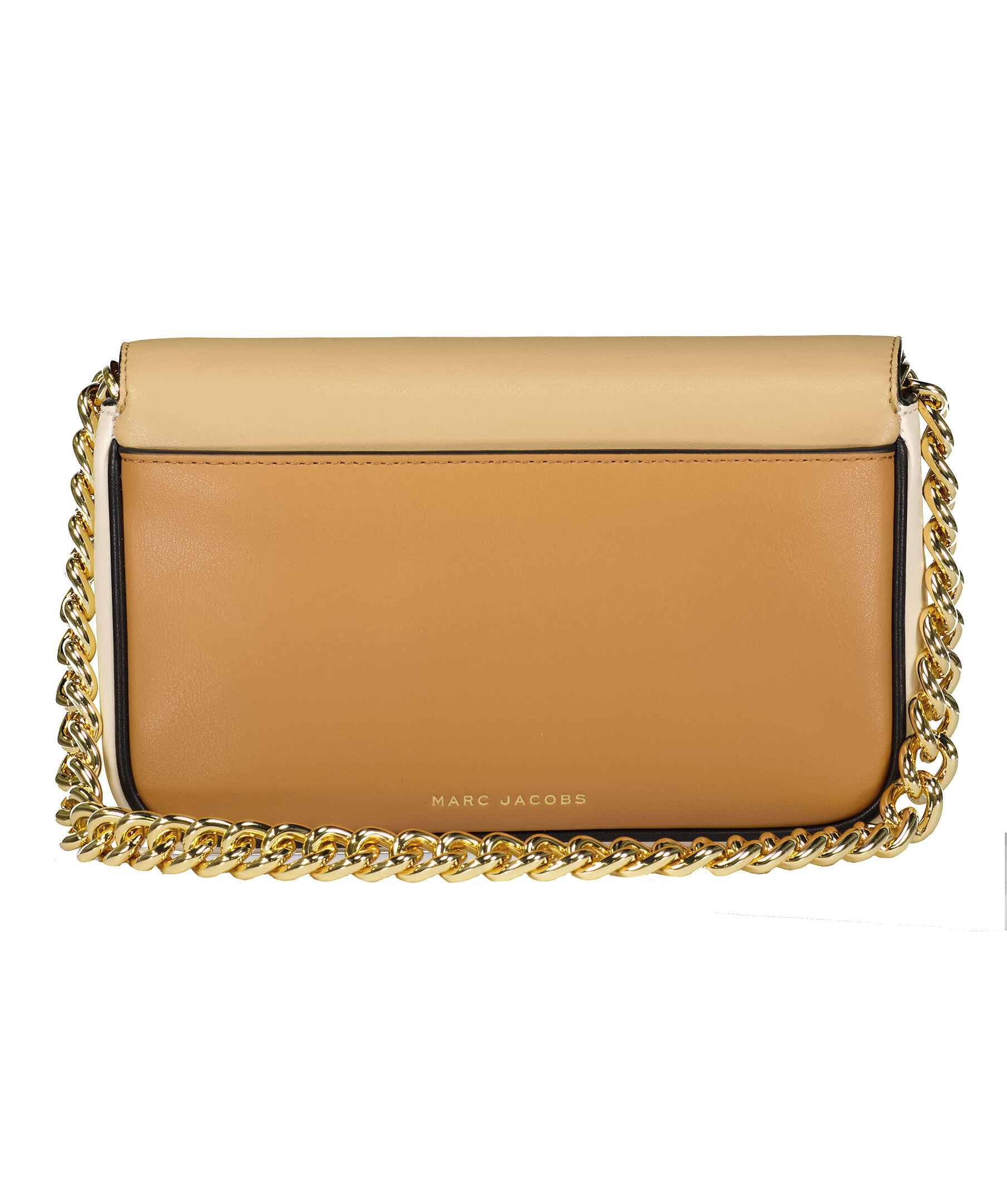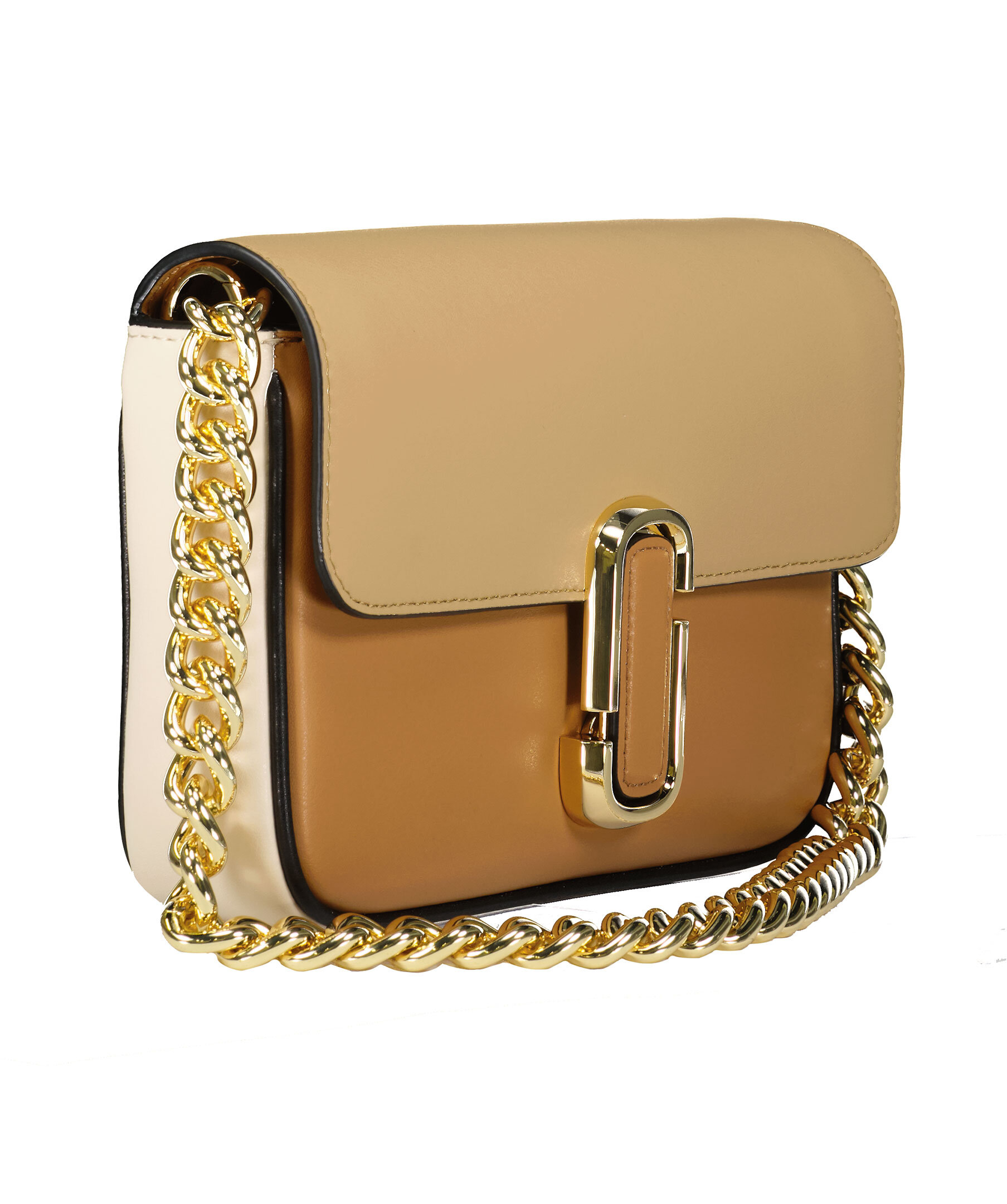 Brun, beige och ljus beige väska från Marc Jacobs. Guldfärgat spänne med magnetlås. Justerbart axelband i beige, och svart vävt material. Väskans mått, B 24cm H 15cm D 4cm.