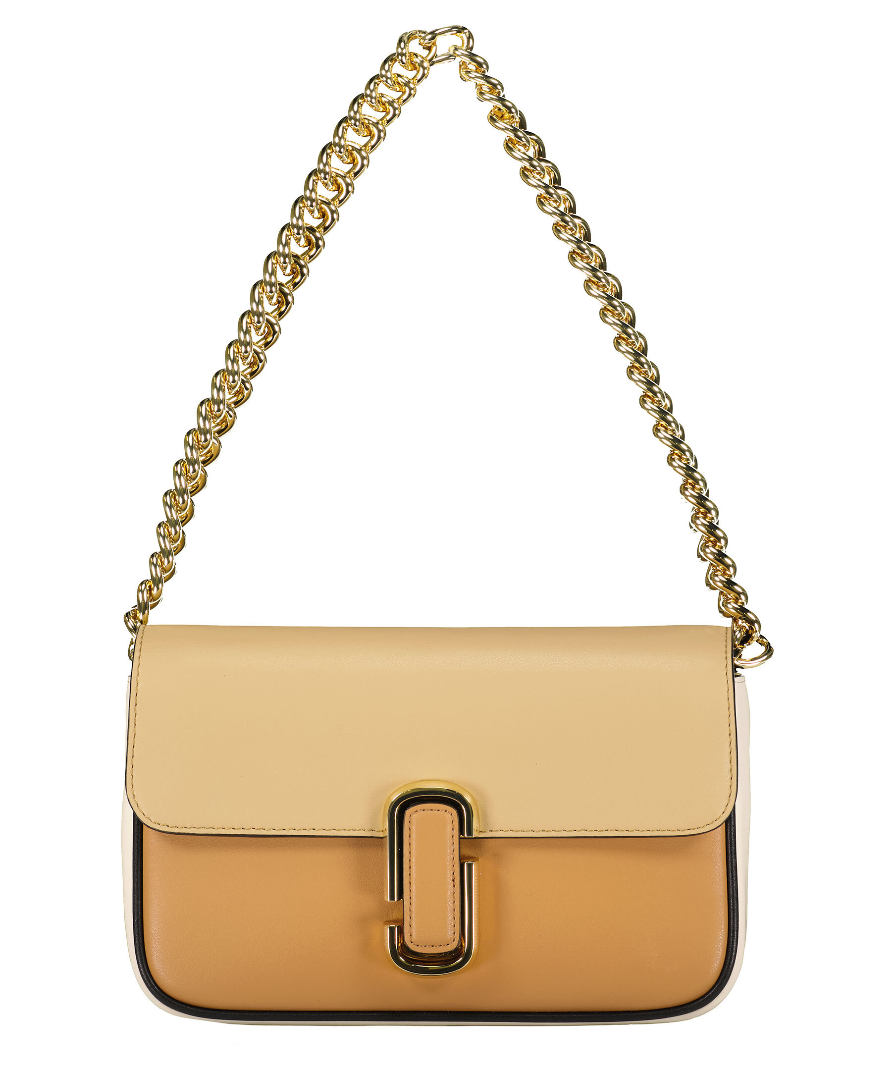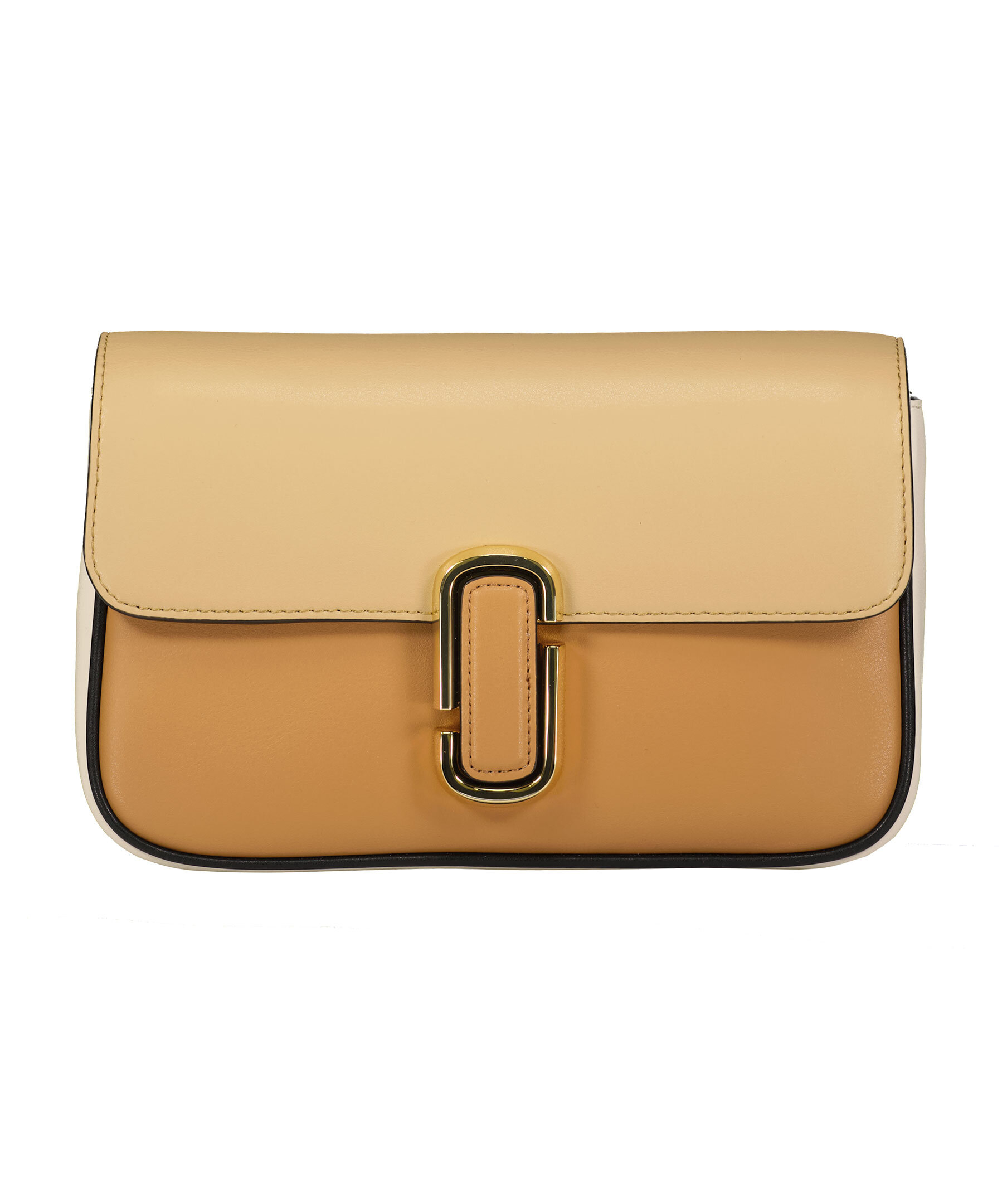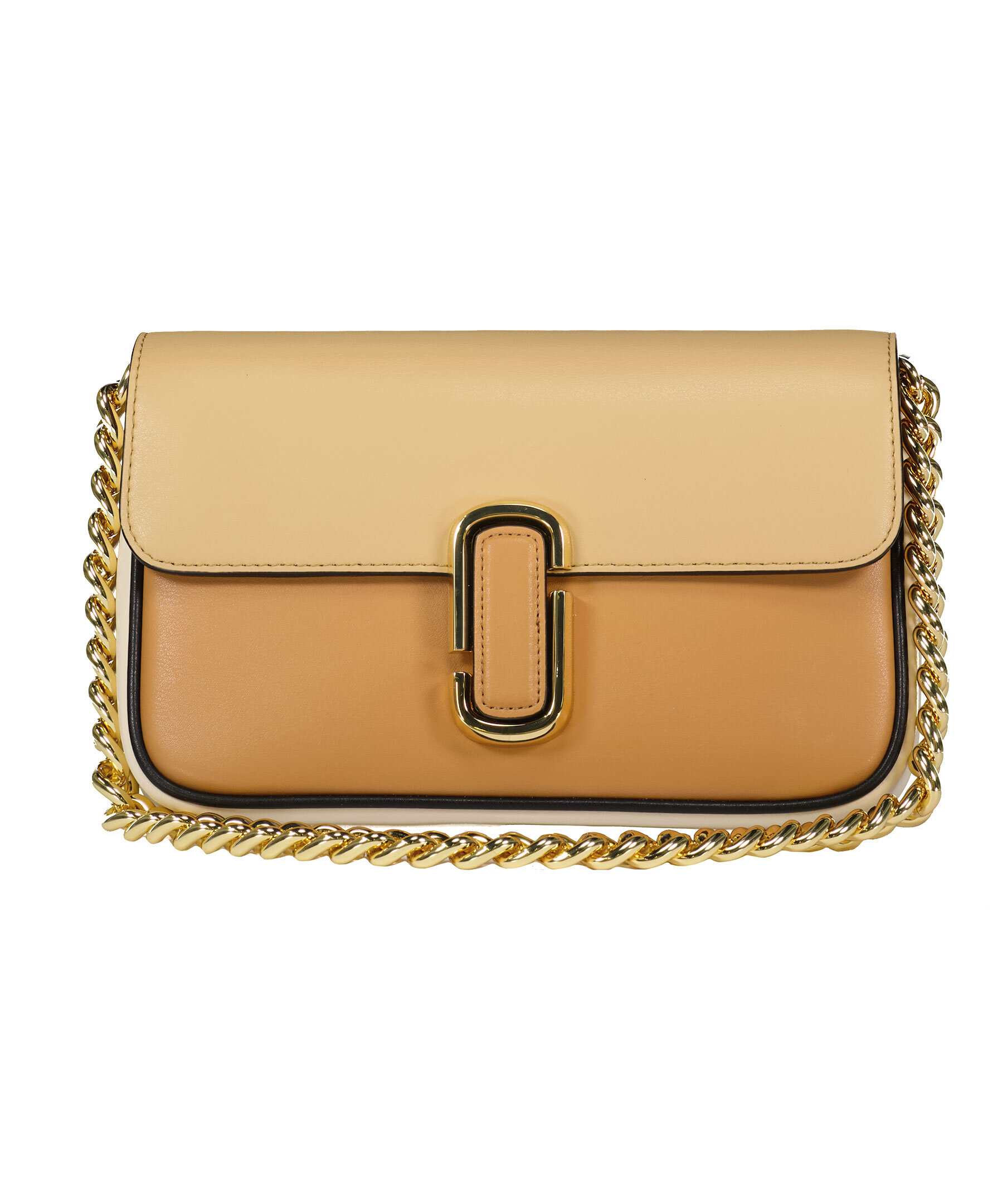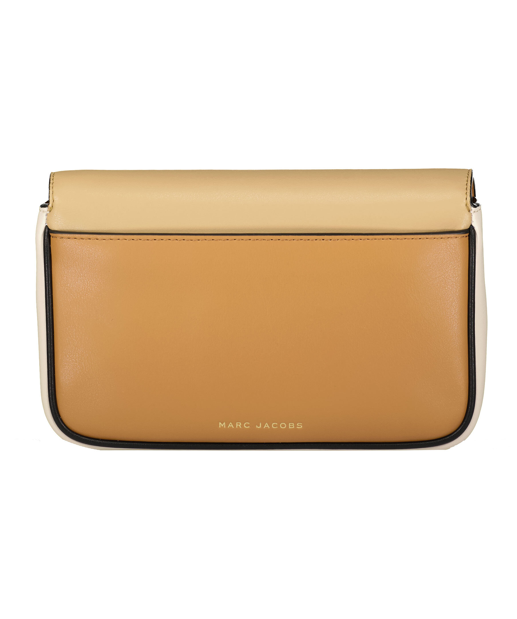 Brun, beige och ljus beige väska från Marc Jacobs. Guldfärgat spänne med magnetlås. Justerbart axelband i beige, och svart vävt material. Väskans mått, B 24cm H 15cm D 4cm.