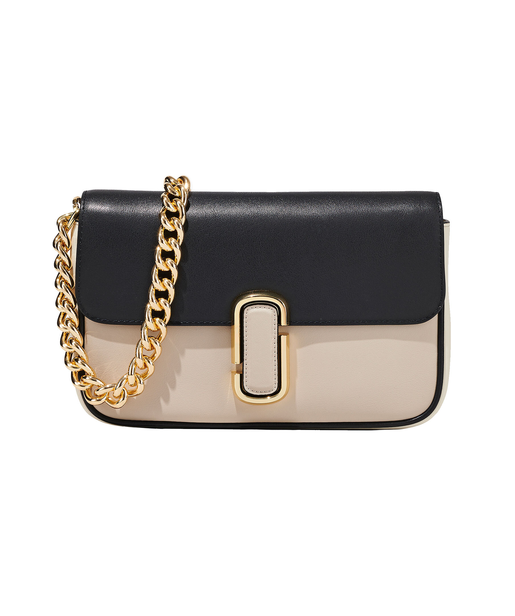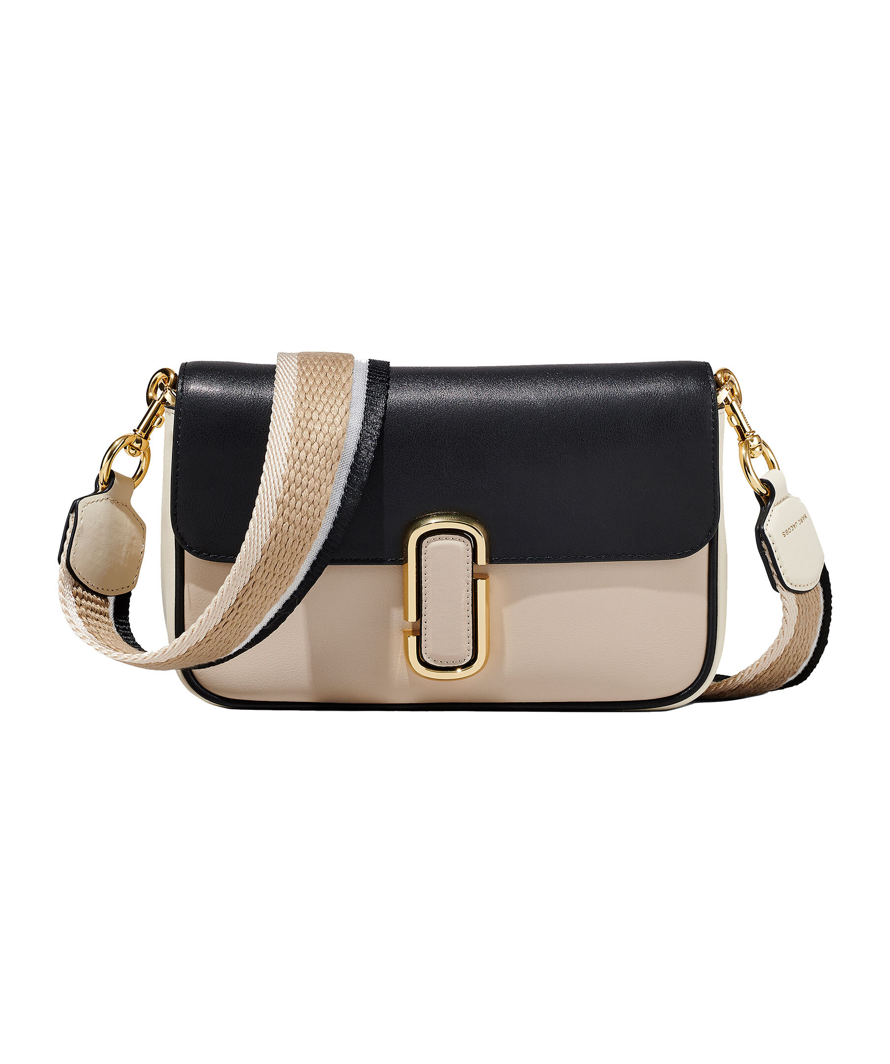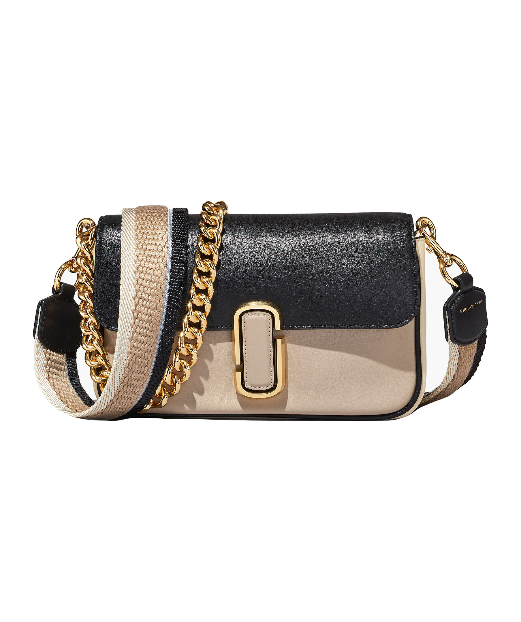 Svart och beige väska från Marc Jacobs. Guldfärgat spänne med magnetlås. Justerbart axelband i beige, och svart vävt material. Väskans mått, B 24cm H 15cm D 4cm.