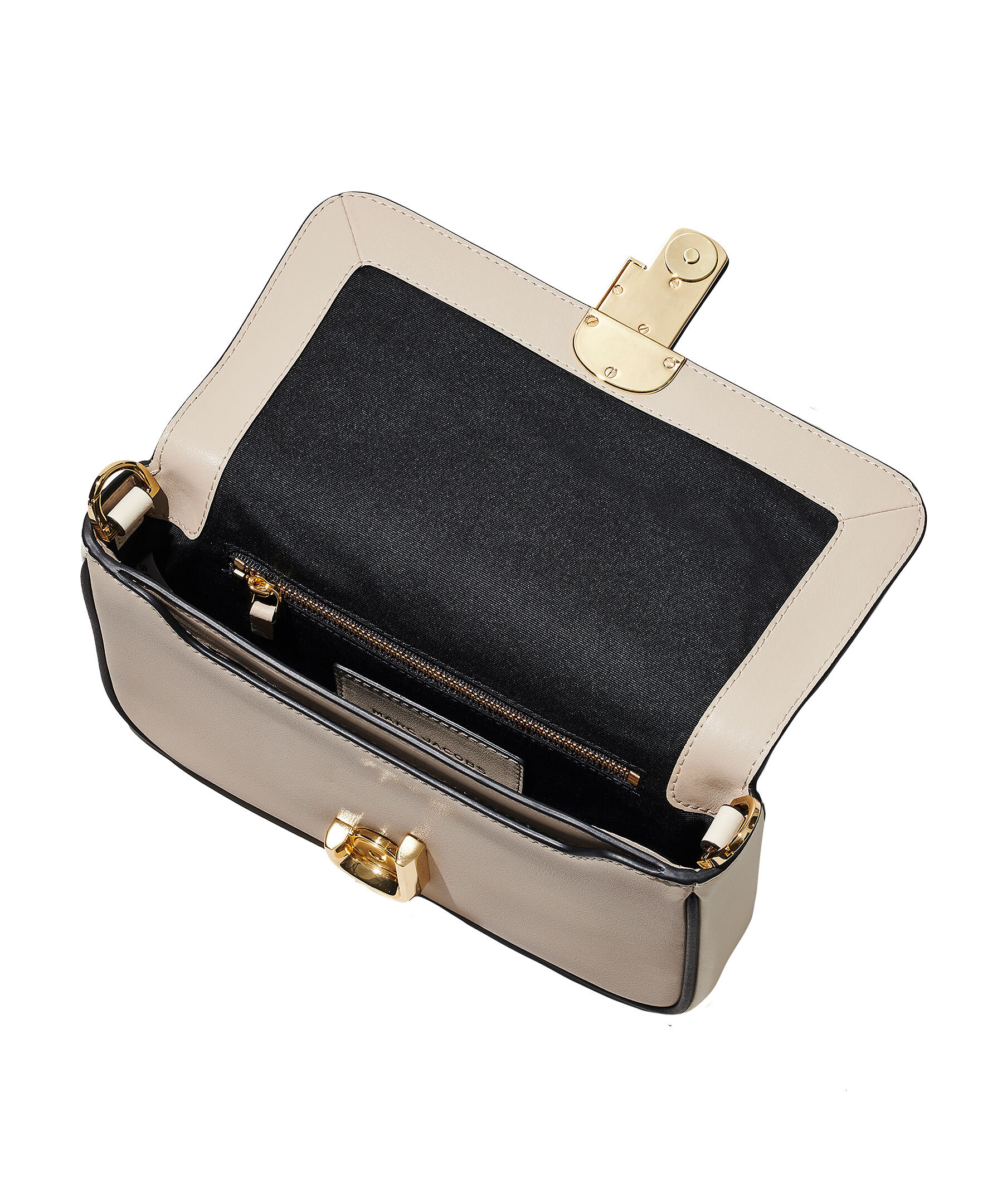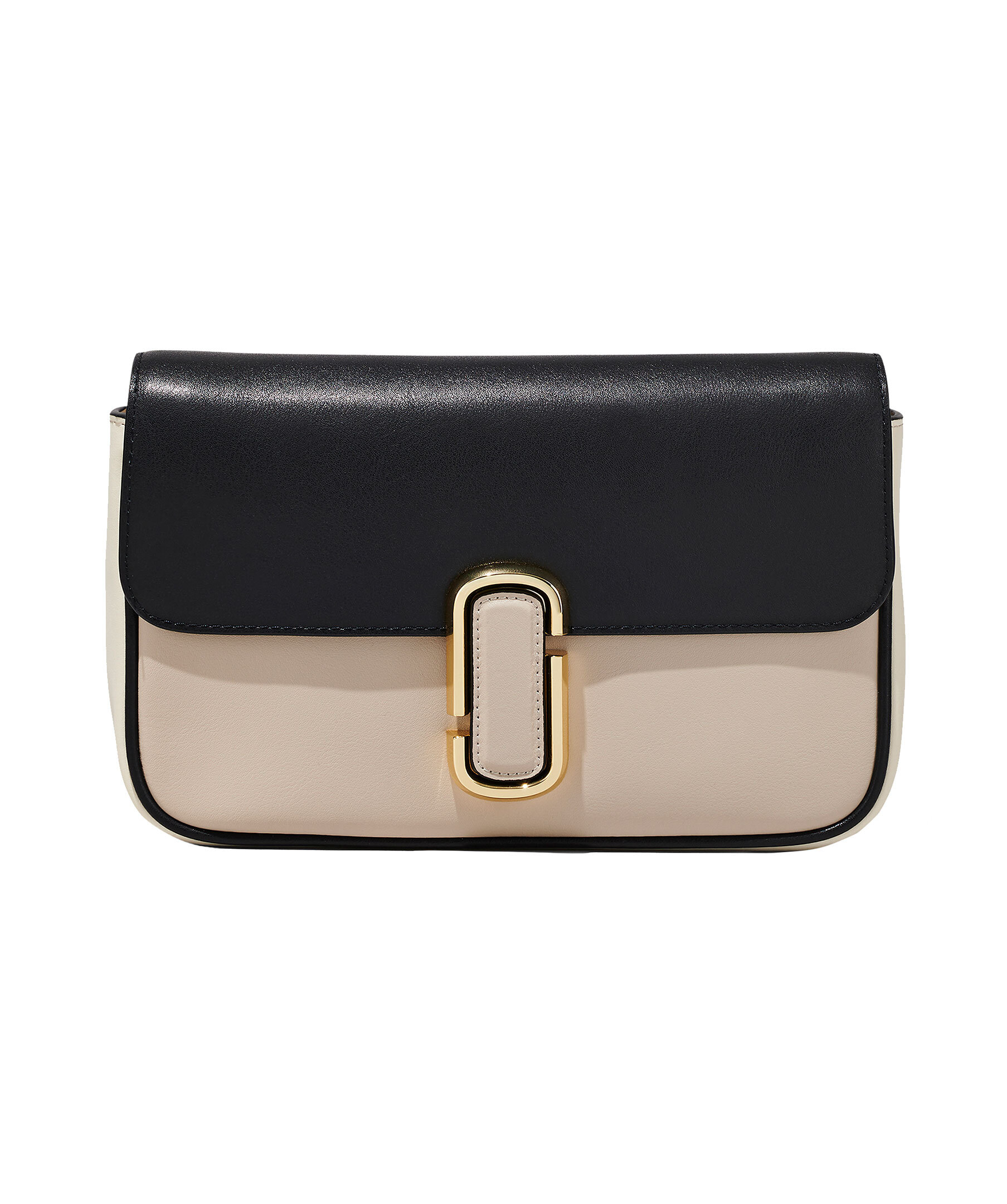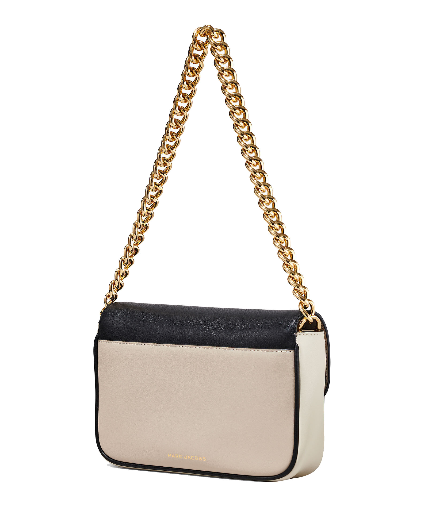 Svart och beige väska från Marc Jacobs. Guldfärgat spänne med magnetlås. Justerbart axelband i beige, och svart vävt material. Väskans mått, B 24cm H 15cm D 4cm.