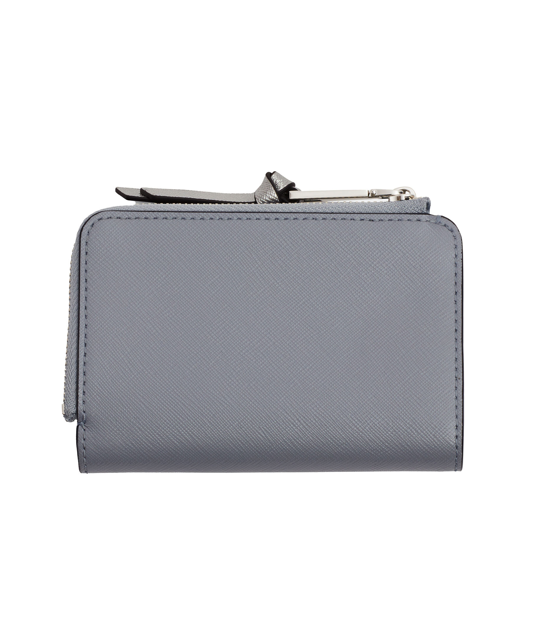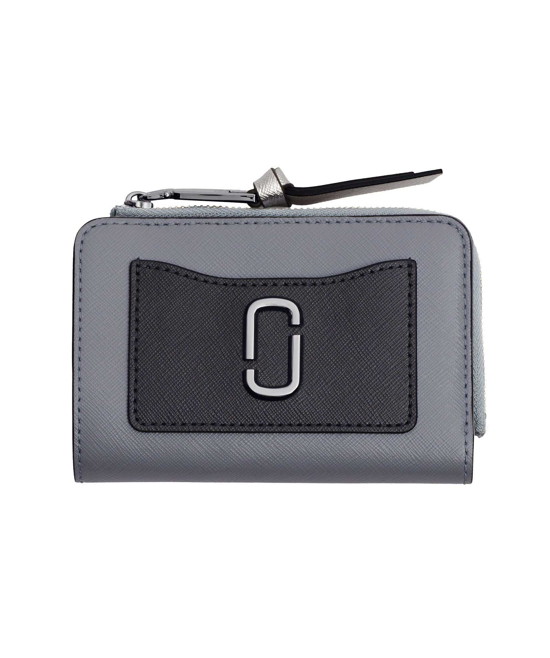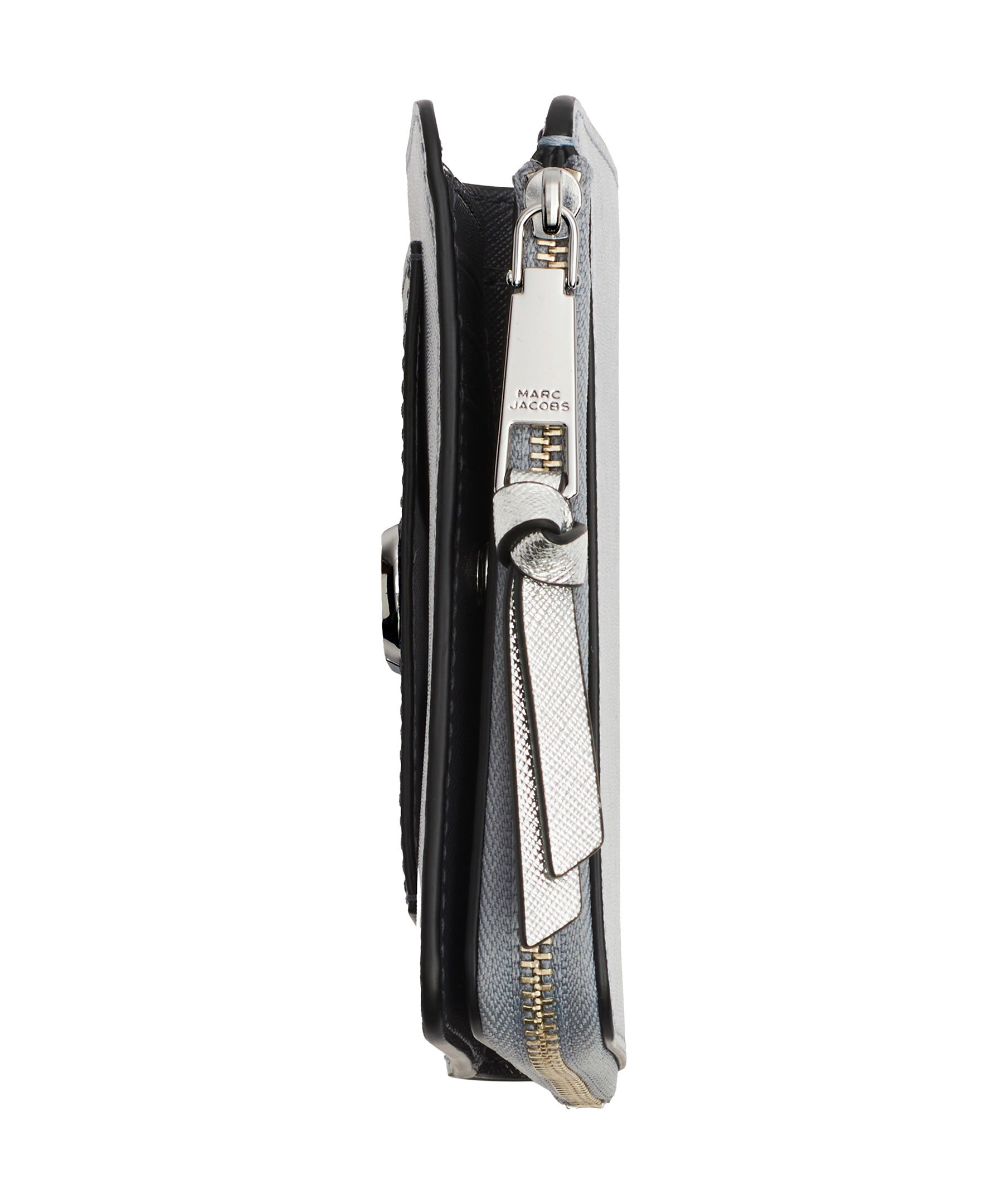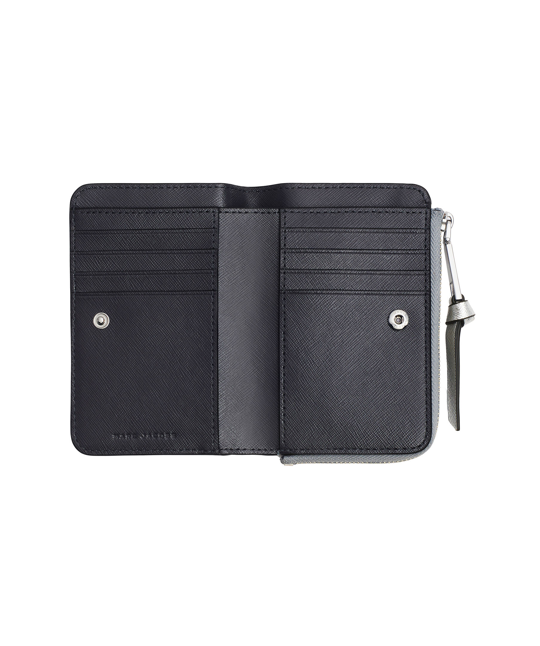 Grå och svart plånbok från Marc Jacobs. Inspirerad av design-DNA från vår ikoniska Snapshot, är denna plånbok tillverkad i Saffiano-läder med en J Marc framtill. Den innehåller en främre glidficka, åtta kortplatser, ett sedelfodral, två invändiga glidfickor och en myntficka.
