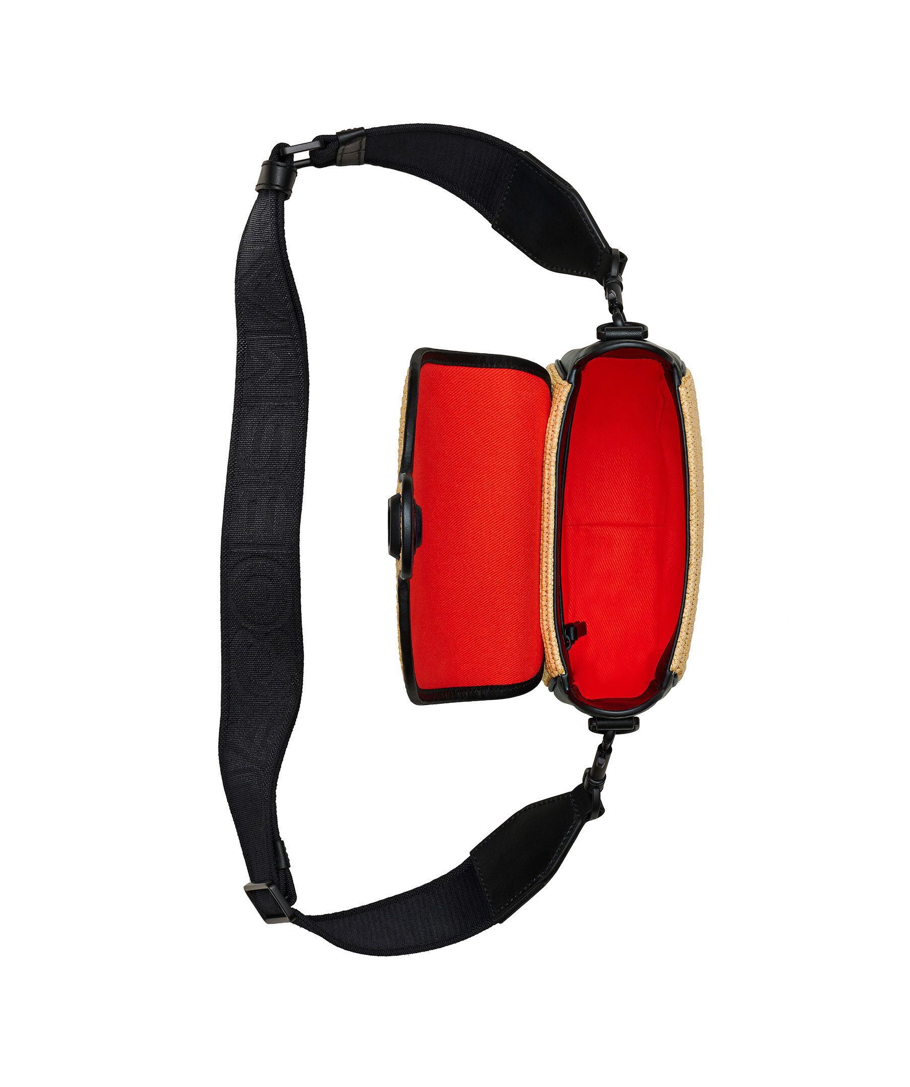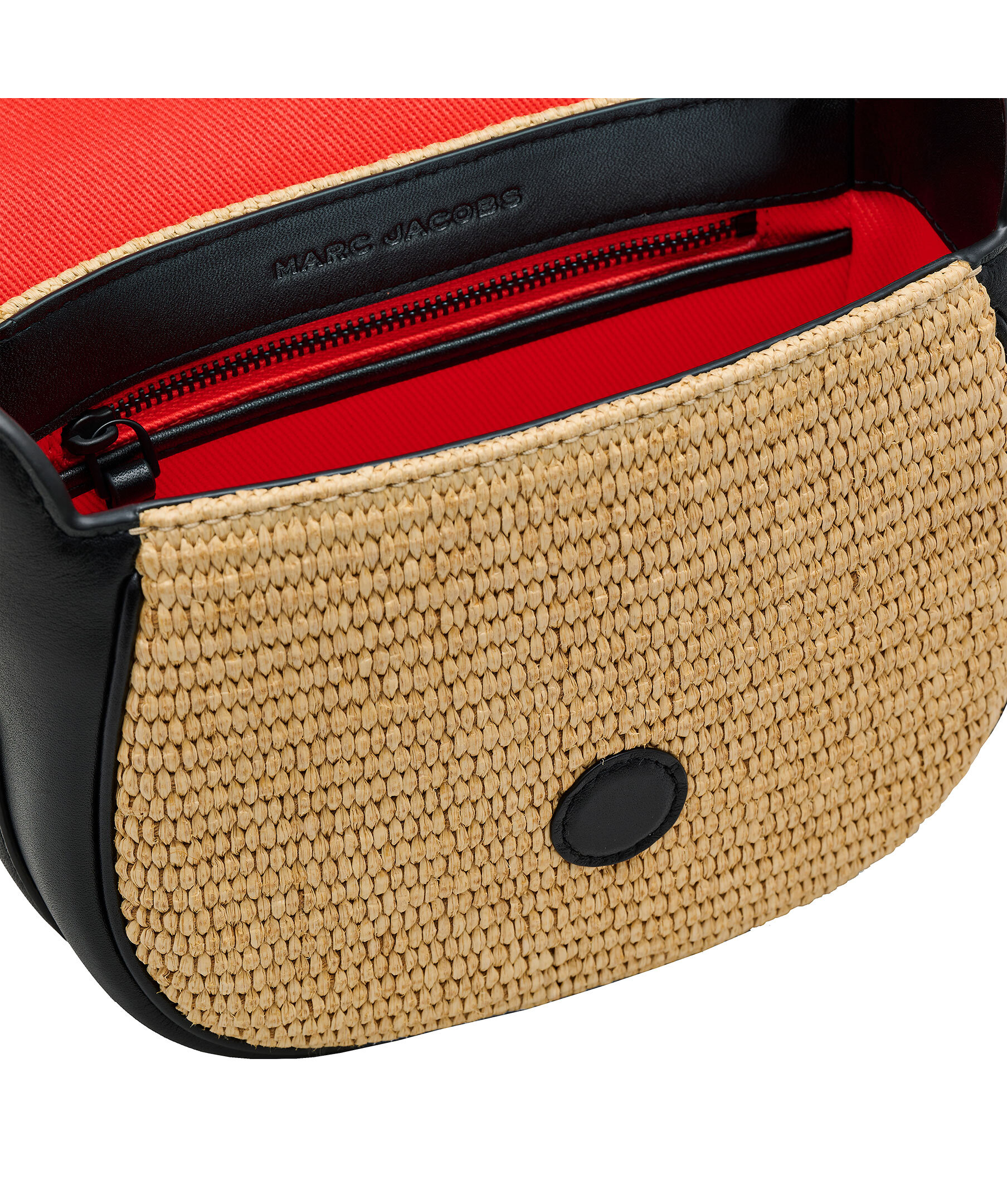 Svart och beige handväska från Marc Jacobs. Lock som stängs med magnetlås. Tillverkad i svart läder och beige raffia. Justerbar och avtagbar axelrem med logotyp. En slip-ficka och en dragkedjeficka på insidan. Röd insida. Väskans mått: H:16cm L: 21cm D: 7cm.