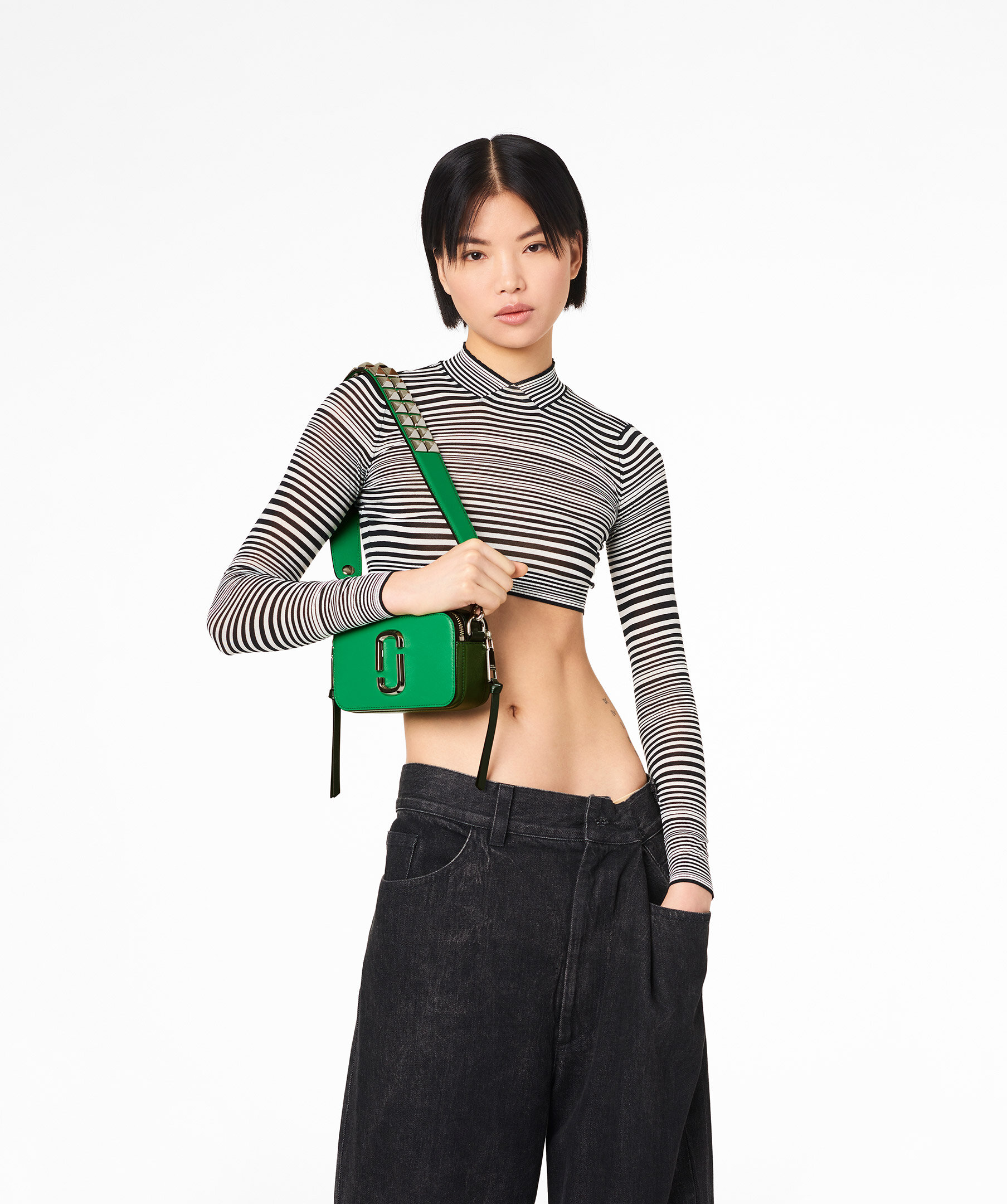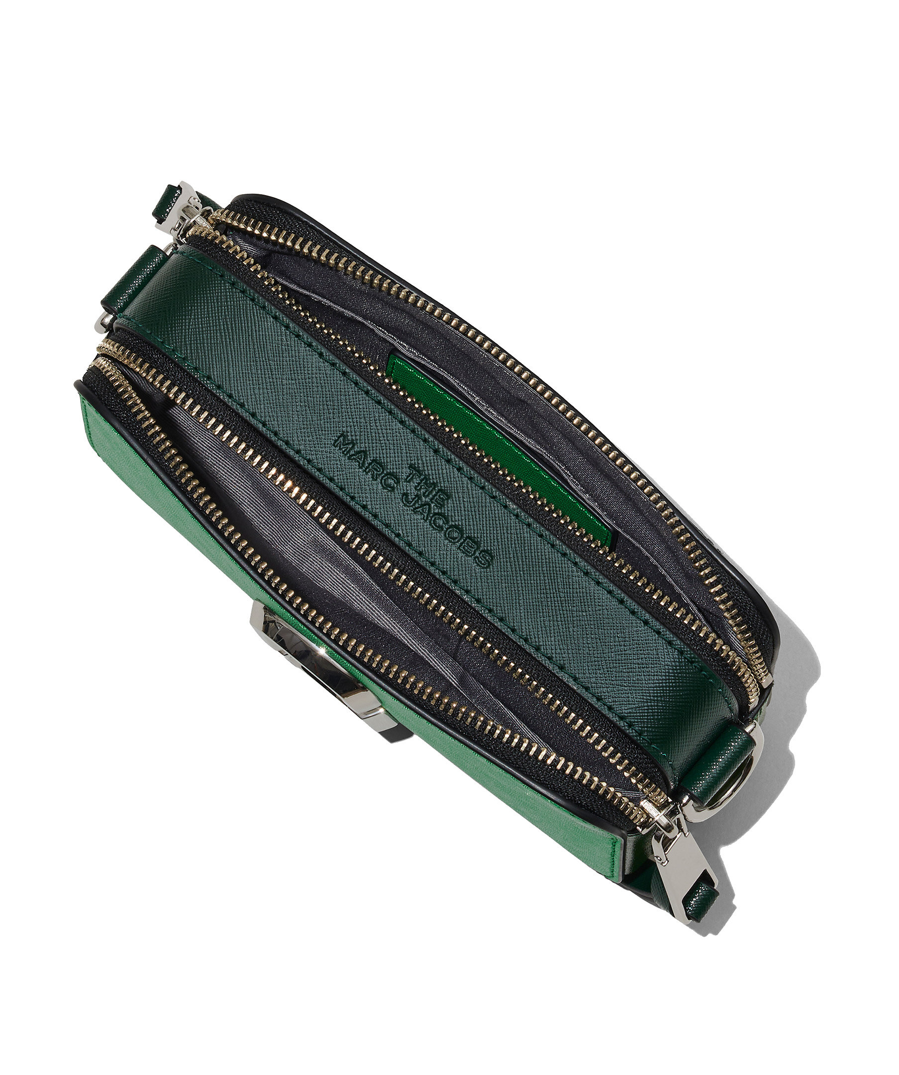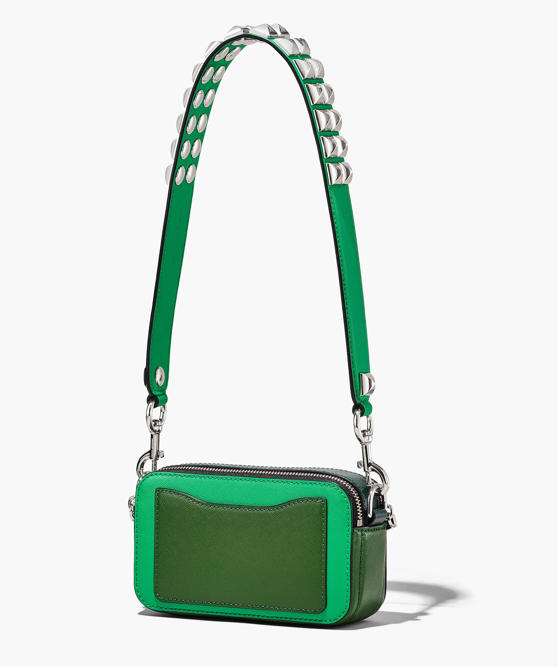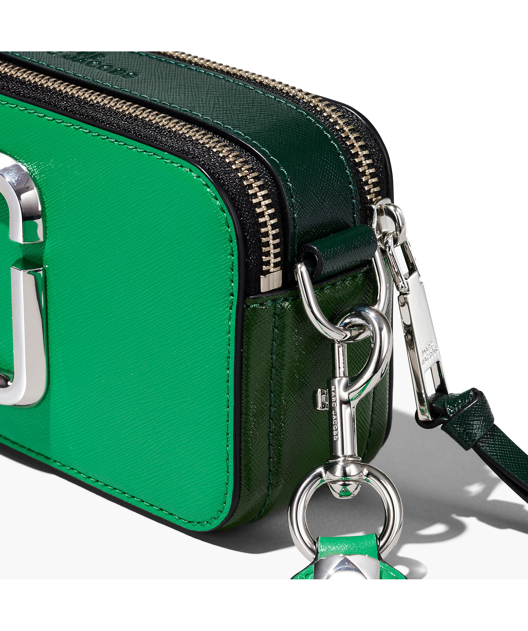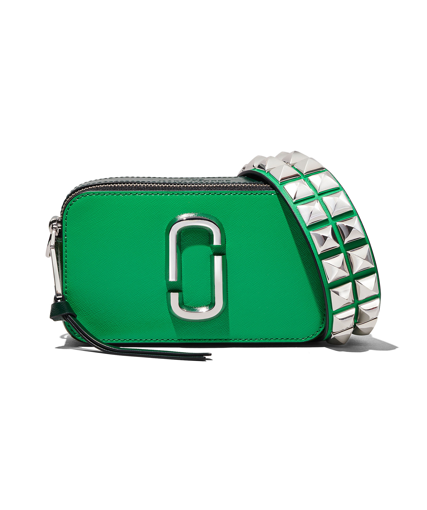 Grön, liten handväska från Marc Jacobs med detaljer i mörkgrönt. Camera bag stil, tillverkad i saffianoläder och har ett avtagbart axelband som är grönt med silverfärgade, fyrkantiga nitar. Två fack med silverfärgad dragkedja och en ficka på insidan samt en ytterficka bak. Stor silverfärgad logga i metall fram. Djup: 6 cm Höjd: 11 cm Bredd: 19 cm. Axelband: 5 cm bred, 65 cm lång, utan spänne, ca 80 cm med spänne.