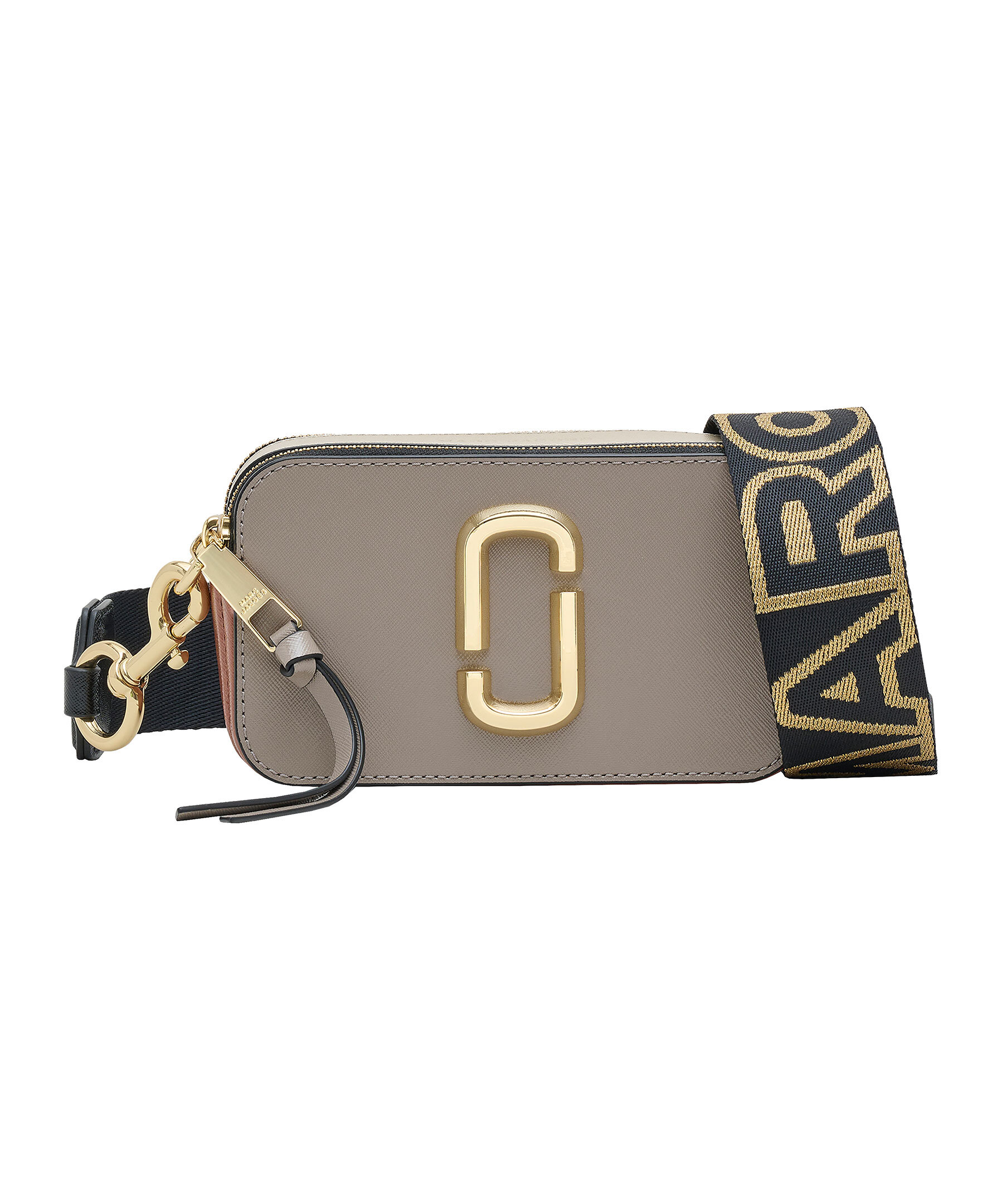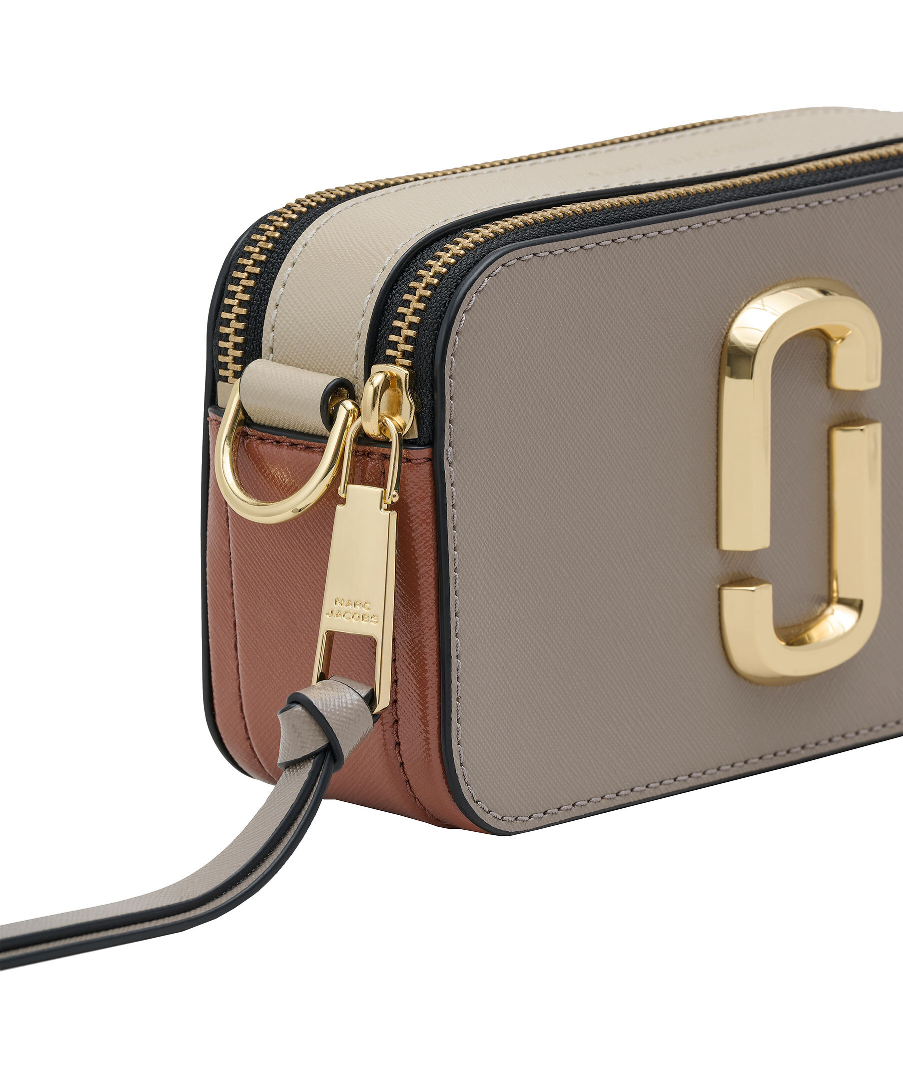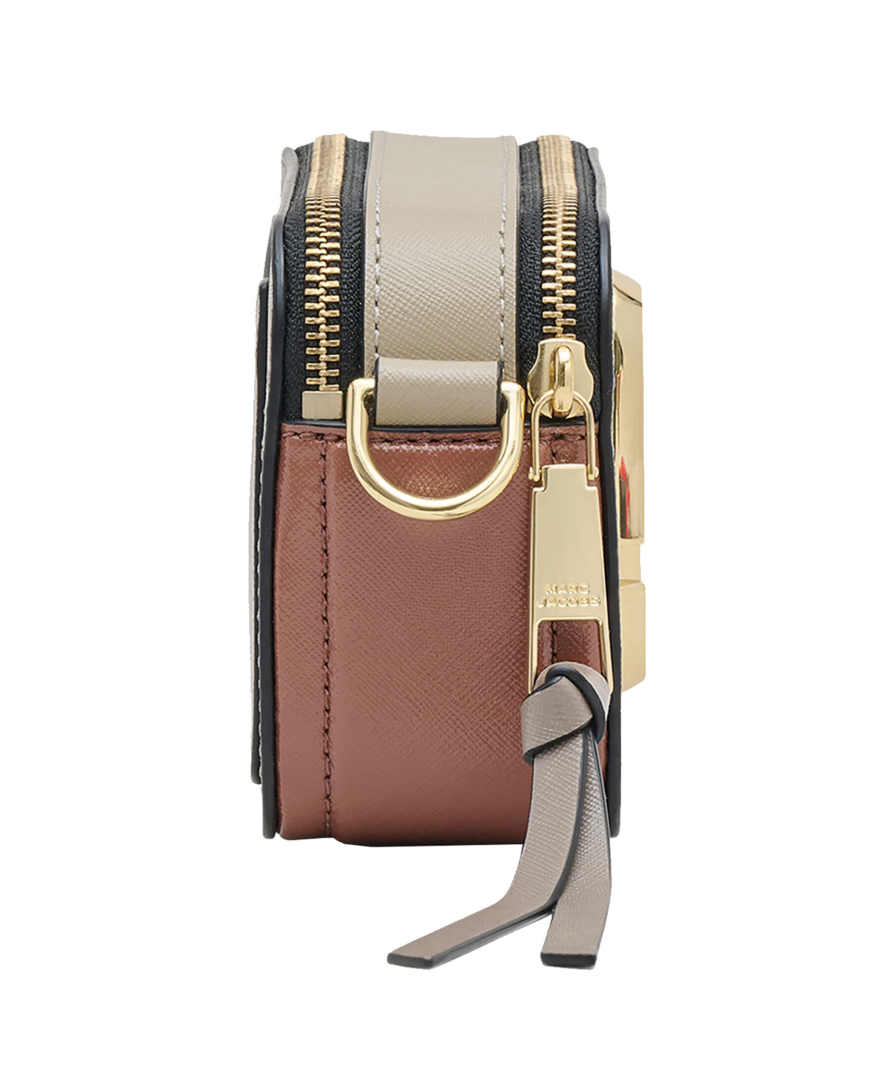 Taupefärgad handväska med brunt kontrasttyg på sidorna från Marc Jacobs. Camera bag stil, saffiano läder, justerbart axelband i svart med guldfärgad logotyp. Två fack med dragkedja, en ytterficka. Guldfärgade detaljer.