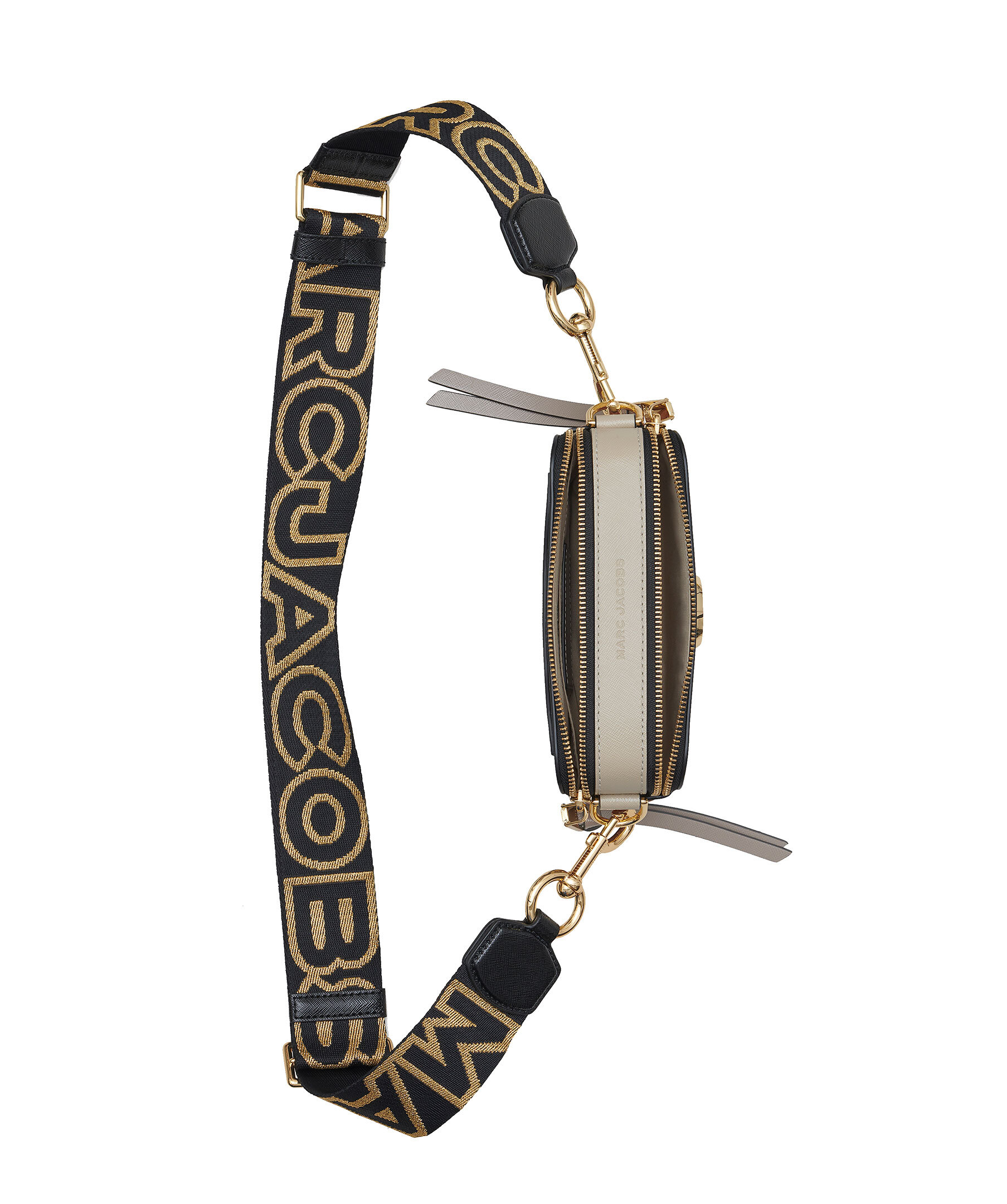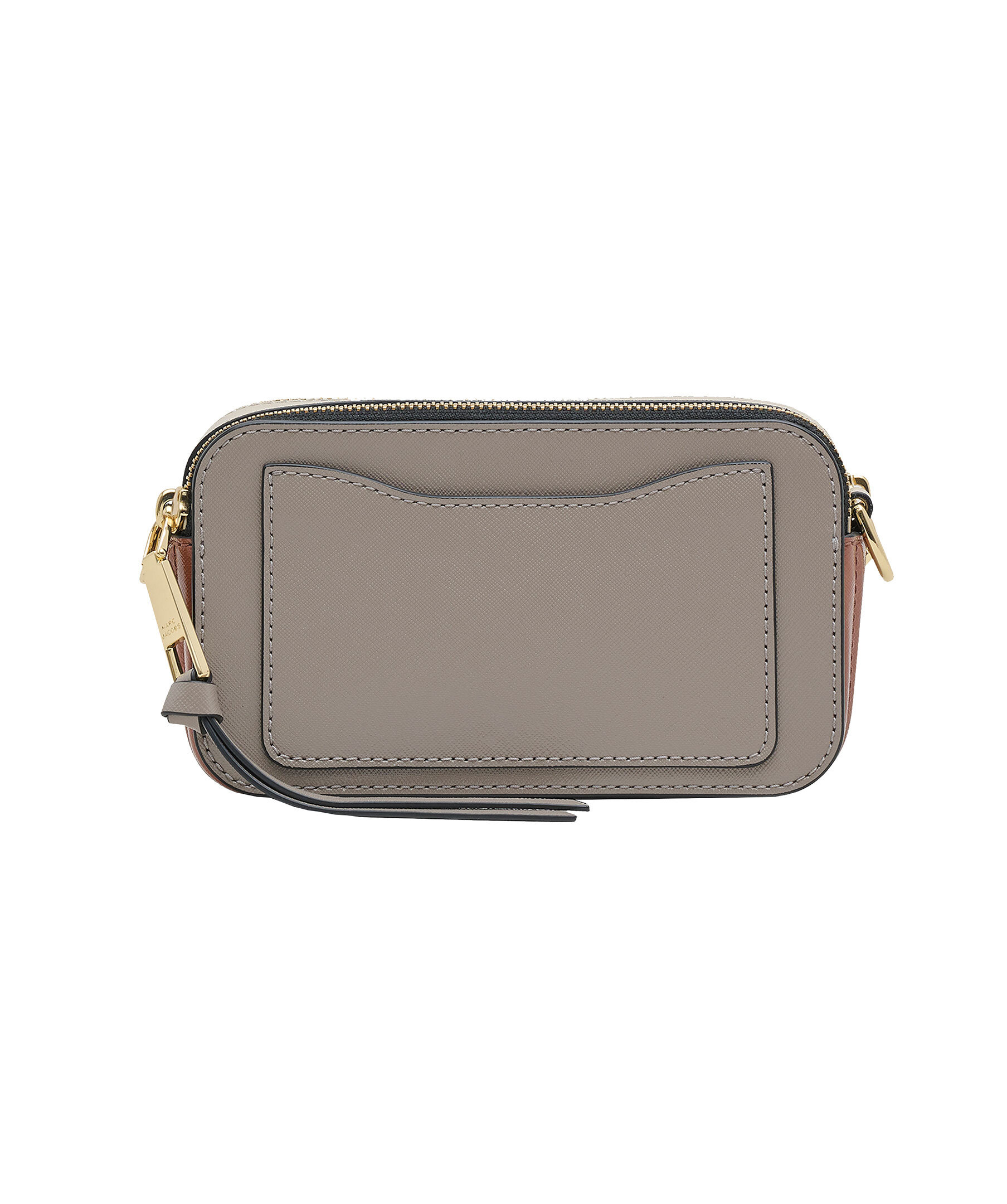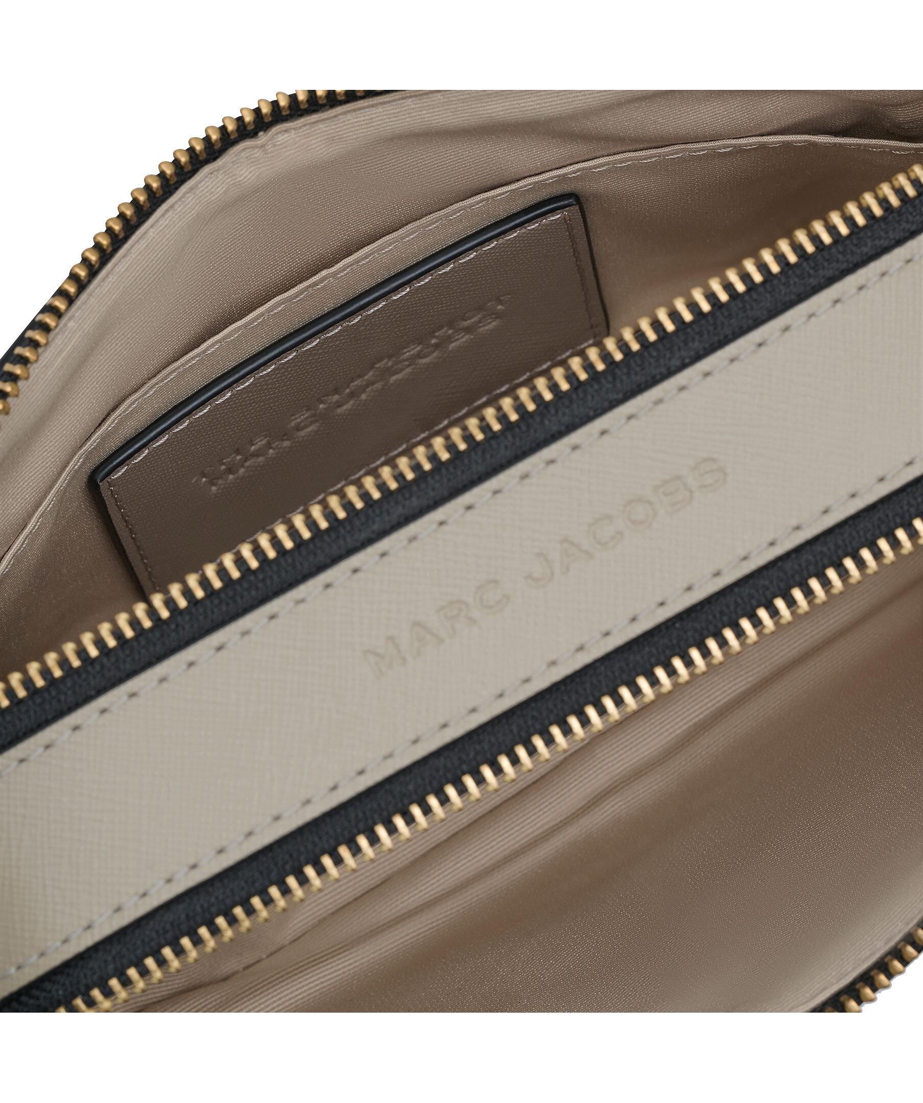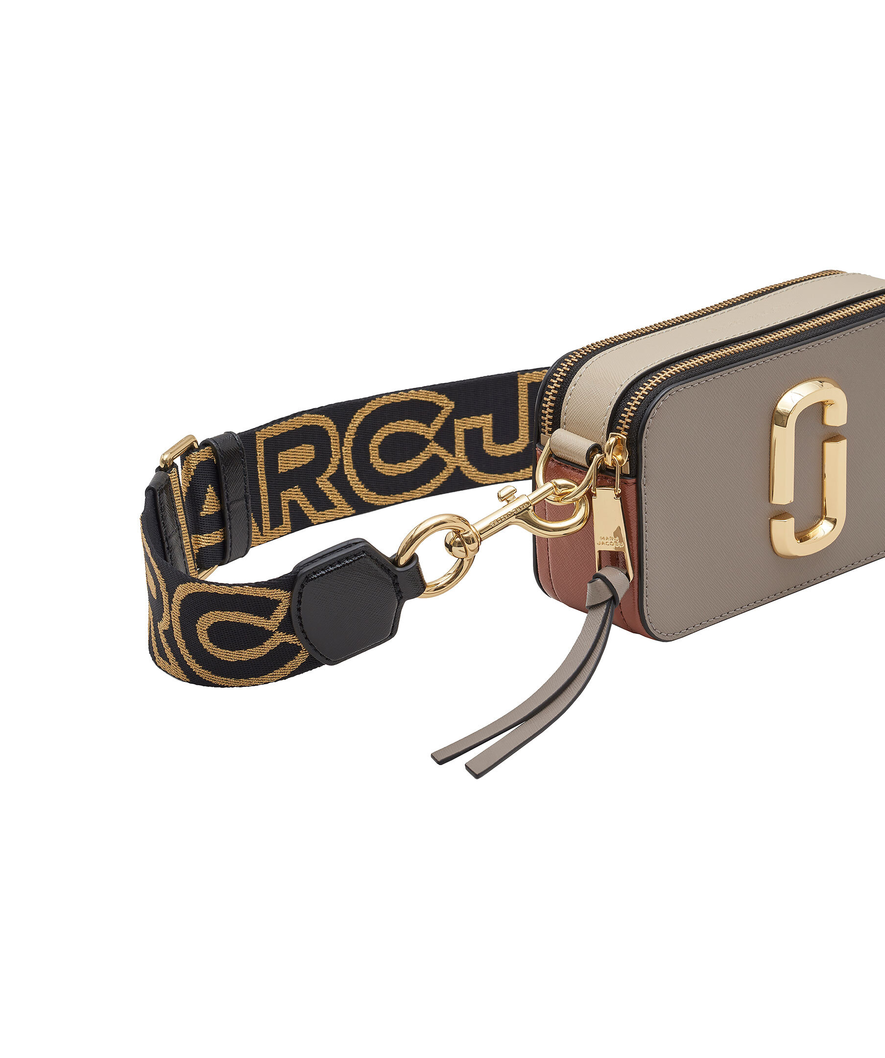 Taupefärgad handväska med brunt kontrasttyg på sidorna från Marc Jacobs. Camera bag stil, saffiano läder, justerbart axelband i svart med guldfärgad logotyp. Två fack med dragkedja, en ytterficka. Guldfärgade detaljer.