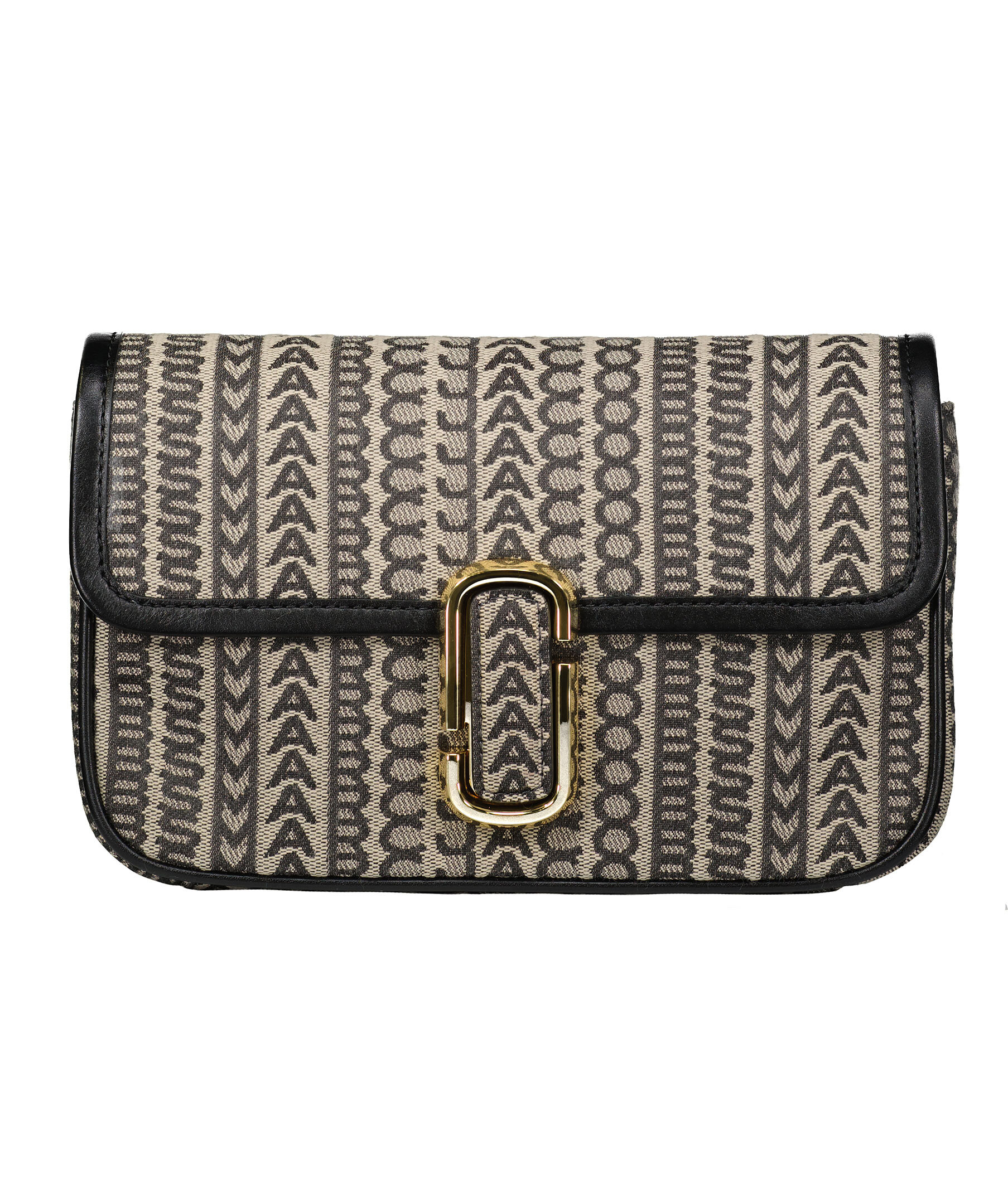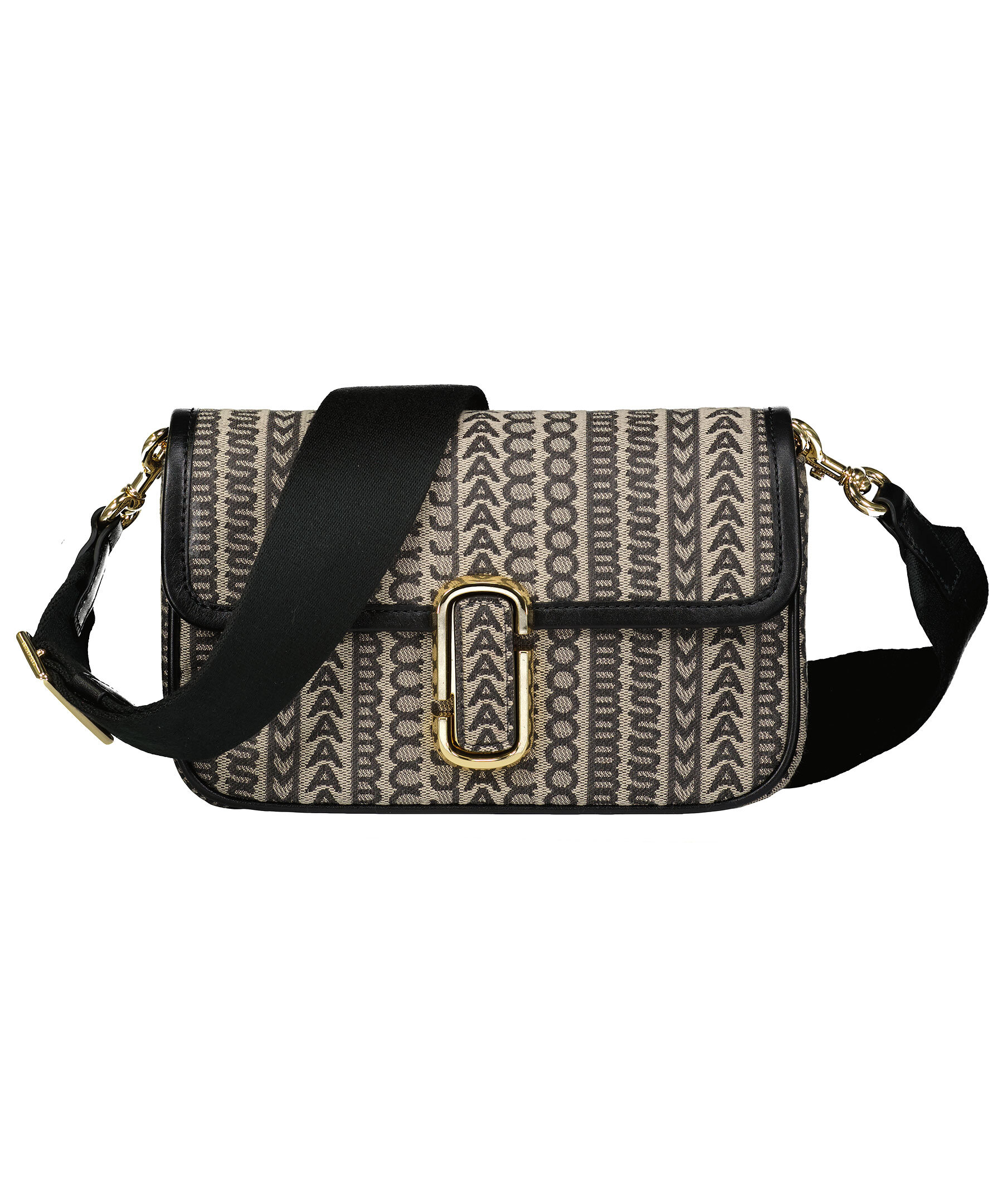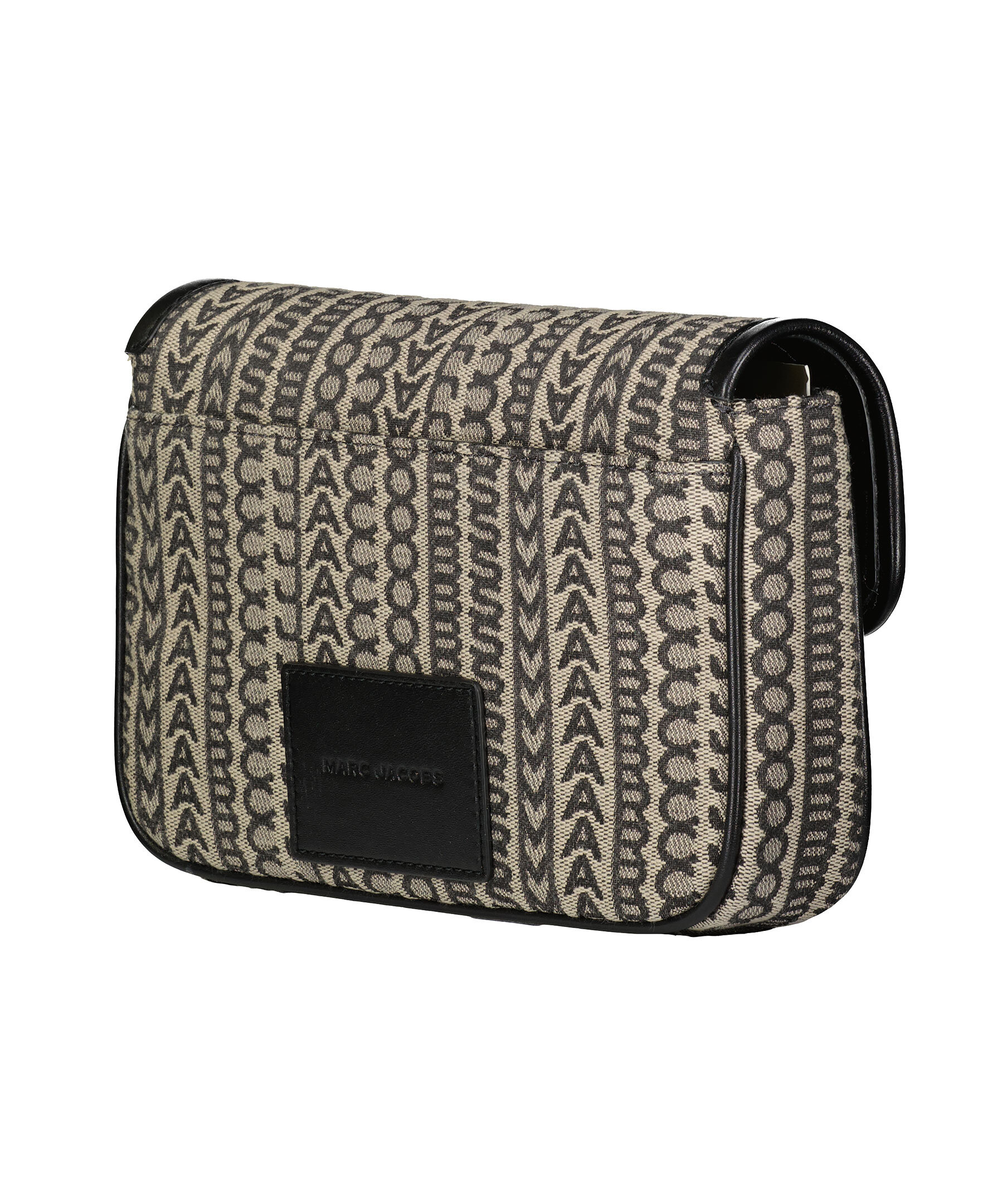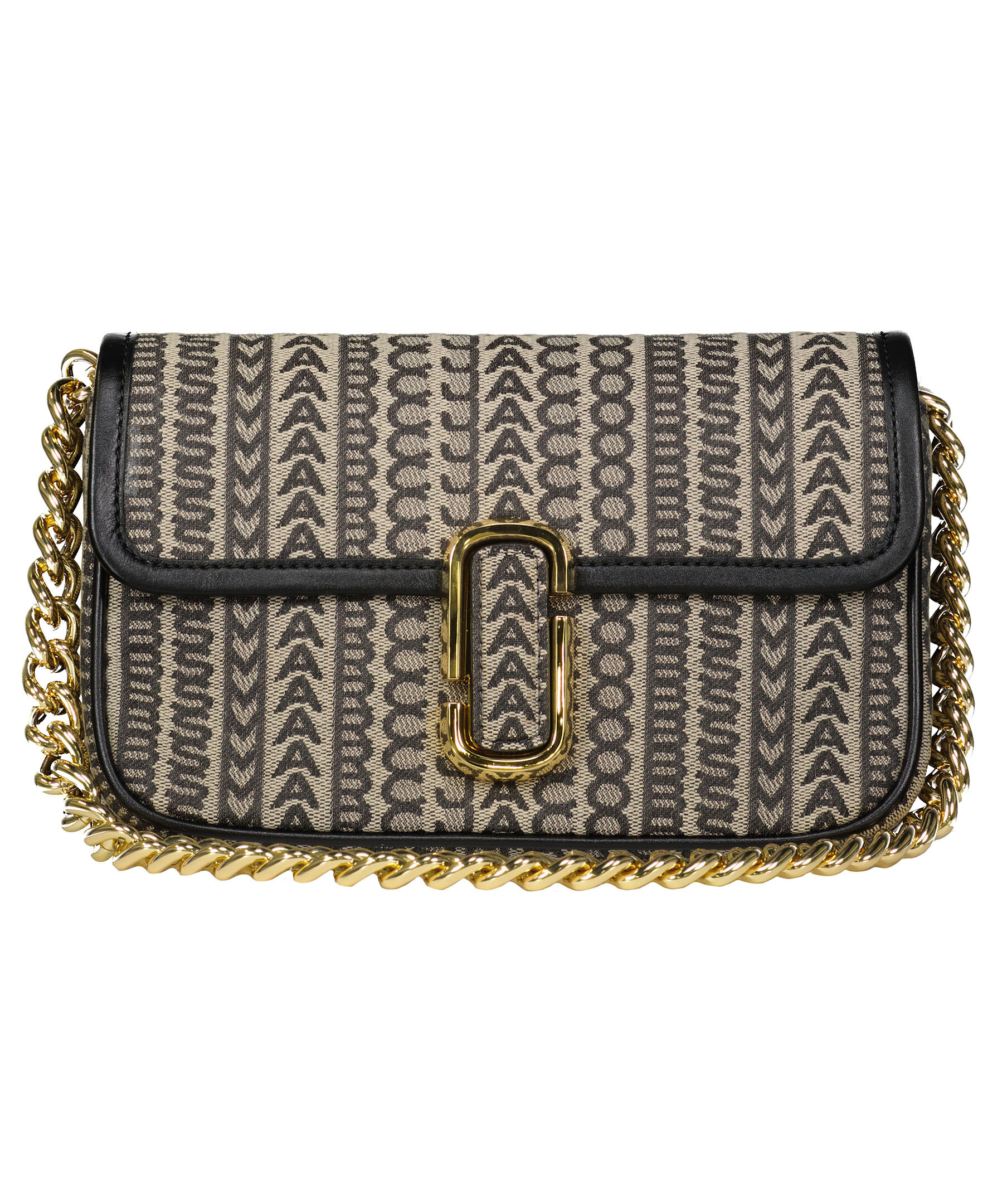 Svart och beige monogram mönstrad väska från Marc Jacobs. Långt axelband i textil med logotyp samt kort handtag i guldfärgad kedja. Guldfärgad logotyp fram, magnetstängning, två invändiga fickor. Dustbag medföljer. 25 x 5 x 16 cm