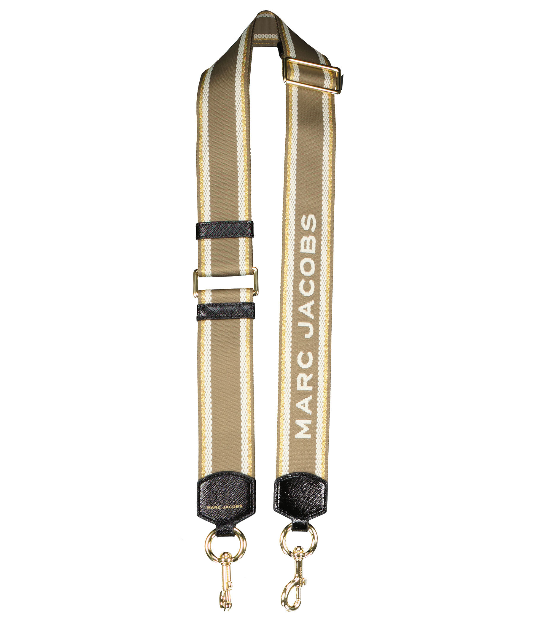 Grönbeige, vit och guldfärgat justerbart vävd axelrem från Marc Jacobs. Med konstläder detaljer och guldfärgade spännen. 5 cm bred.