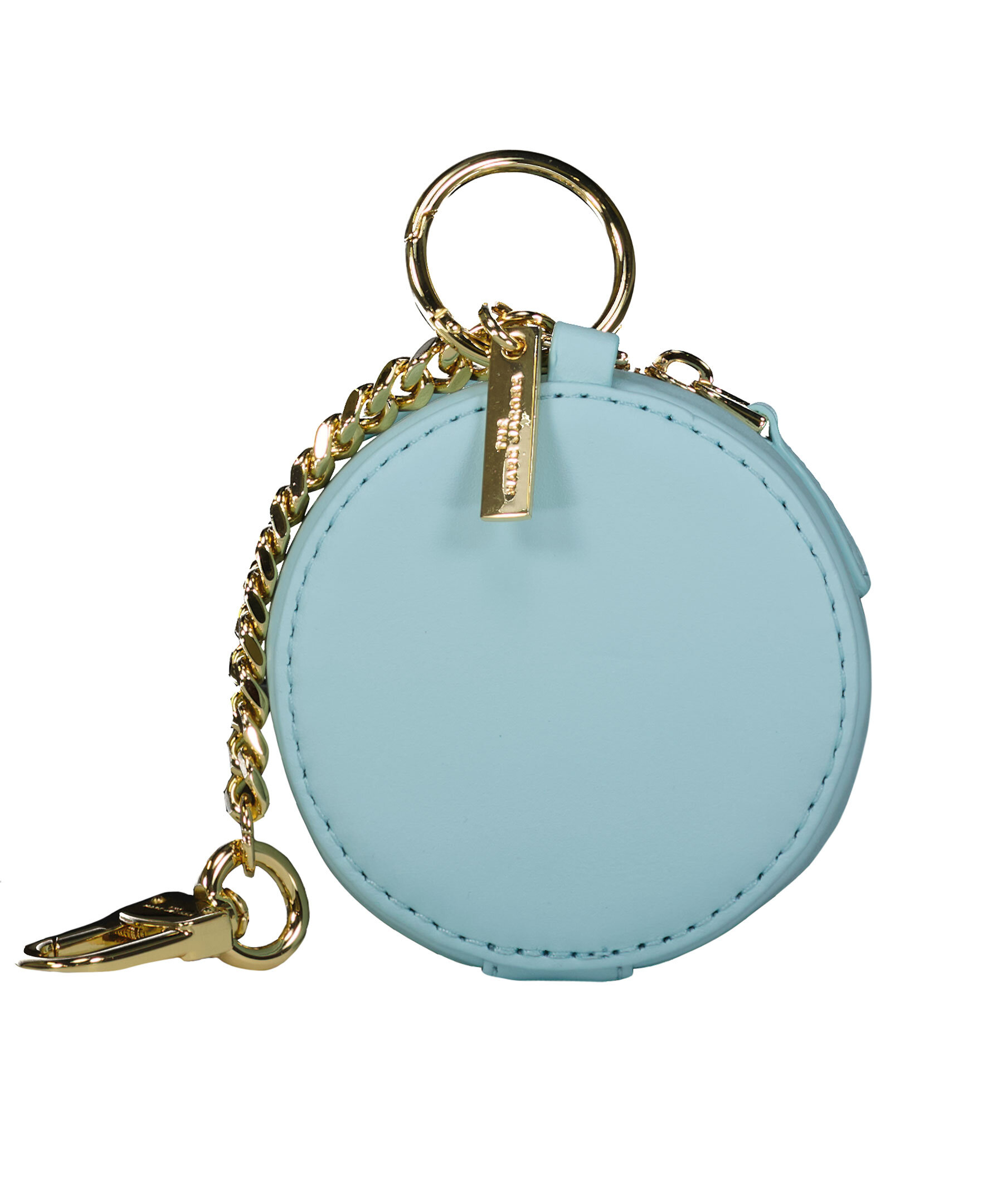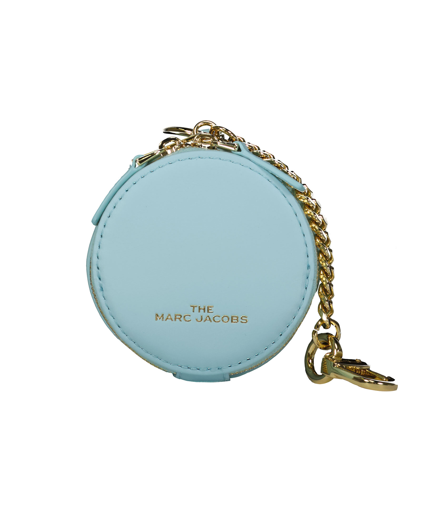 Ljusblått litet fodral från Marc Jacobs, för mynt eller hörlurar att hänga på din väska. Stängs med guldfärgad dragkedja. Fodralet kan fästas med antingen ring eller kedja med spänne, båda guldfärgade. Tryckt guldfärgad logotyp.