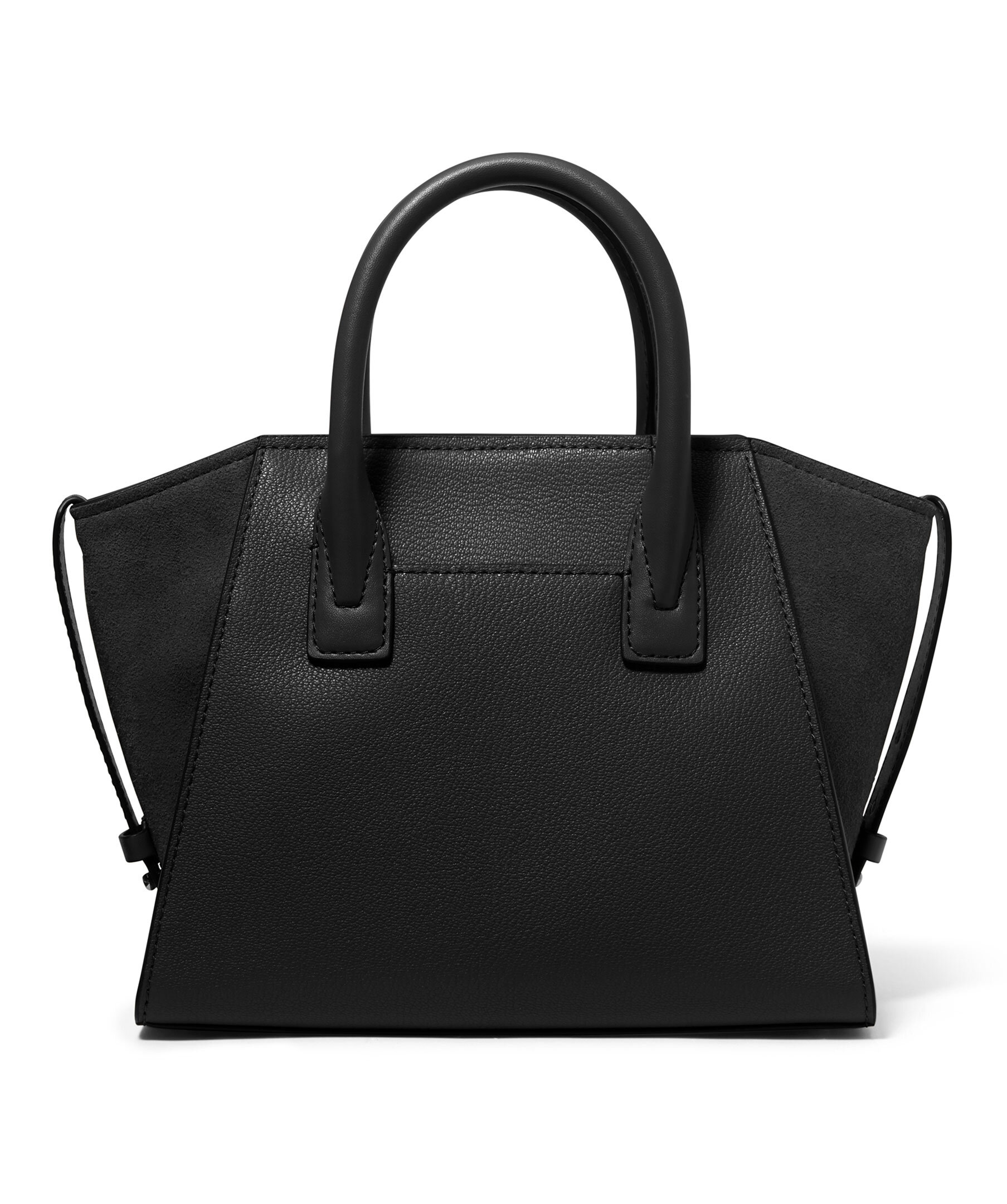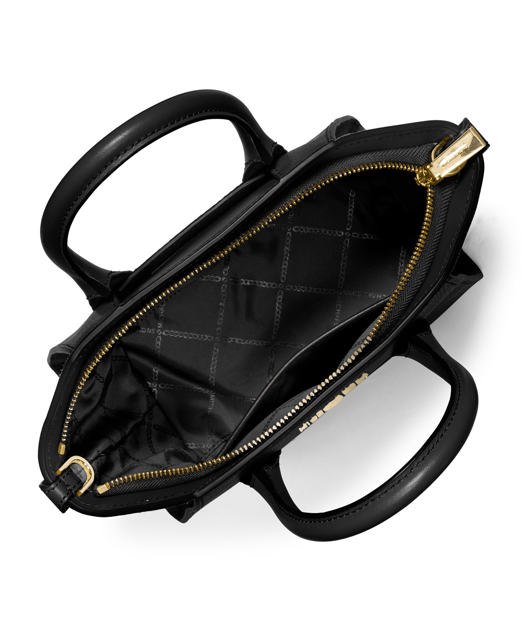 Svart väska i läder från Michael Kors. Avtagbar och justerbar crossbody-rem och handtag upptill samt öppnas med dragkedja upptill. Ficka på baksidan och en ficka på insidan. Guldfärgade detaljer och ett foder i polyester. Logotyp i guldfärgad metall fram och ett hänge med en rund, lite större logotyp. Mått: 30 cm B x 20 cm H x 12 cm D. Handtag 15 cm.