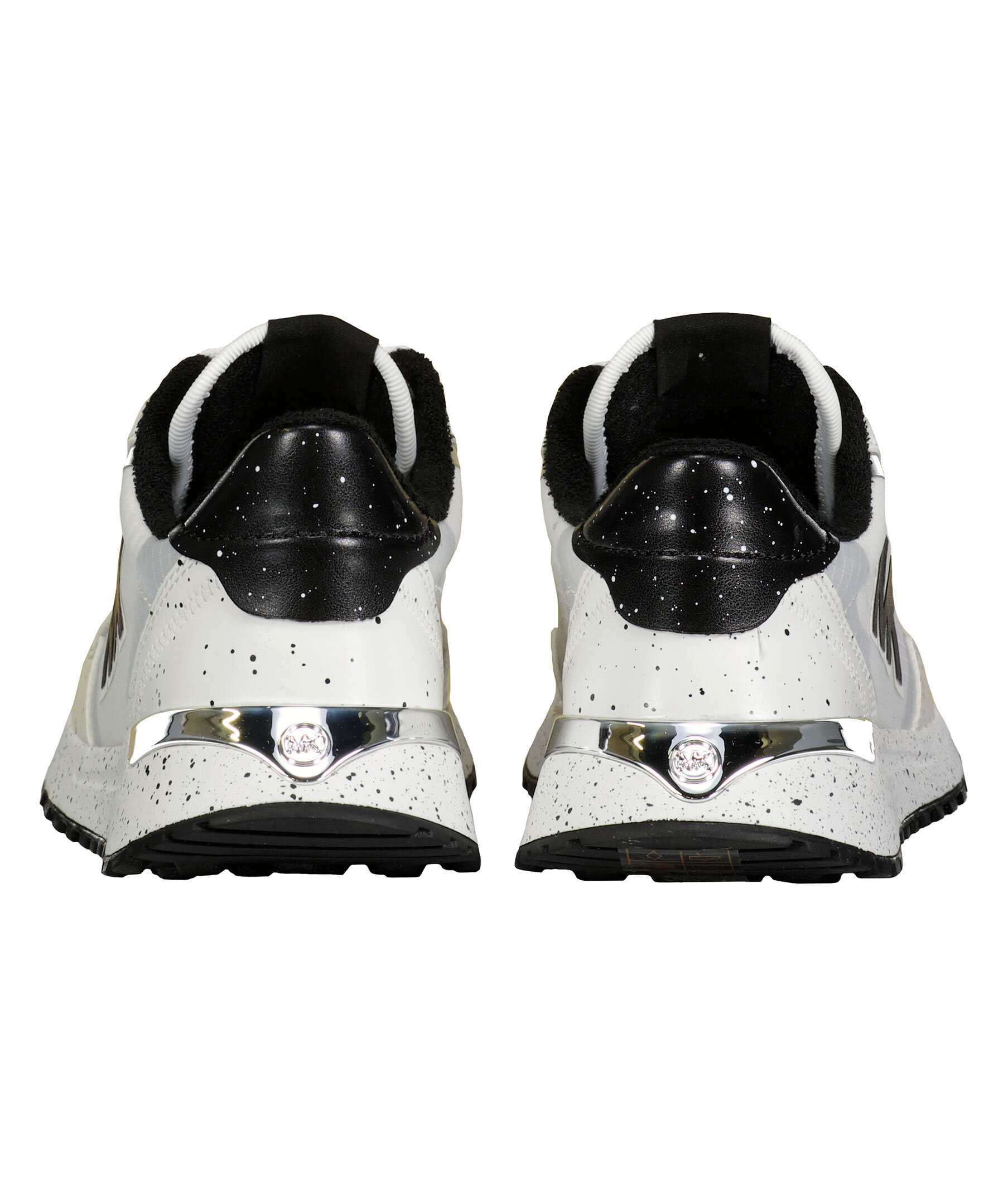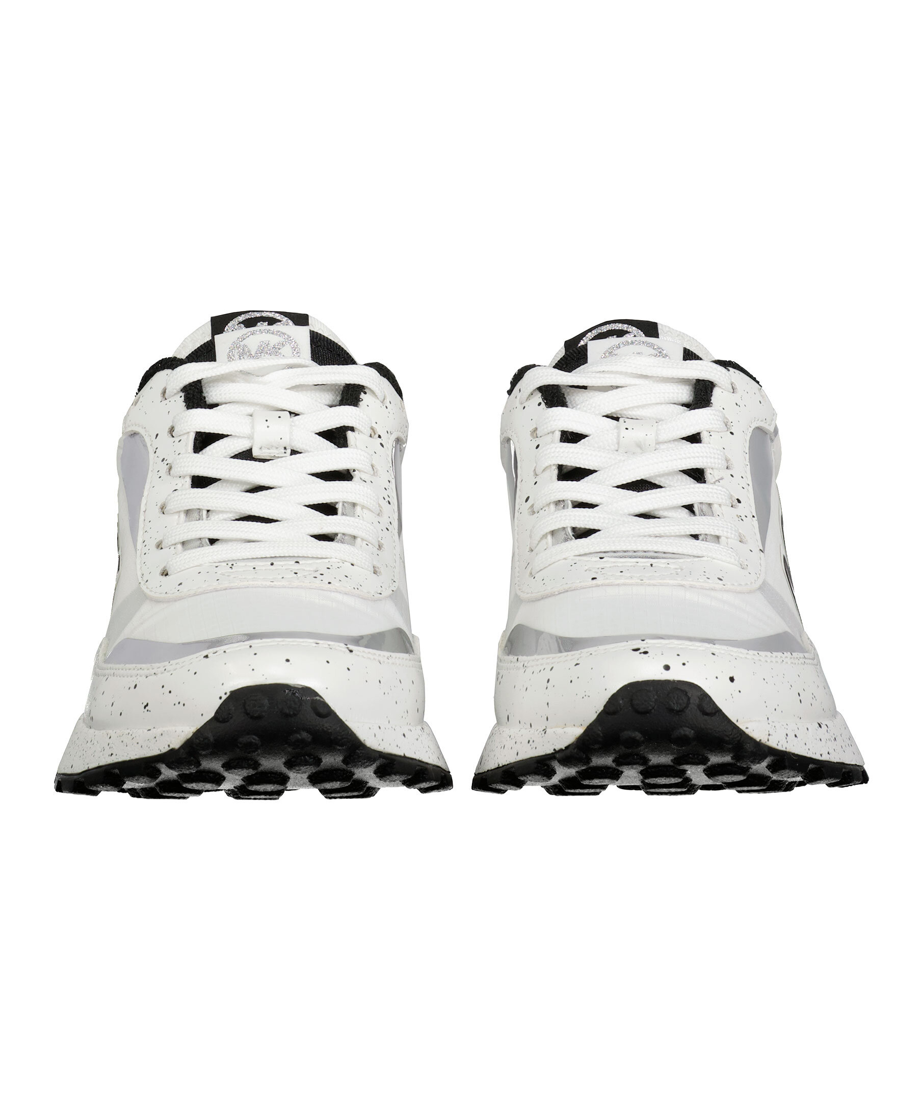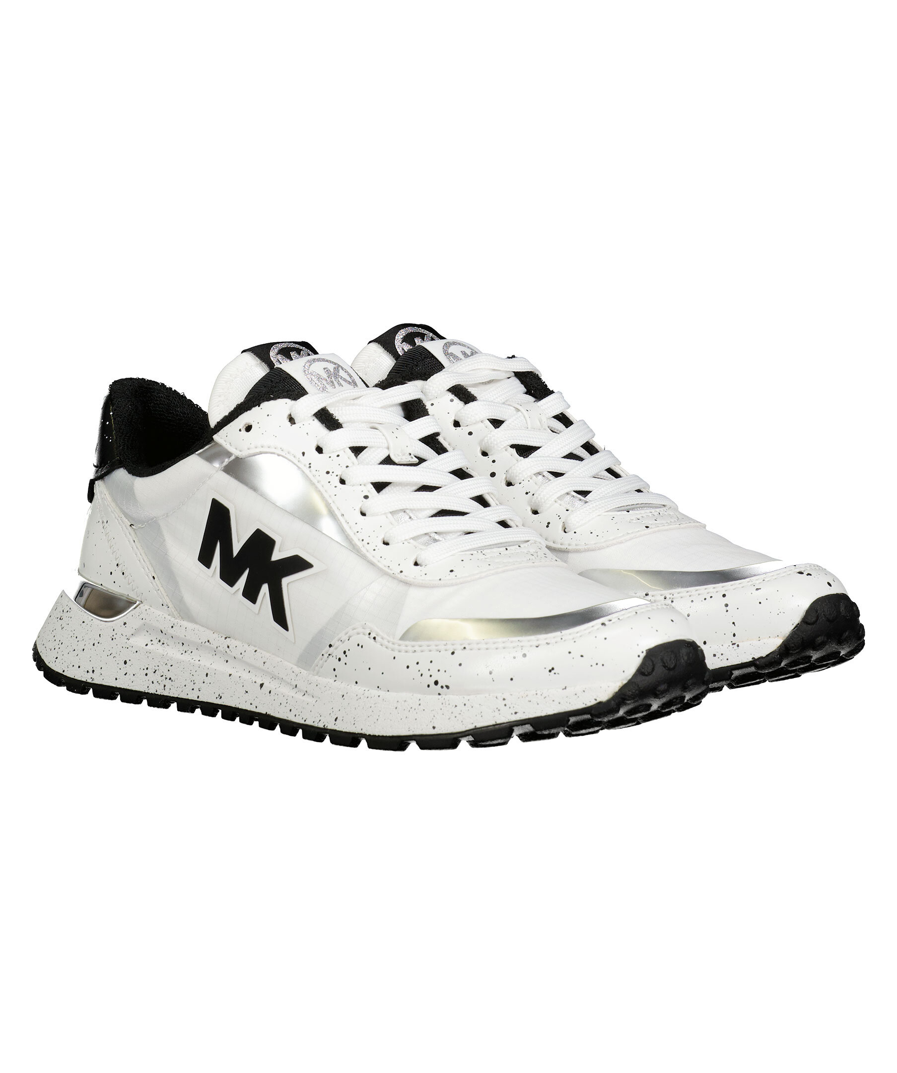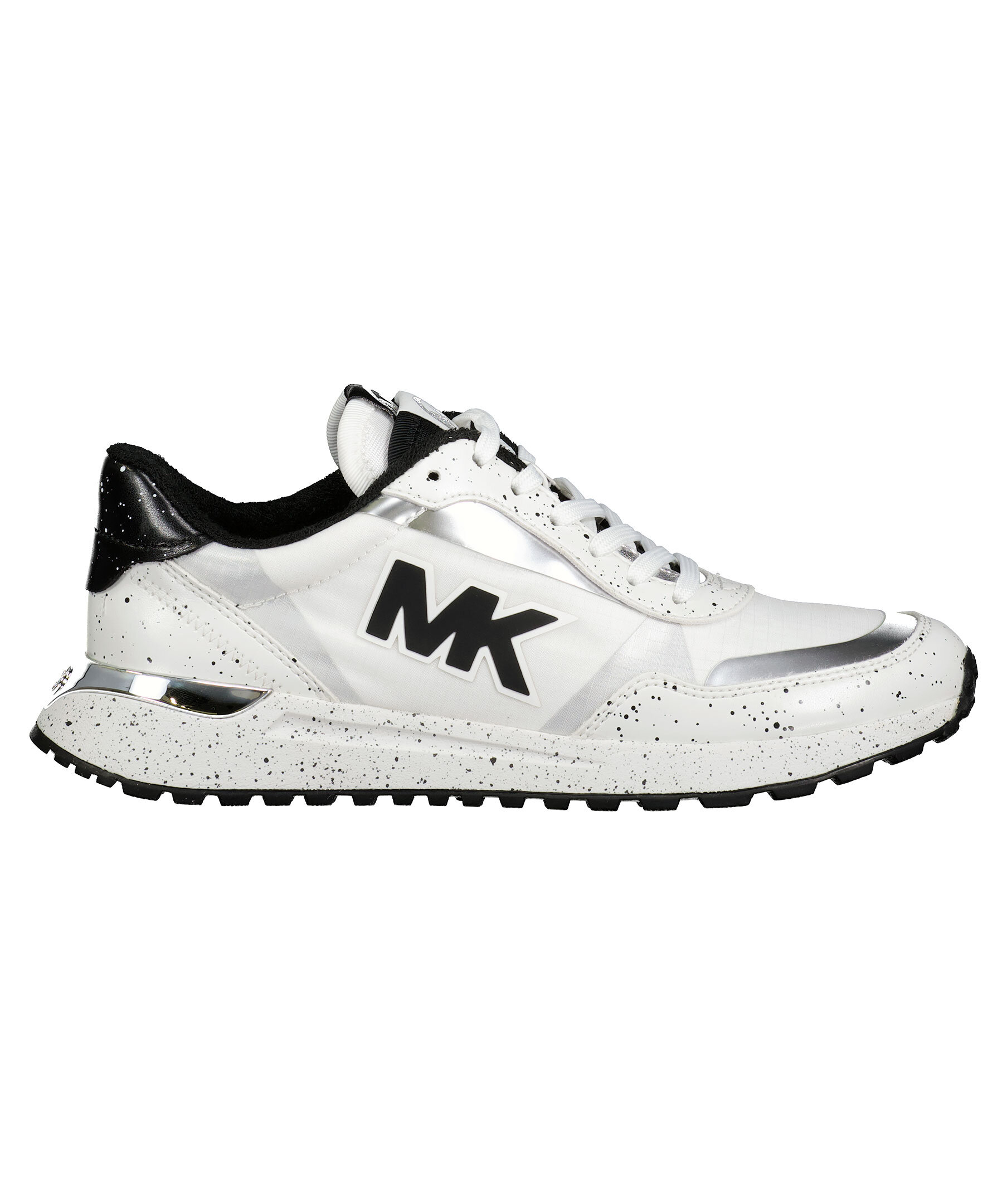 Vita sneakers i en vintage löparsko modell från Michael Kors. De är gjorda av nylon som andas och canvas med logotryck på sidan. Dämpande gummisulor, "MK"-initialer och metalldetaljer vid hälen och svarta färgstänk påsulan och detaljer kring snörningen. Dubbla plösar, en vit och en kortare svart, båda med patch med silverfärgad logotyp på och vit snörning.
