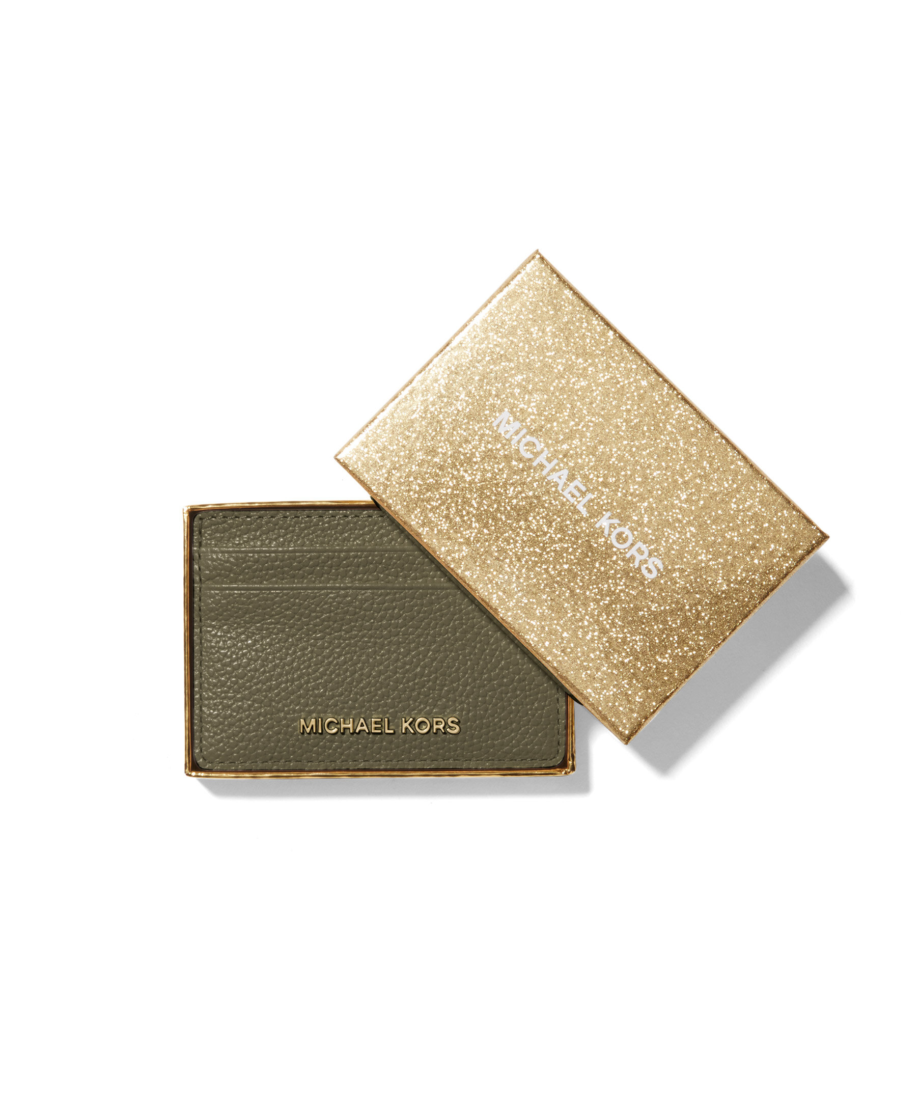 Olivgrön korthållare från Michael Kors. Guldfärgad logotyp fram och har plats för två kontokort på varje sida samt mittenfack. Tillverkad i läder.