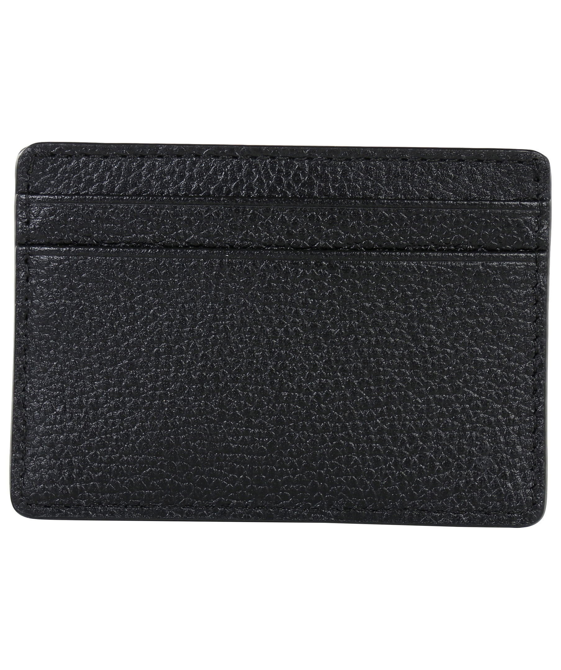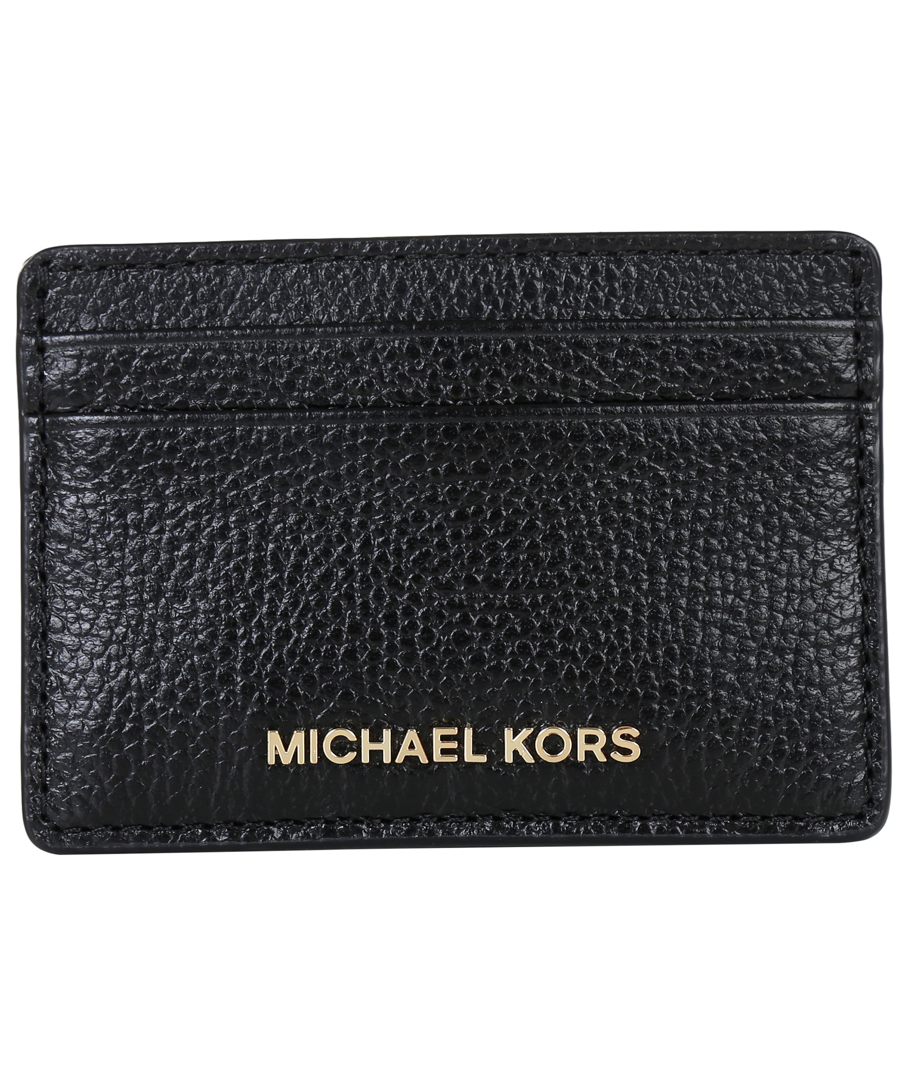 Svart korthållare i läder från Michael Kors. Plats för 2 kreditkort på varje sida och ett fack i mitten. Guldfärgad logotyp i metall på framsidan.
