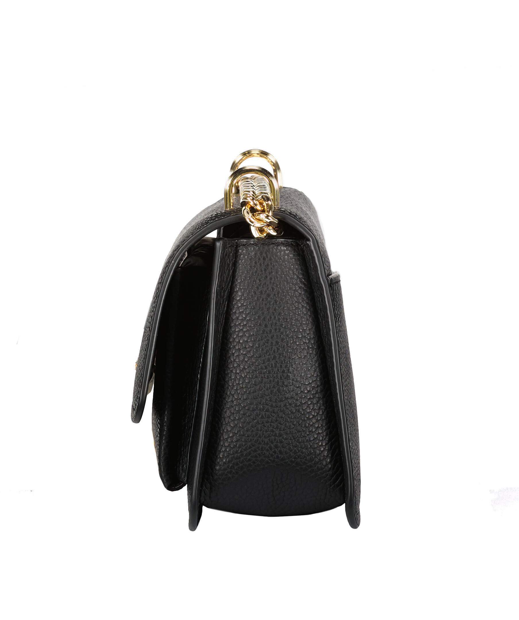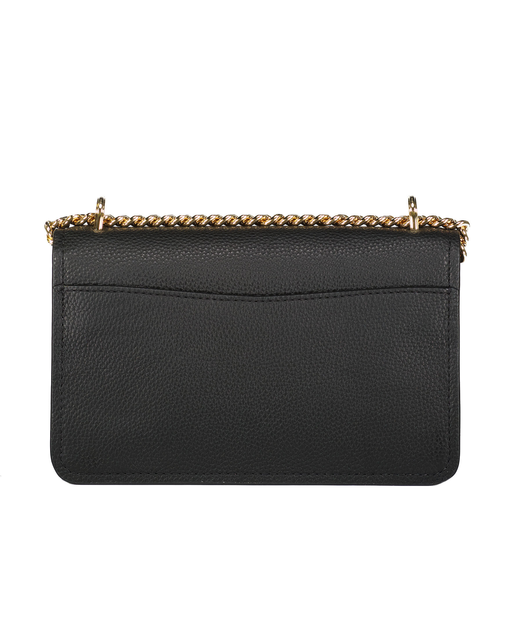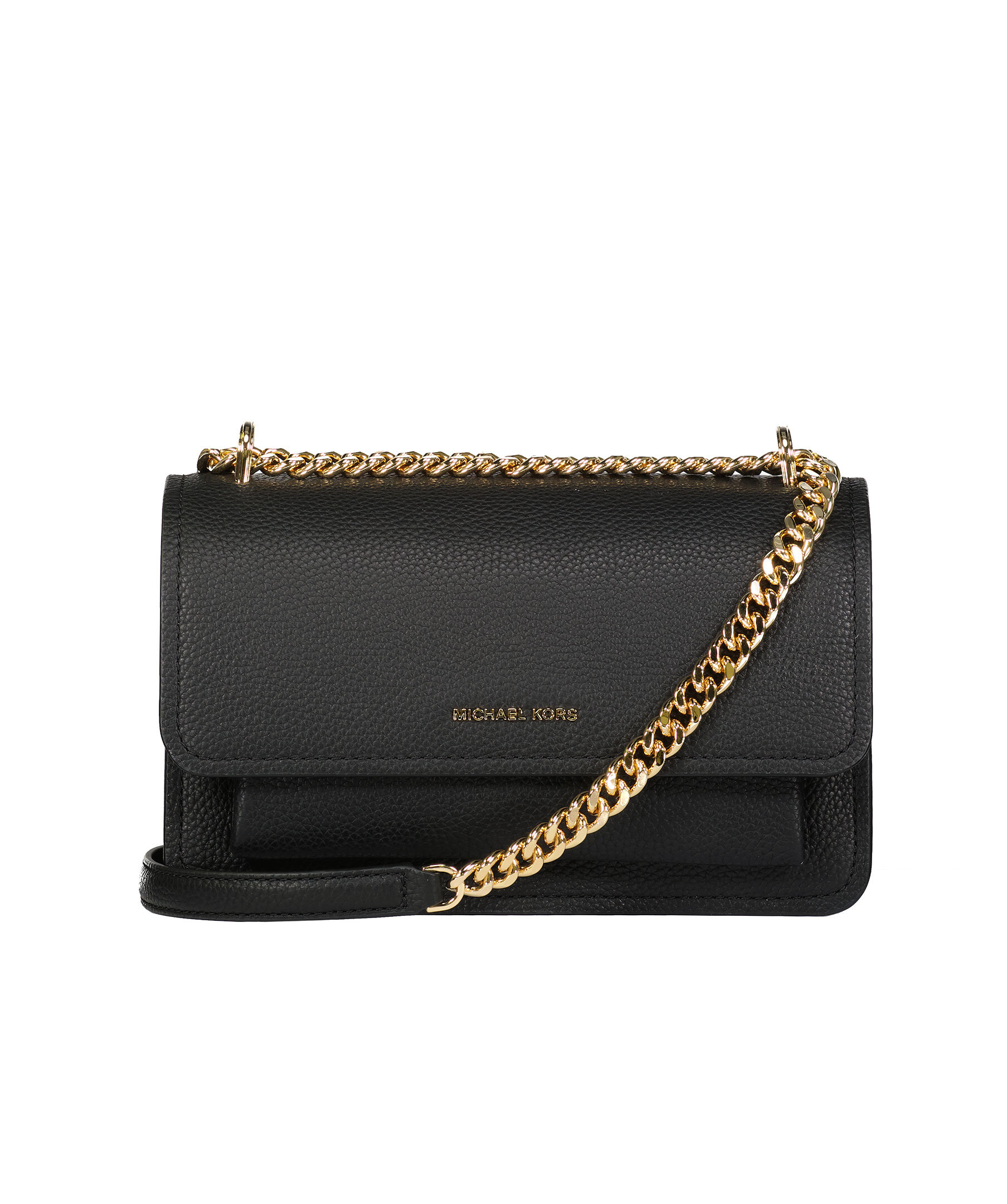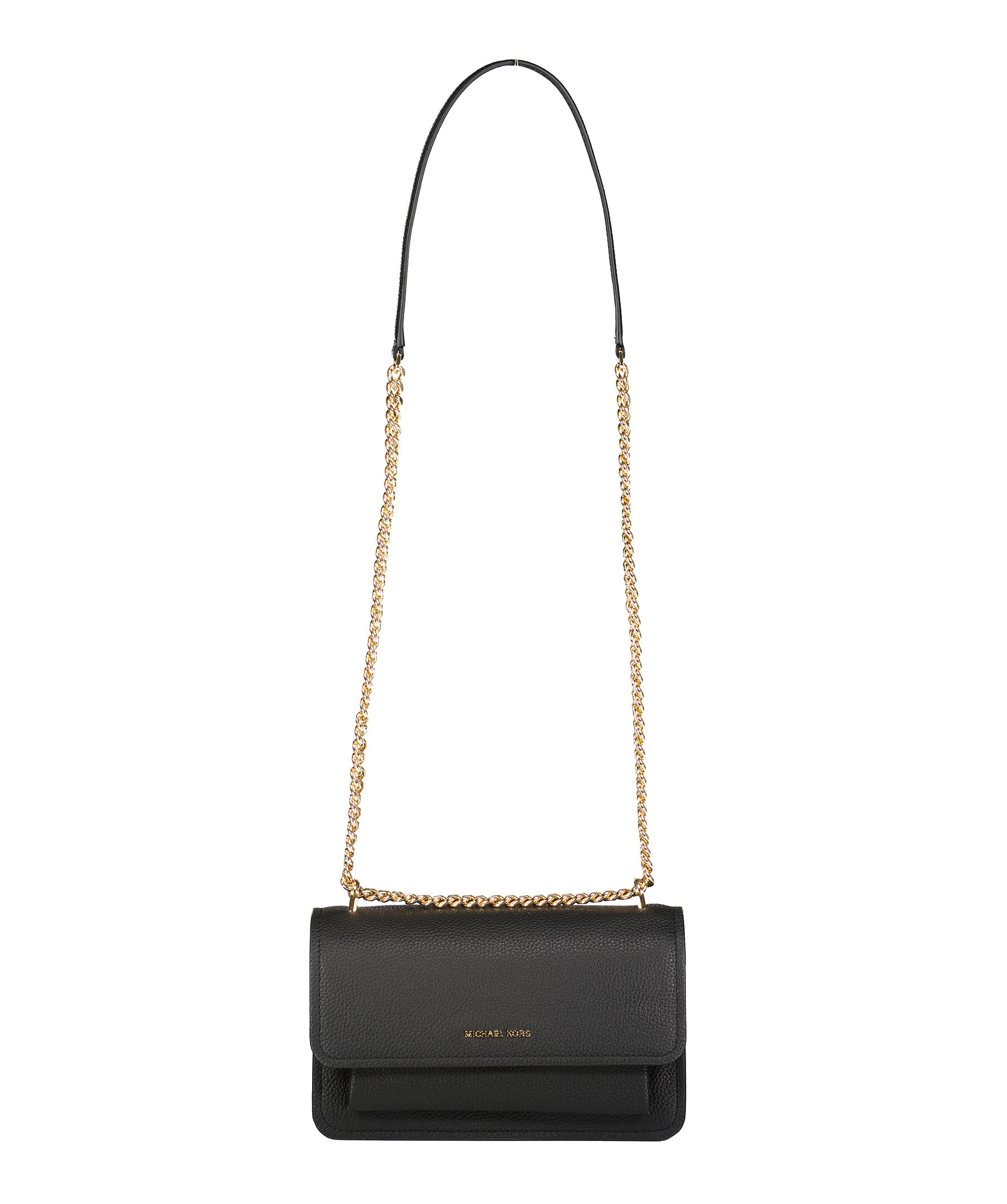 Svart handväska från Michael Kors. Väskan har magnetiskt knapplås, innerfack med blixtlås och guldfärgad loggotyp på framsidan. Guldfärgad axelbandskedja på 55,5 cm som löper över väskans rygg.