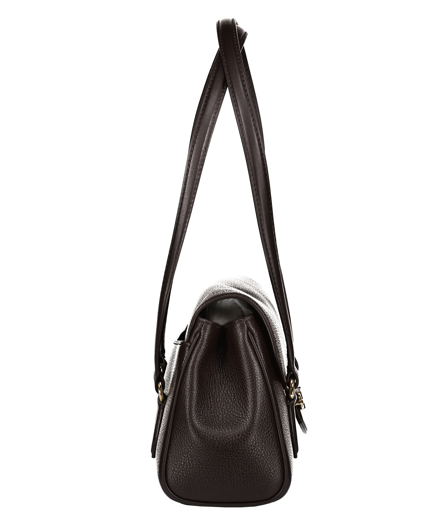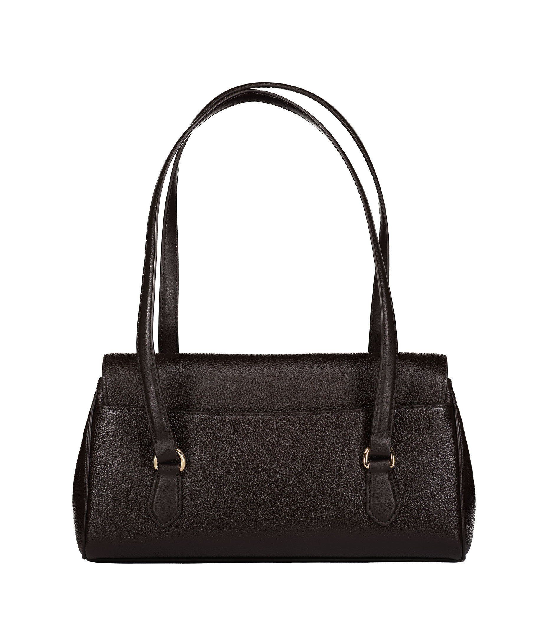 Chokladfärgad handväska från Michael Kors. Tillverkad med lyxigt stenigt läder och guldfärgad hårdvara, den har två öppna fack, en intern ficka med dragkedja och en extern ficka för alla dina förvaringsbehov. Snäppfästning.