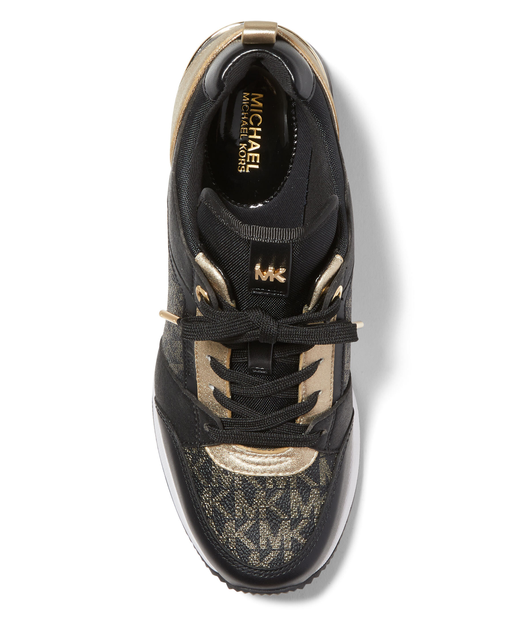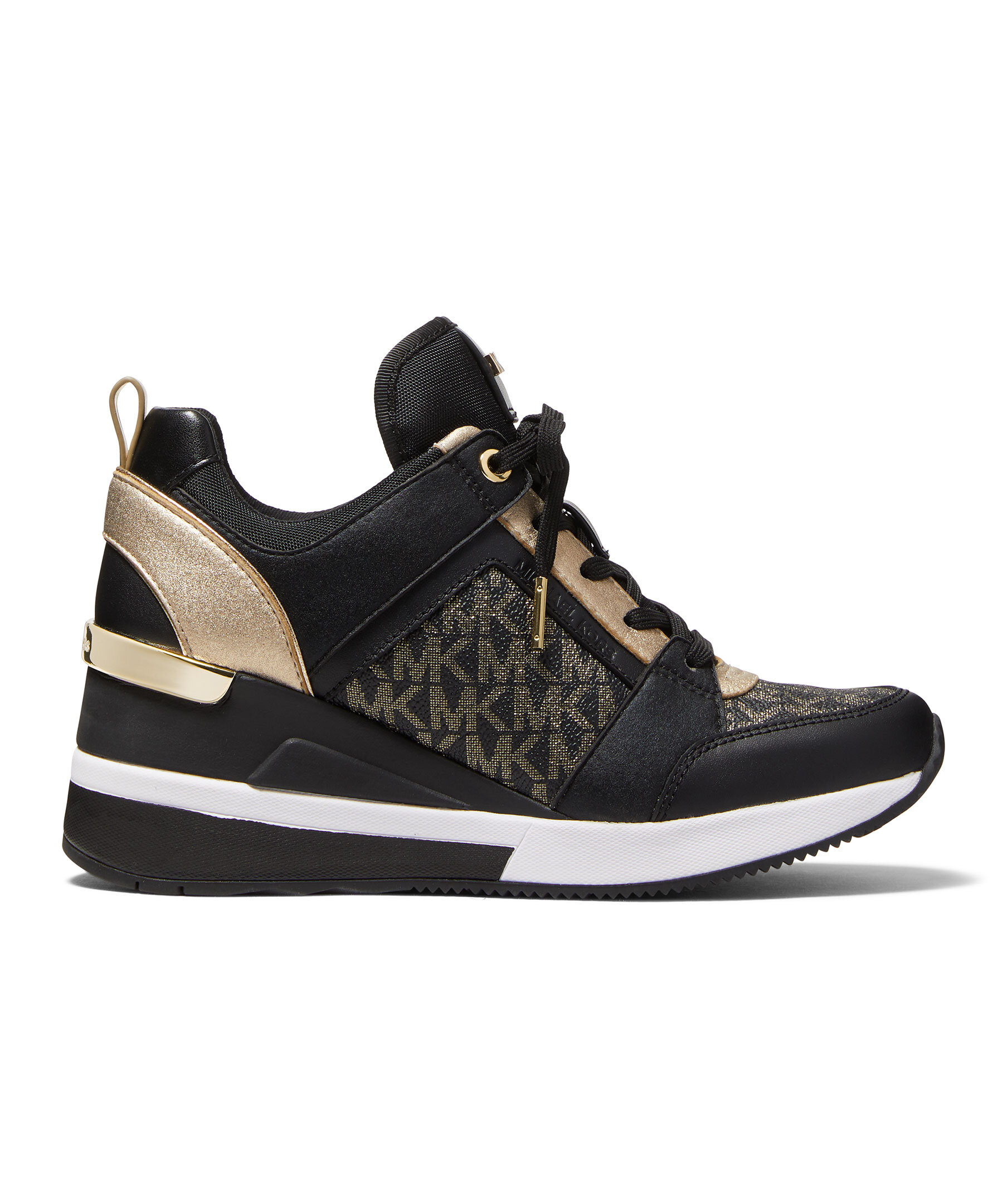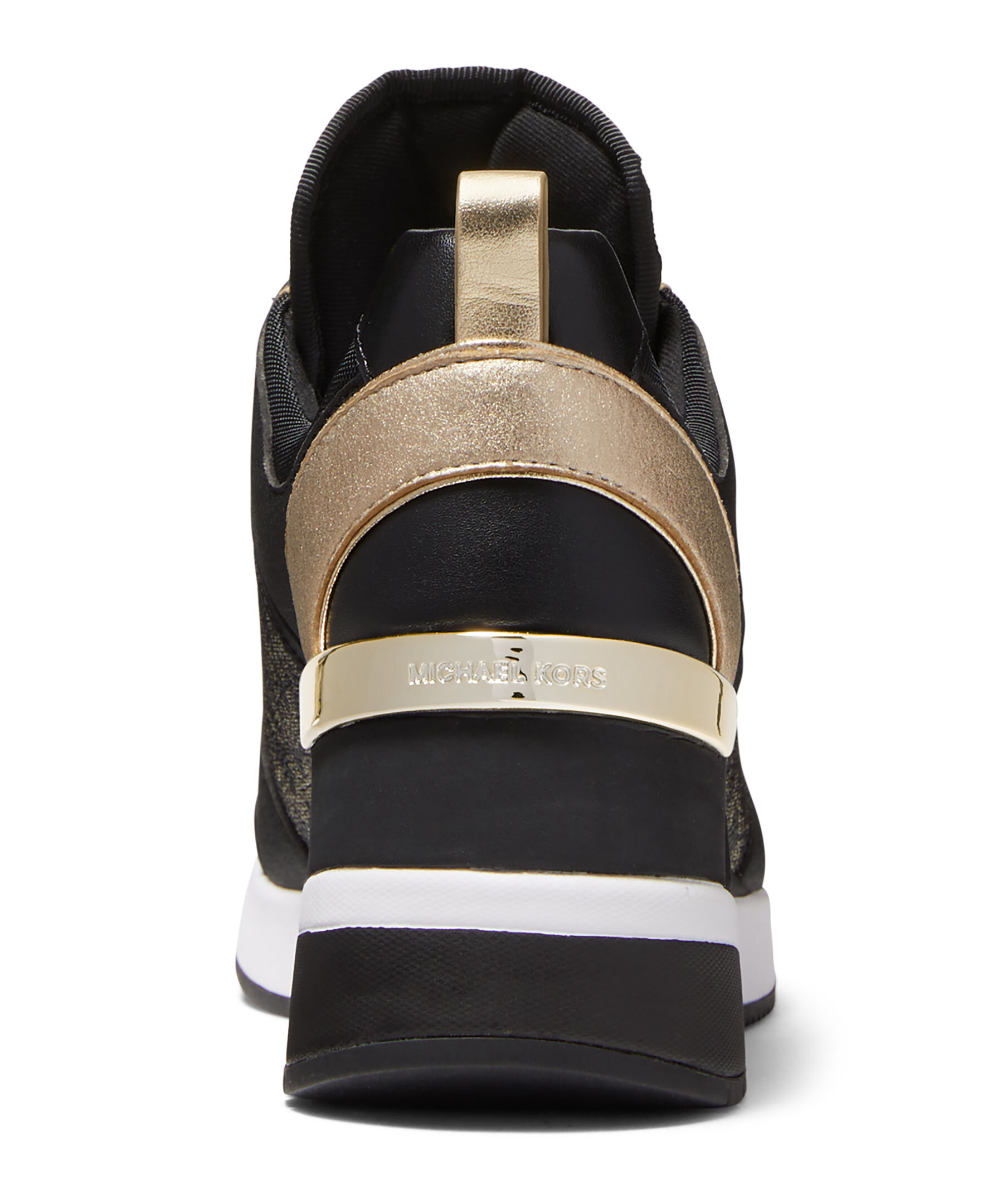 Svarta sneakers med kilklack från Michael Kors. Vita och guldfärgade detaljer. Logotyp på plös och bak vid hälen. Logotypmönster på sidan av skon samt på ovansidan. Klackhöjd på 6cm. Skinndetaljer i svart. Gummisula, rund tå och klassisk snörning.