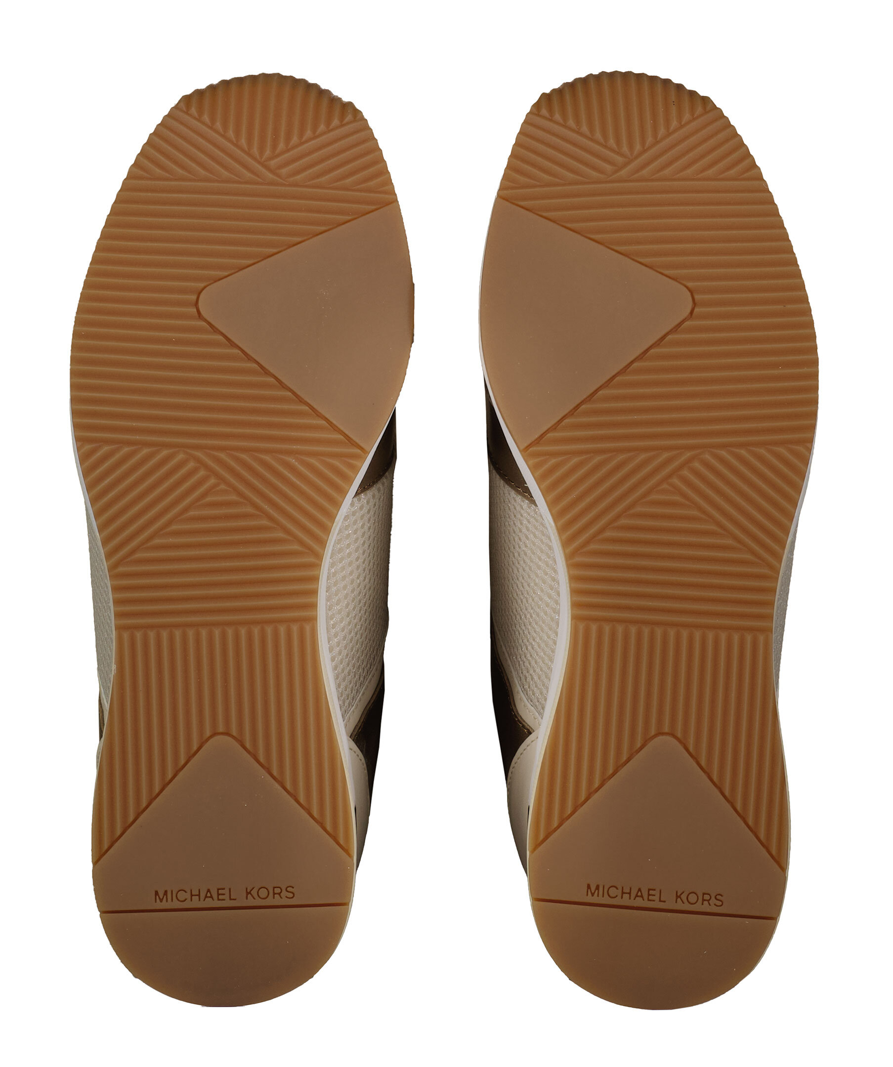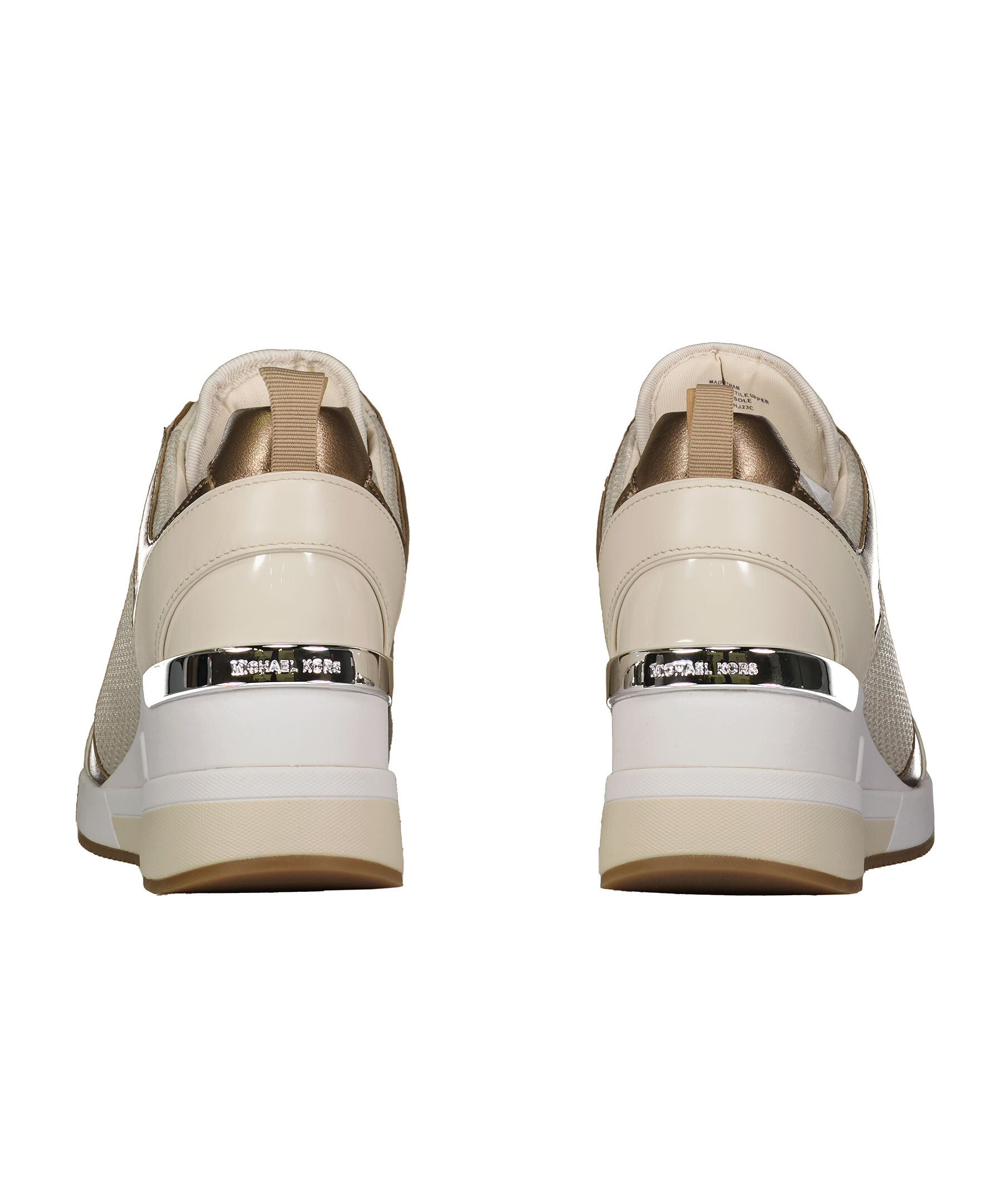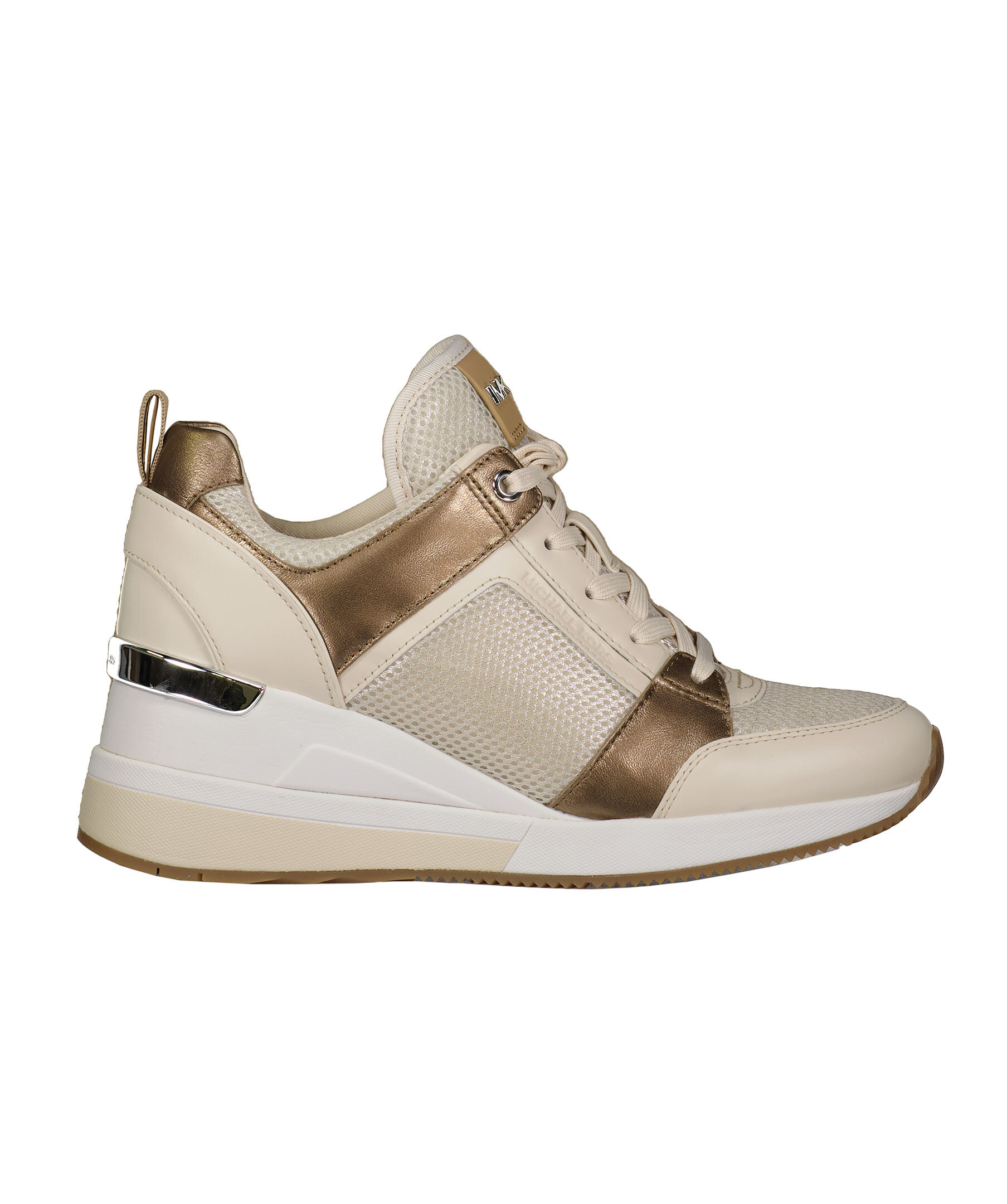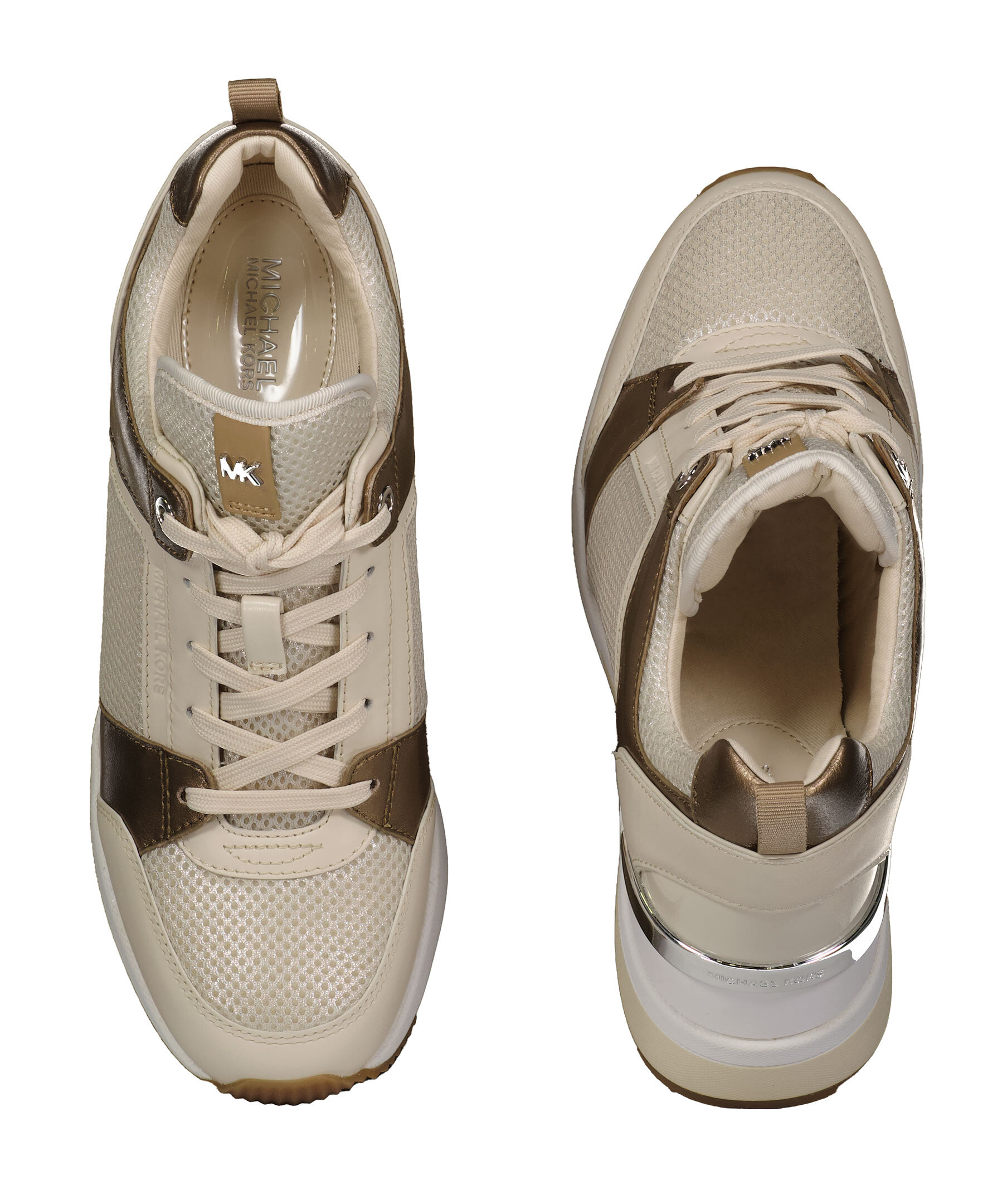 Beigea sneakers i läder och mesh med kilklack från Michael Kors. Silverfärgade detaljer i metall. Platta skosnören. Patch i läder och metall med logotyp på plösen.