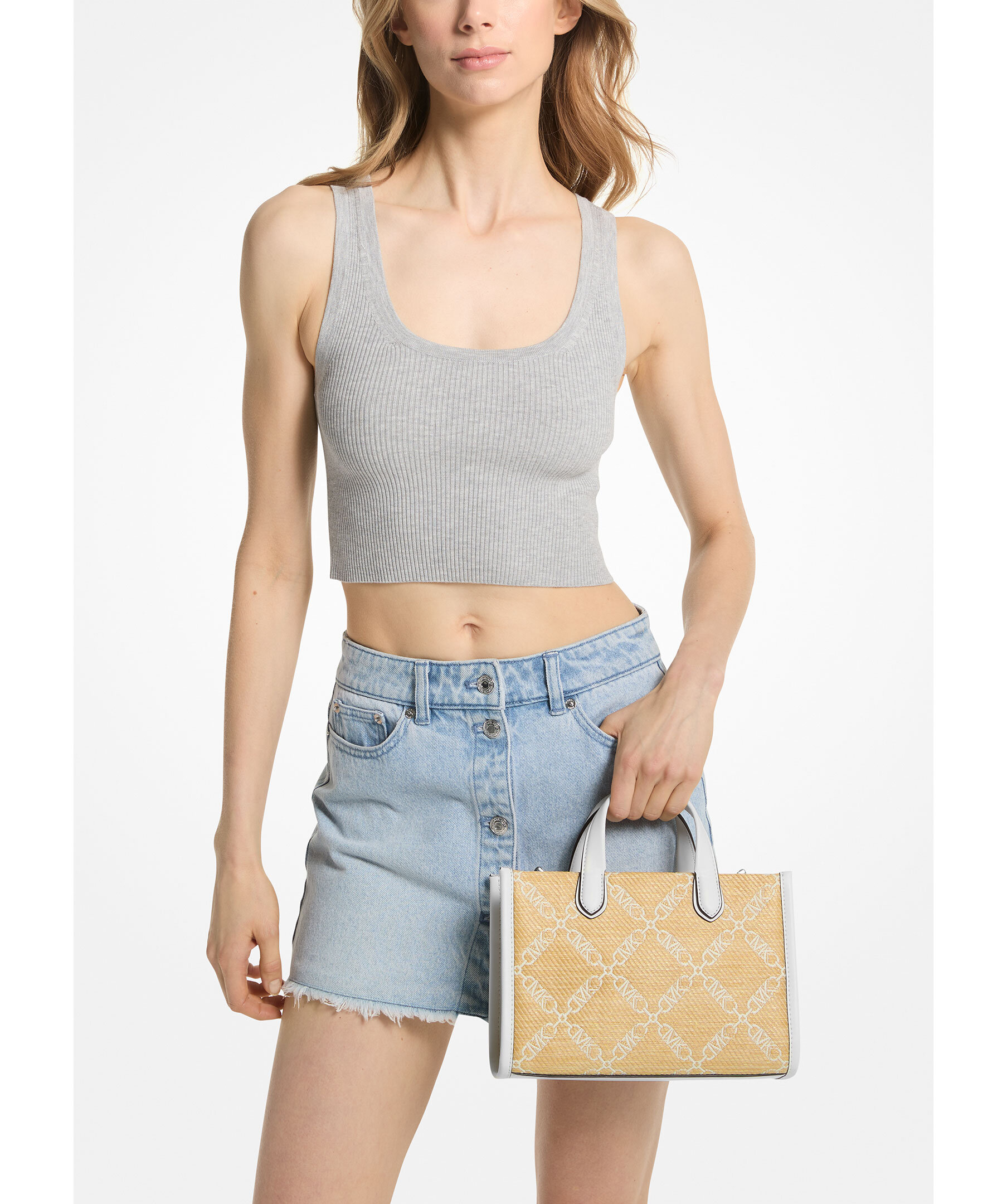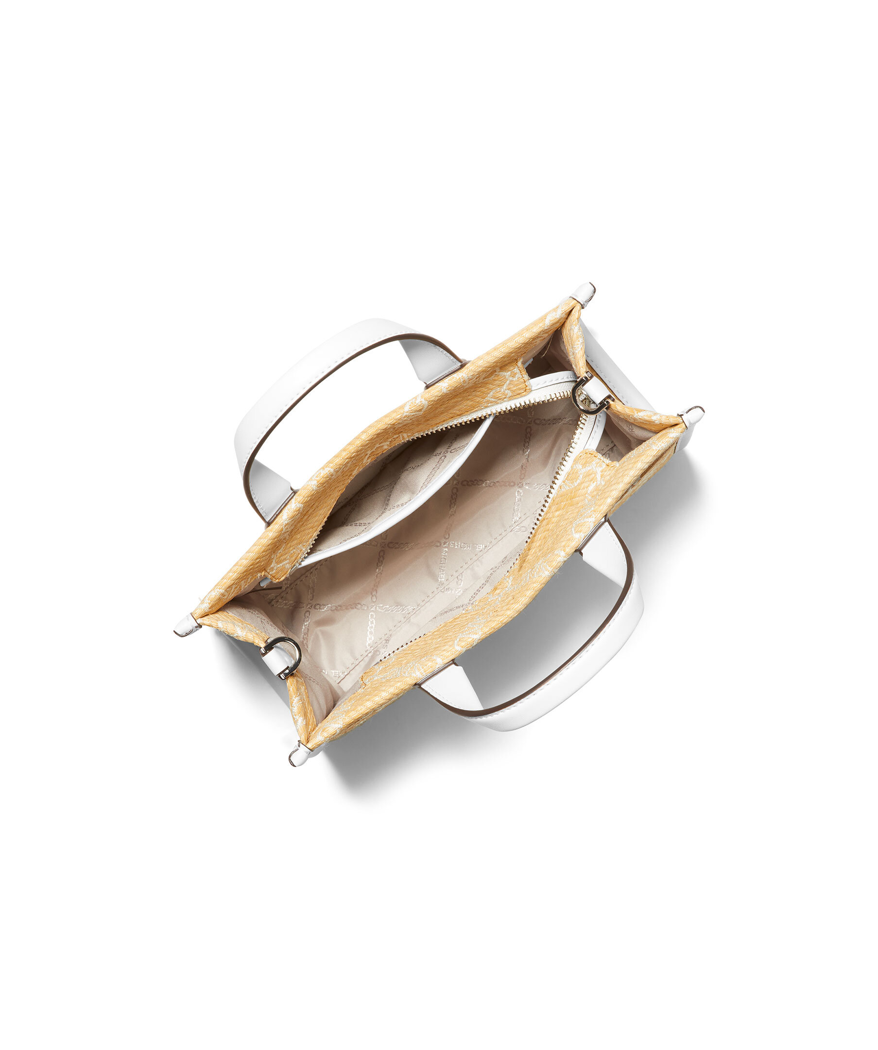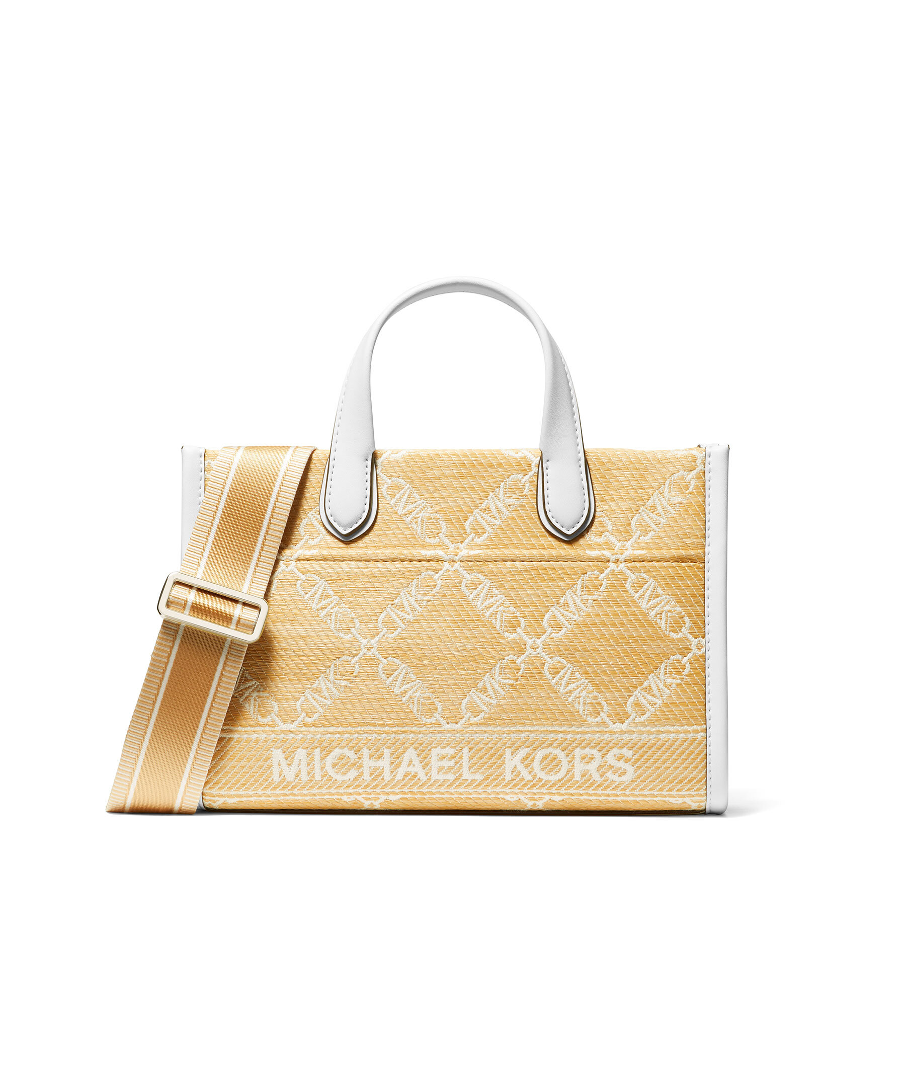 Sandfärgad handväska från Michael Kors. Väskan är tillverkad i en vävd halmstruktur med logotyp och har vita läderkanter. Guldfärgad hårdvara. Stängs med dragkedja. Avtagbar rem. Mått: B: 26cm, H: 17cm , D: 6.5cm.