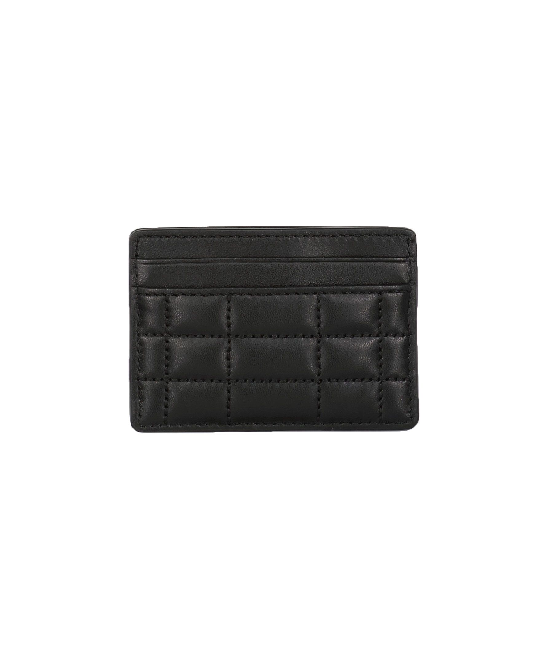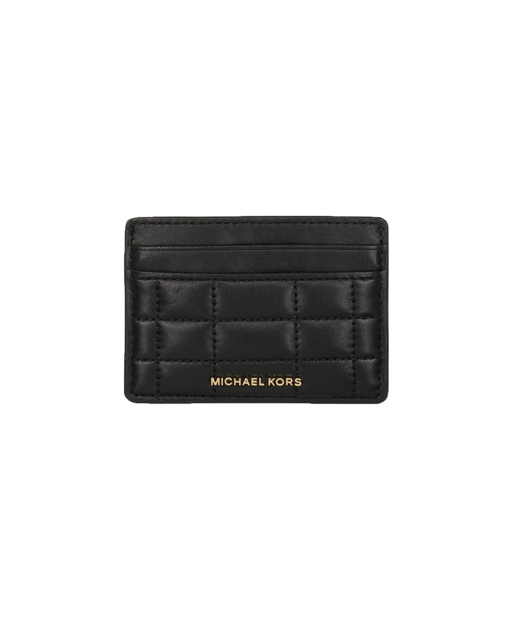 Svart, quiltad korthållare i läder från Michael Kors. Korthållaren har fyra kortplatser samt ett huvudfack och guldfärgad logotyp i metall på framsidan. Mått: B: 10,5cm, H: 7,5cm.