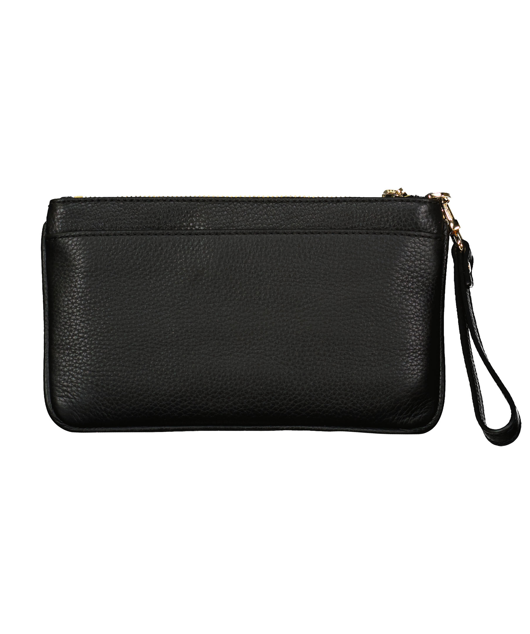 Svart Plånbok i läder från Michael Kors med band för handleden. Stängs med guldfärgad dragkedja. Logotyp i guldfärgad metall. Fack på insidan för kort, ett större innerfack.