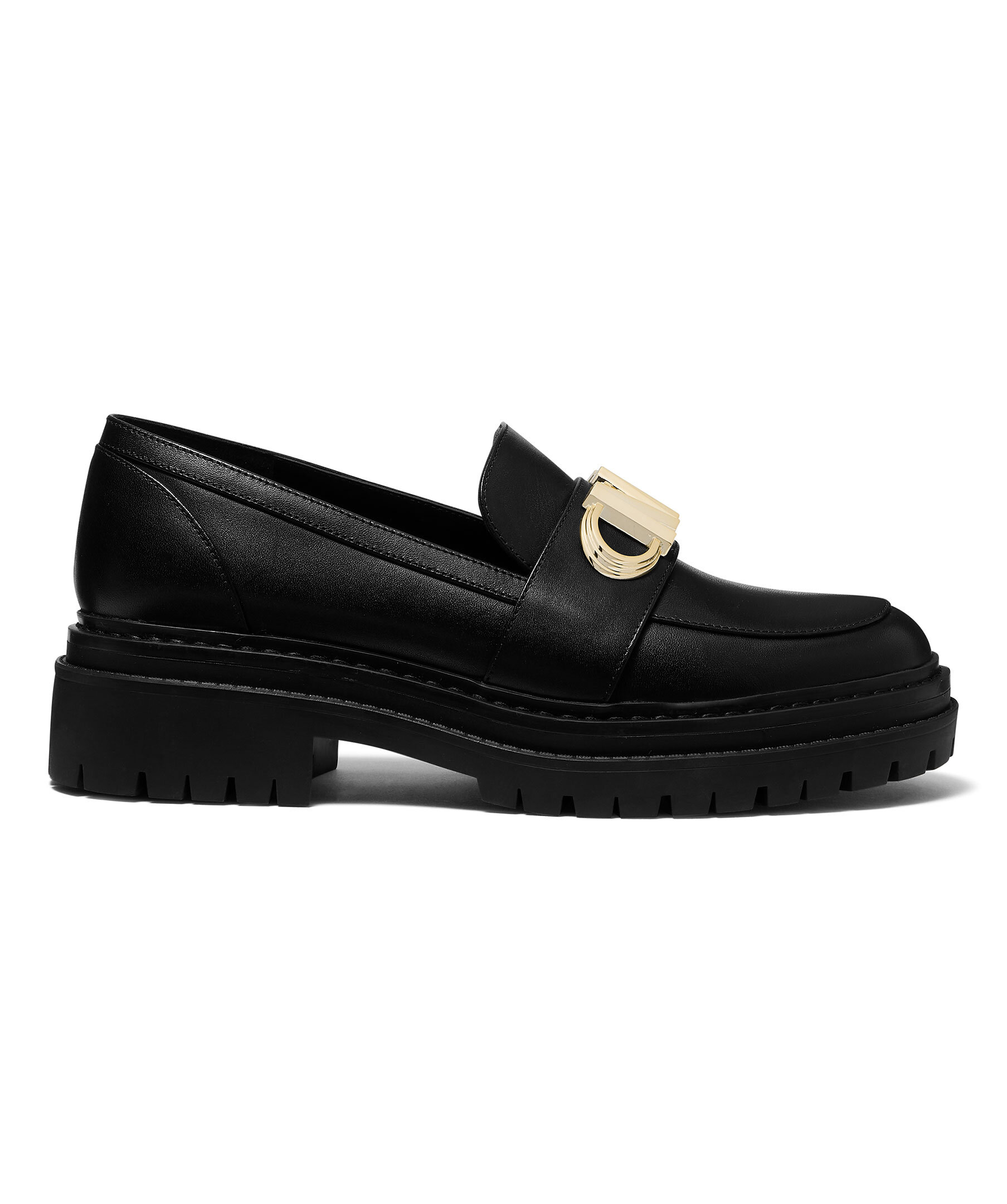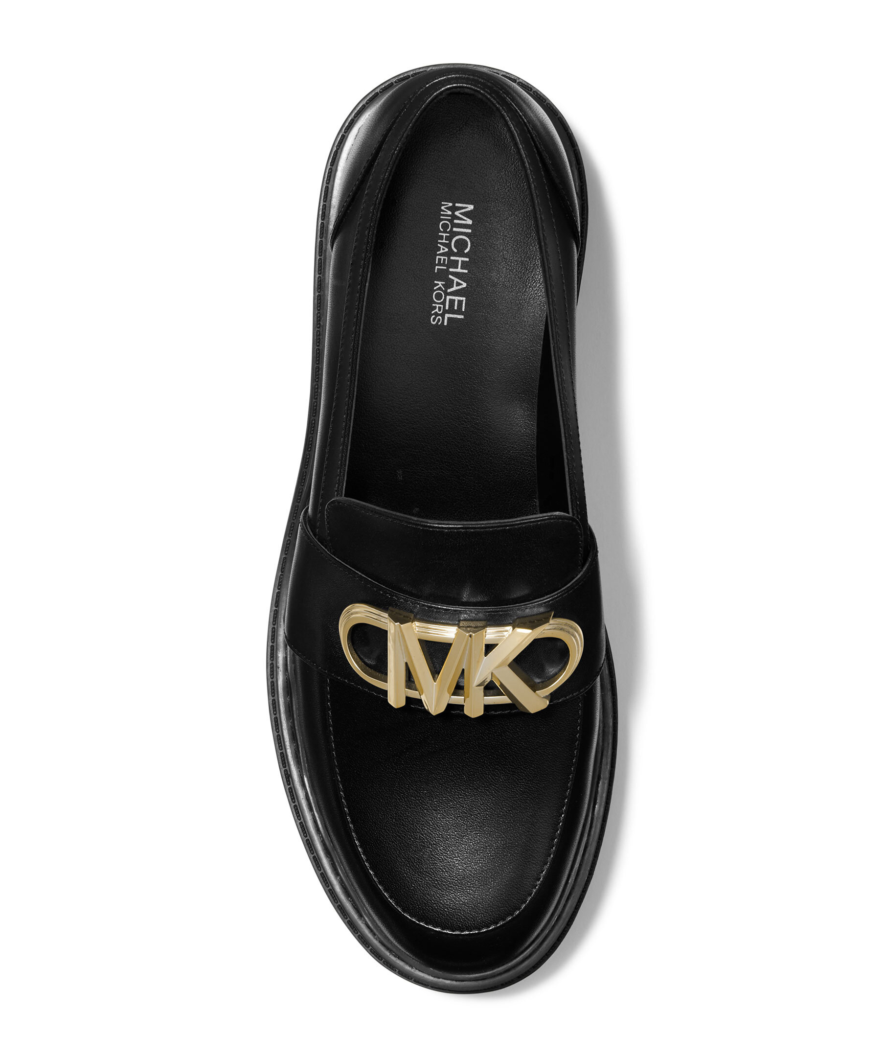 Svarta loafers i läder från Michael Kors. Prydd med guldfärgat emblem framtill och har höga gummisulor för extra grepp. Rundad tå och en klackhöjd på 5 cm.