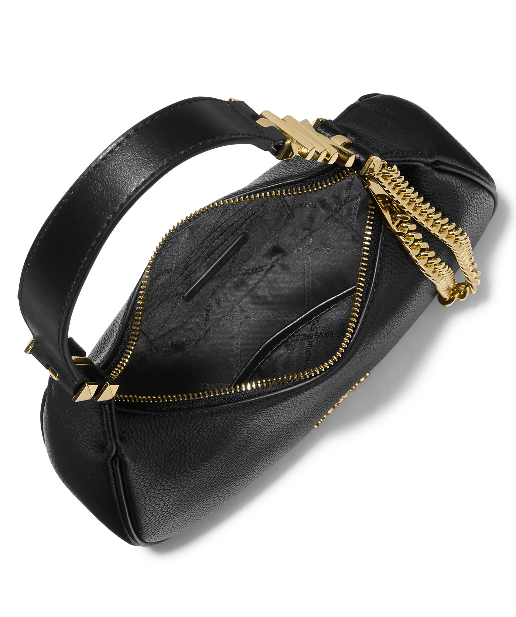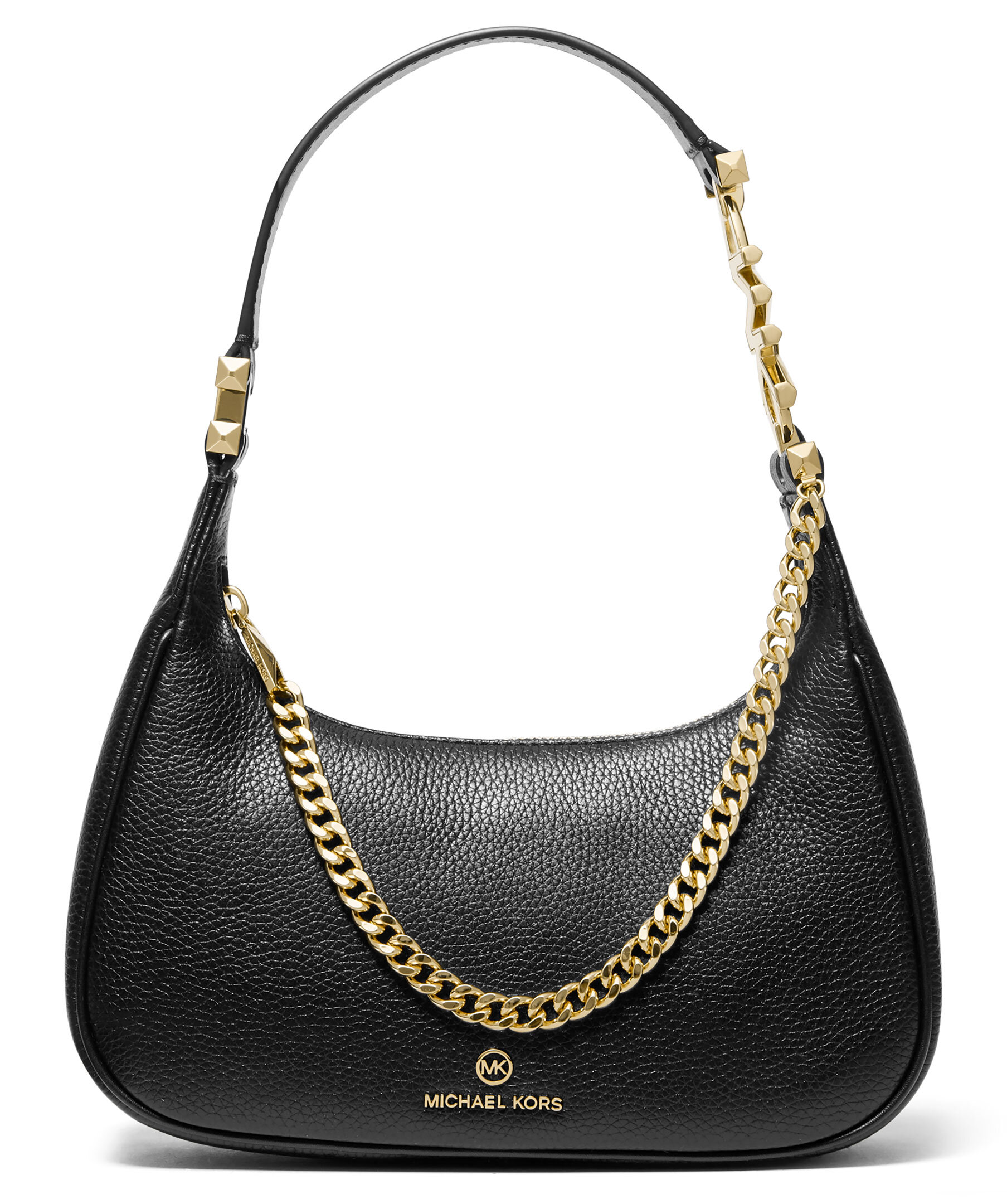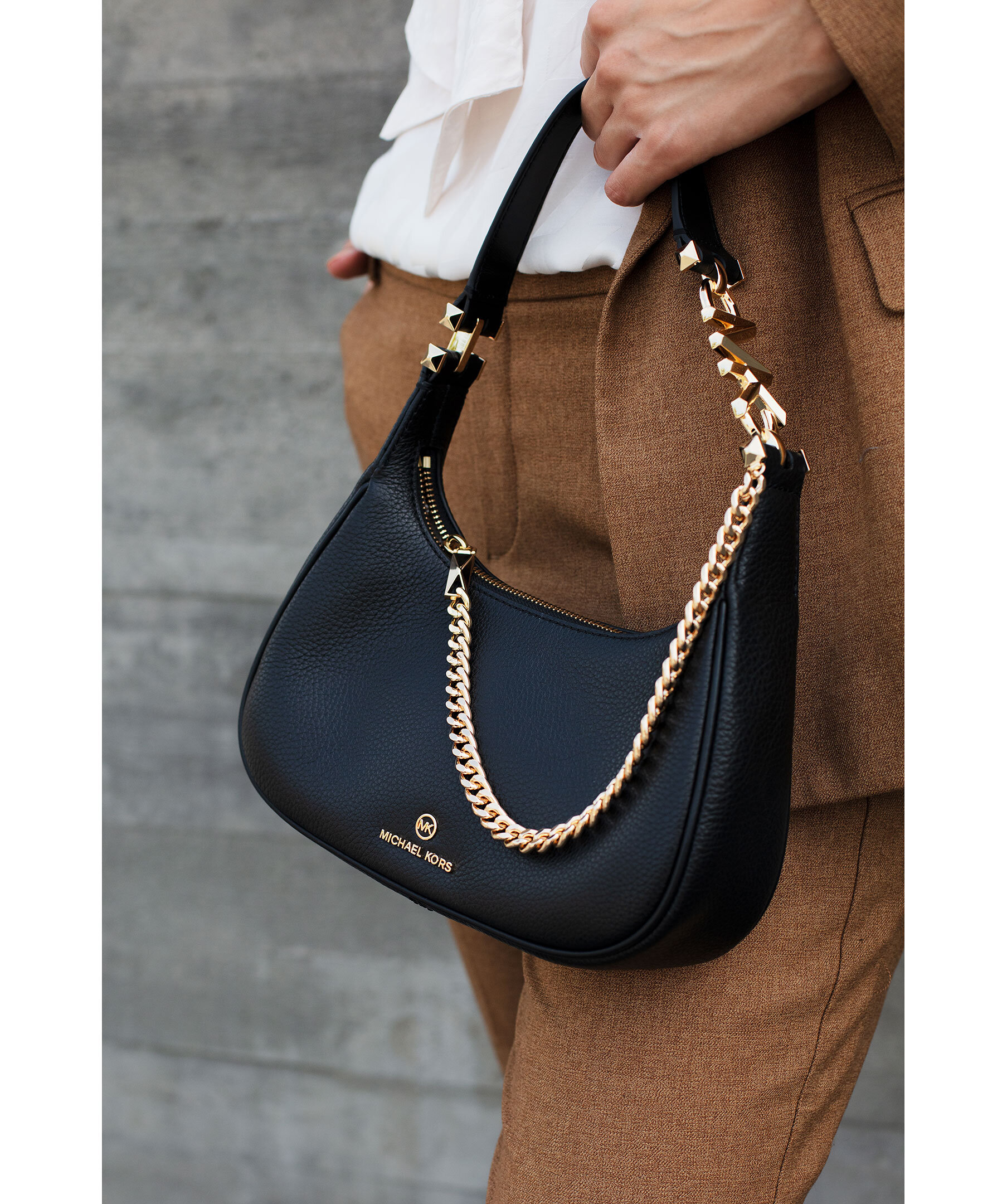 Svart axelväska från Michael Kors. Tillverkad av strukturerat läder, har en guldfärgad logotyp fram och har en guldfärgad kedjelänk fram. Stängs med dragkedja upptill och har fickor på insidan. Välformat handtag som bekvämt glider över din axel. Foder i 100% polyester. Mått: 25,5 cm B x 21,5 cm H x 8 cm D. Handtagsfall: 22 cm.