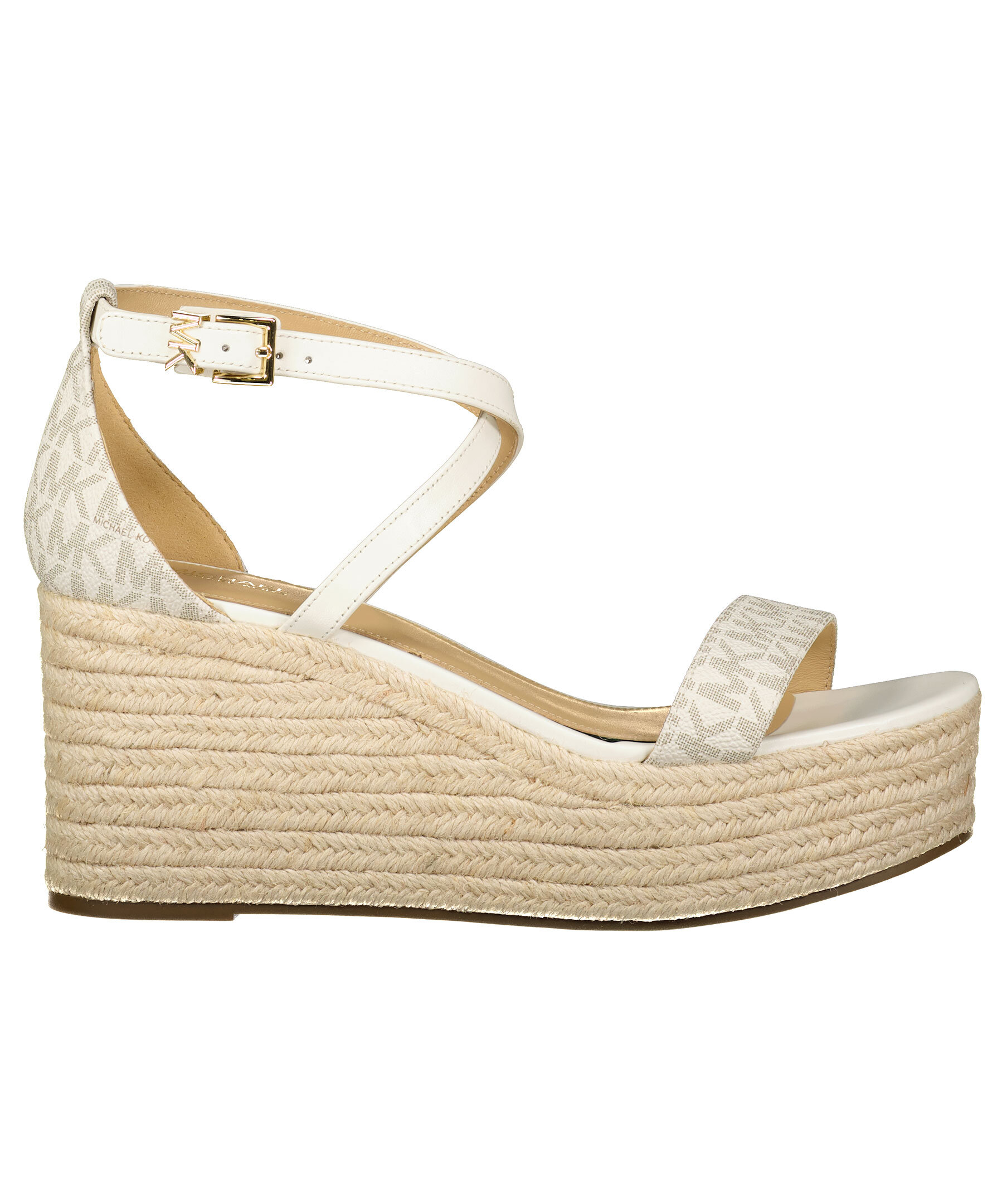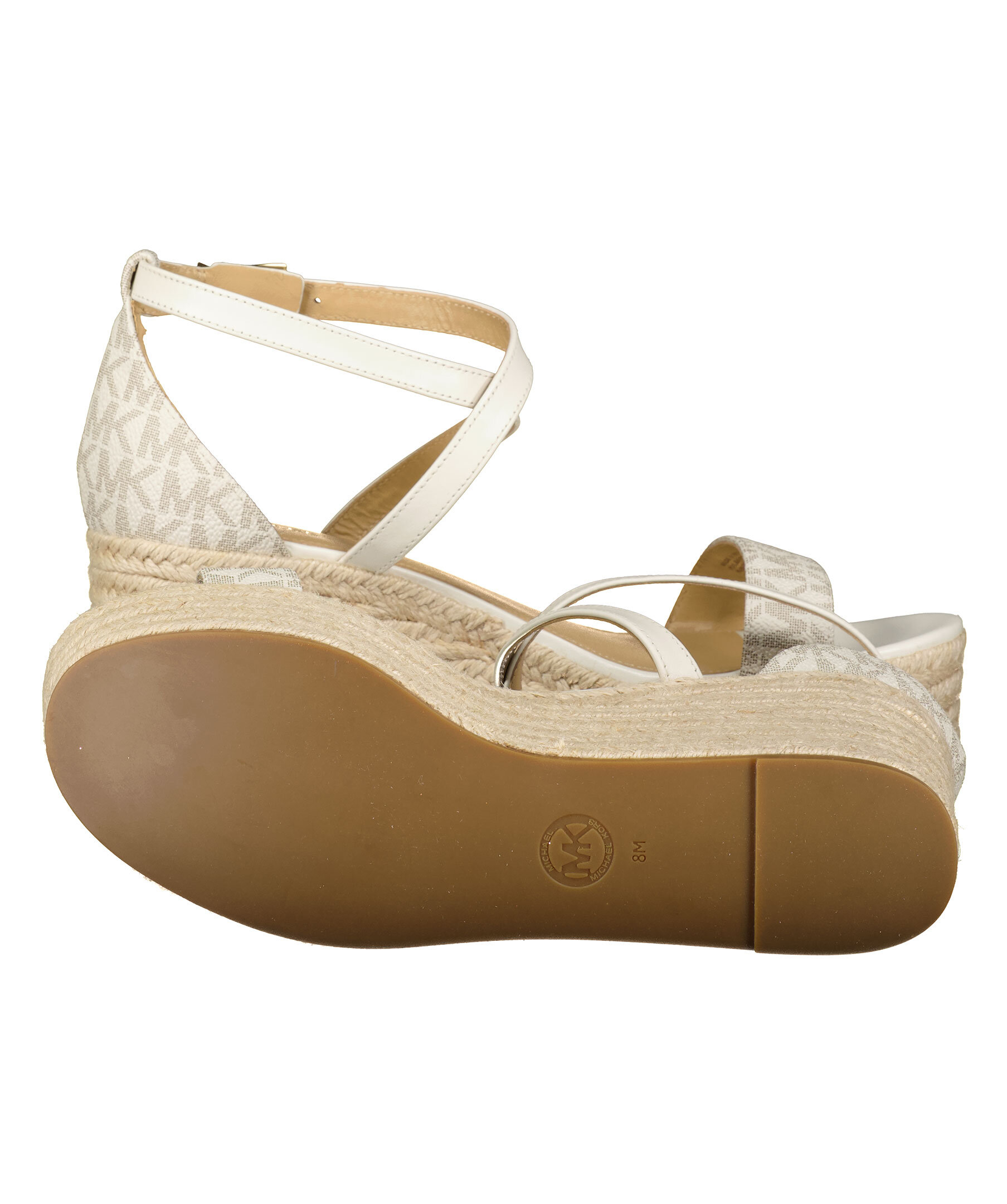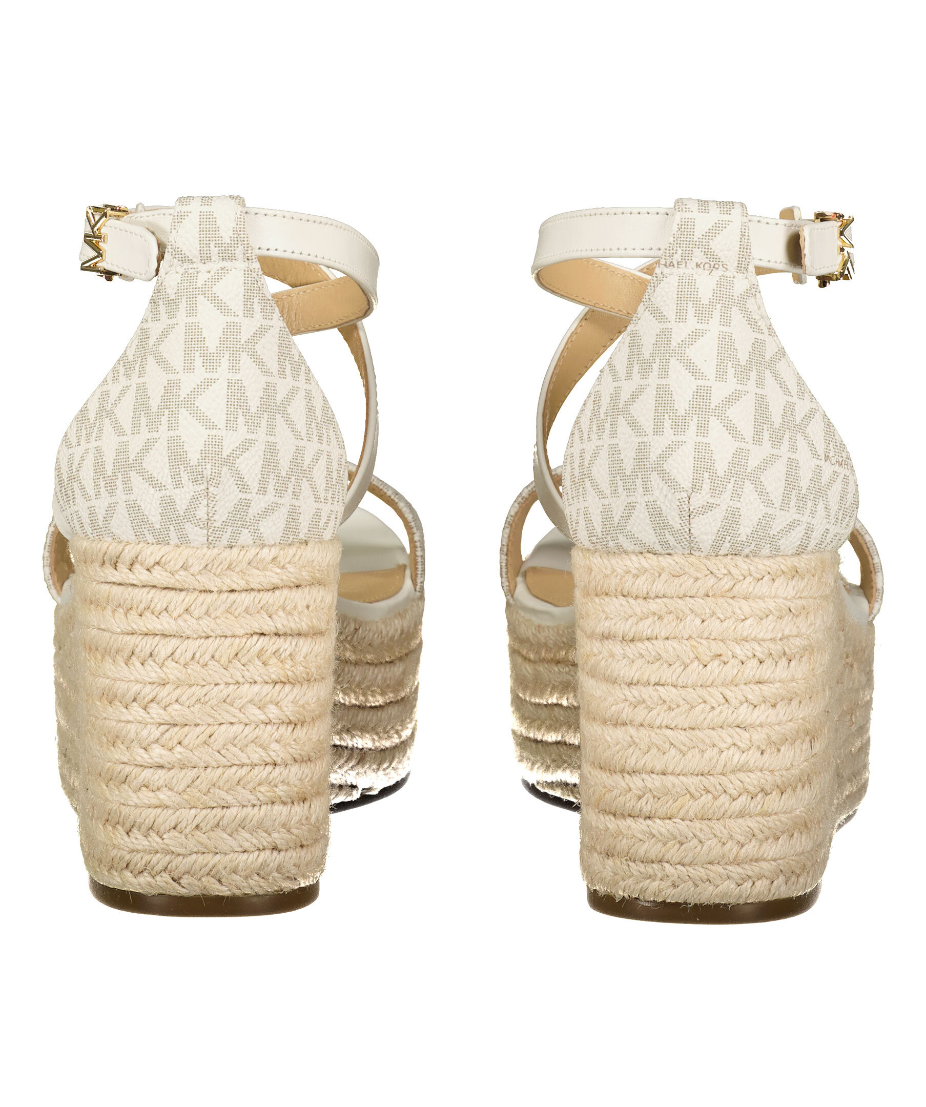 Vita och beigea sandaler med kilklack från Michael Kors. Flätade detaljer på sulan. Monogram mönster på tåremmen och hälen. Guldfärgade spännen med logotyp.