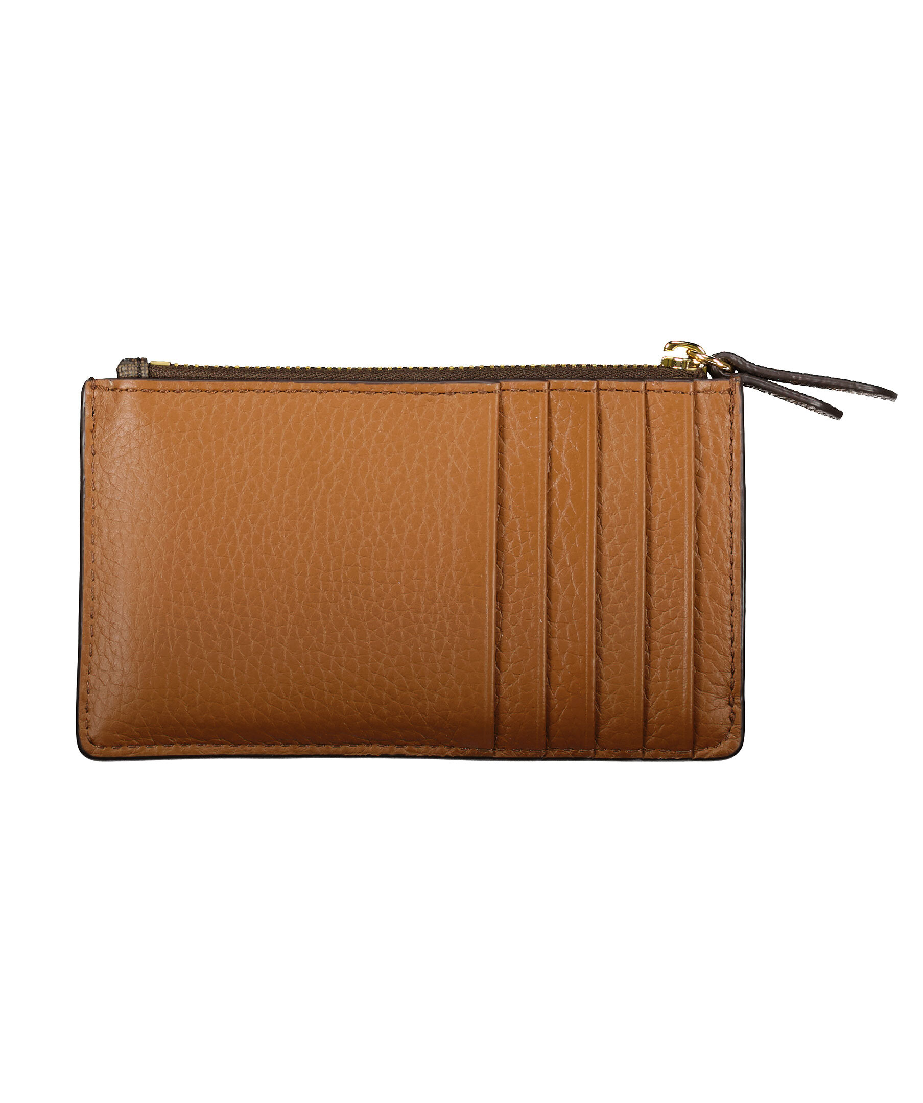 Brun plånbok i läder från Michael Kors. Logotyper i lädret. Stängs med dragkedja upptill och har fem fack för kontokort på baksidan och ett fack fram. På insidan finns en nyckelring som sitter fast i ett lädersnöre. Mått: 13,5 x 8 x 1 cm.