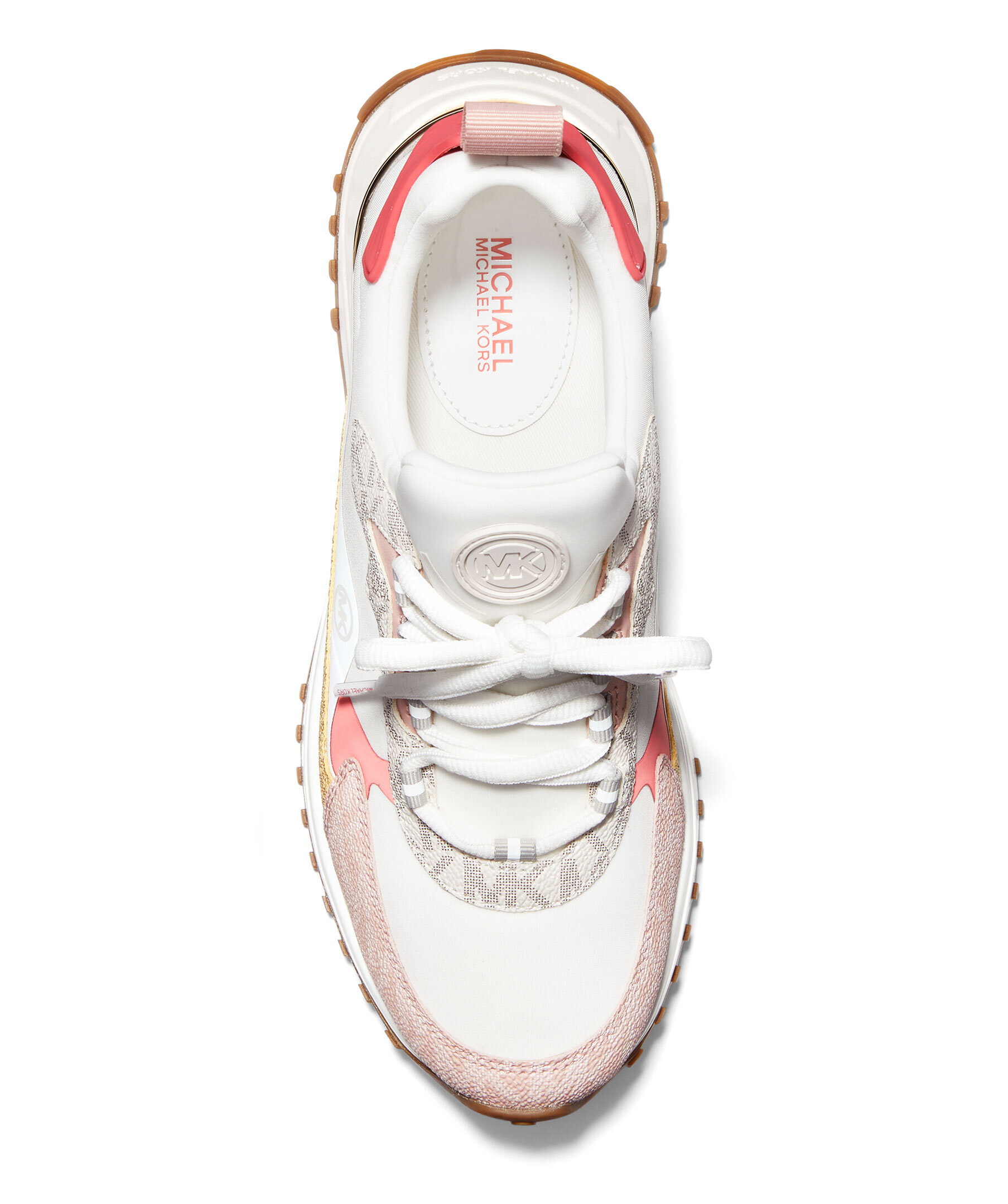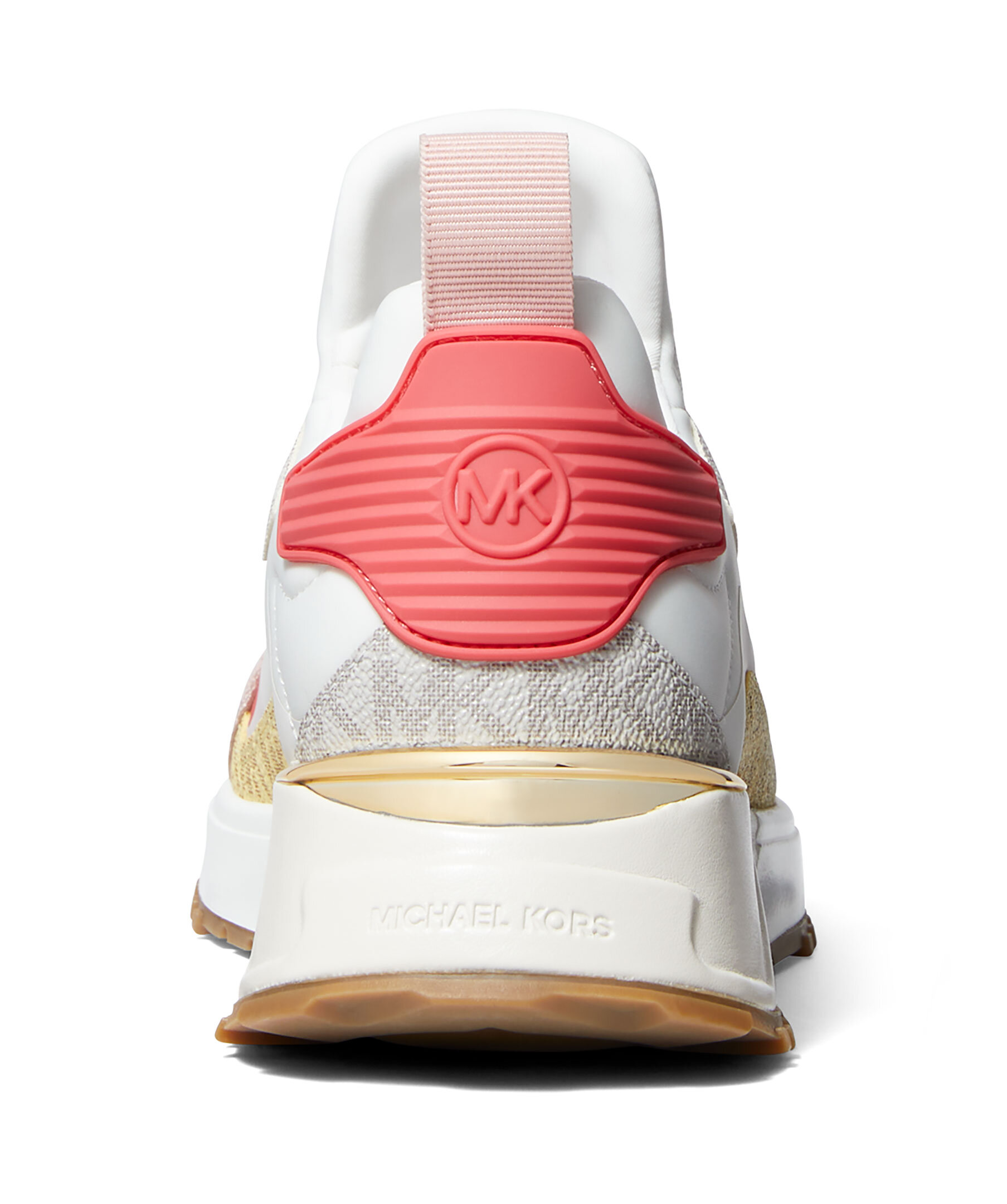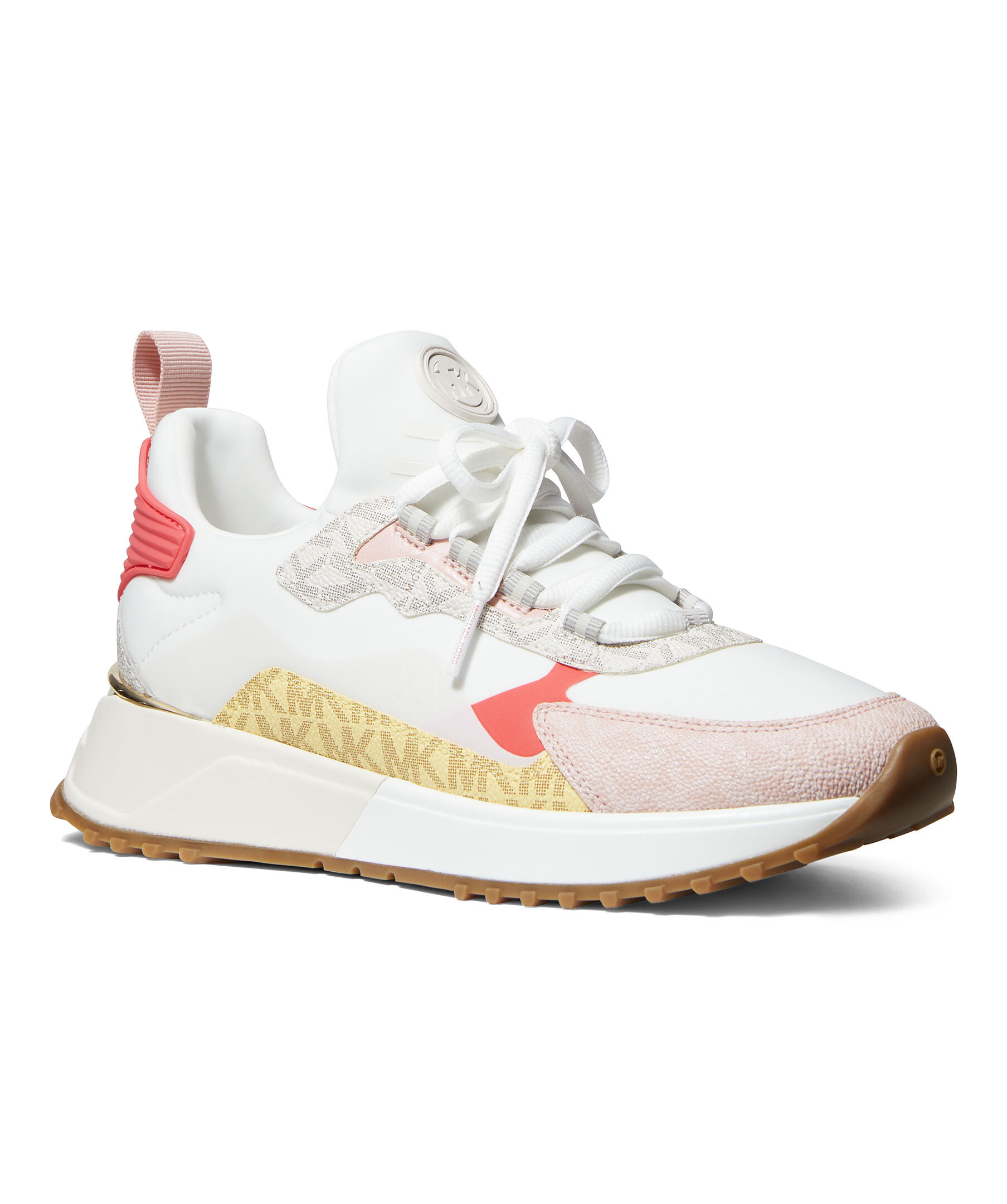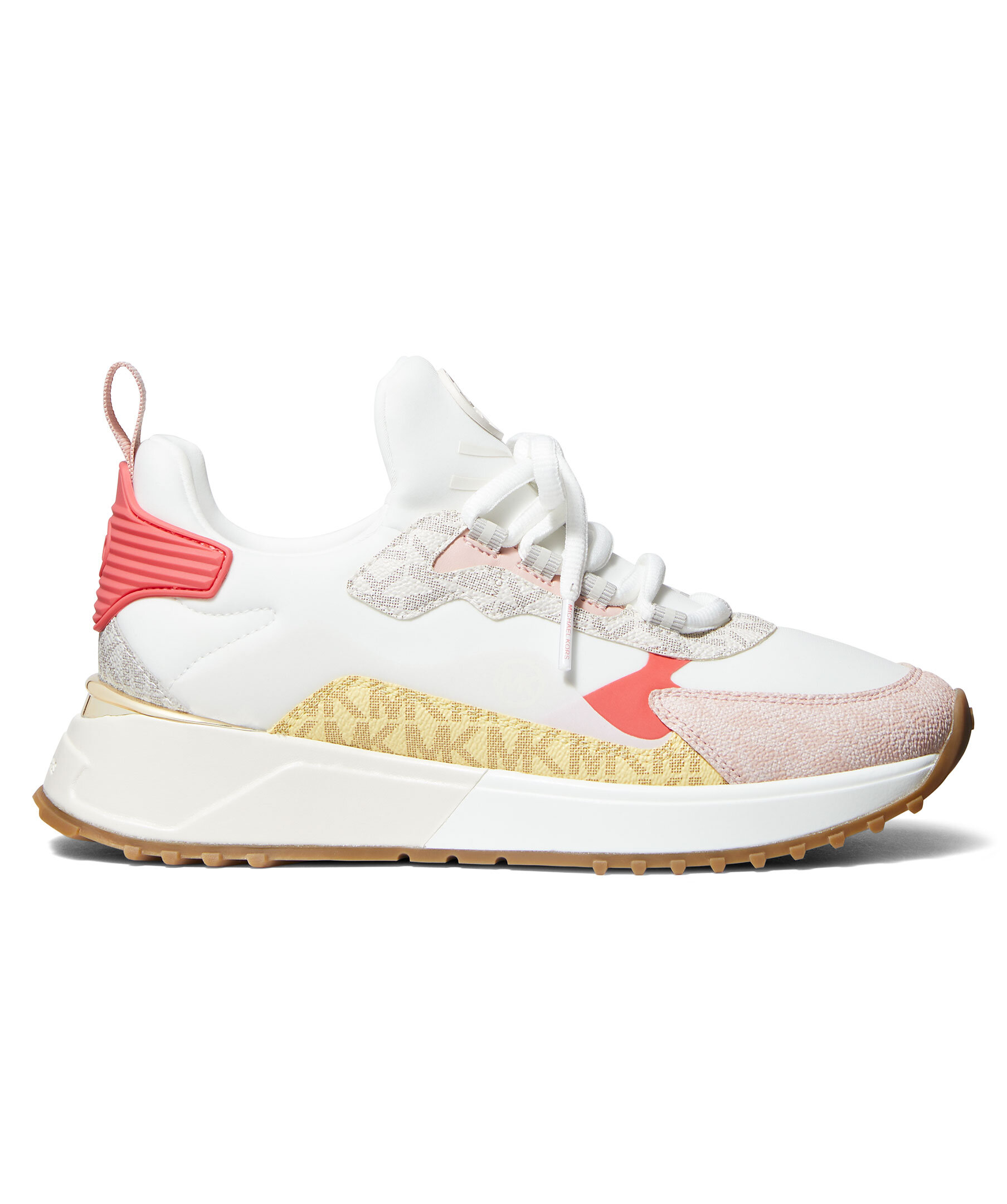 Blockfärgade sneakers av canvas och scuba från Michael Kors. Vit gummisula och en dragflik baktill som gör dem lätta att ta av och på. Logotryck på de färgade delarna i rosa och gult samt rund logotyp på plösen och bak på hälen. Vita skosnören och beige undersula.