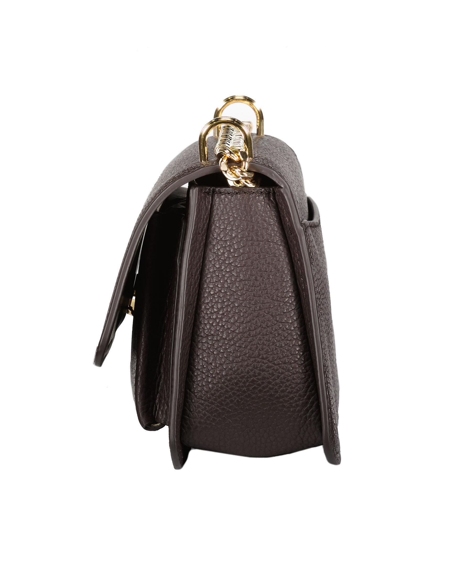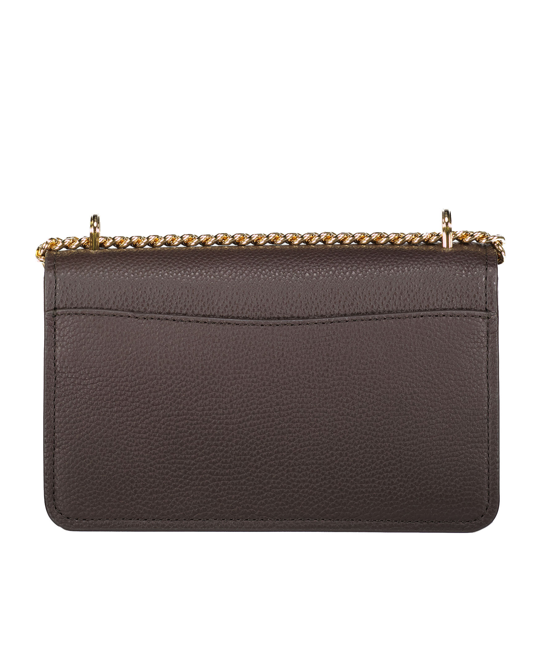 Mörkbrun handväska från Michael Kors. Väskan har magnetiskt knapplås, innerfack med blixtlås och guldfärgad loggotyp på framsidan. Guldfärgad axelbandskedja på 55,5 cm som löper över väskans rygg.