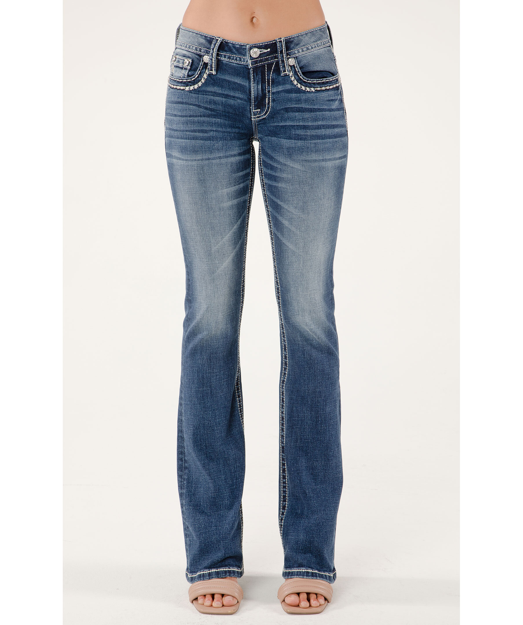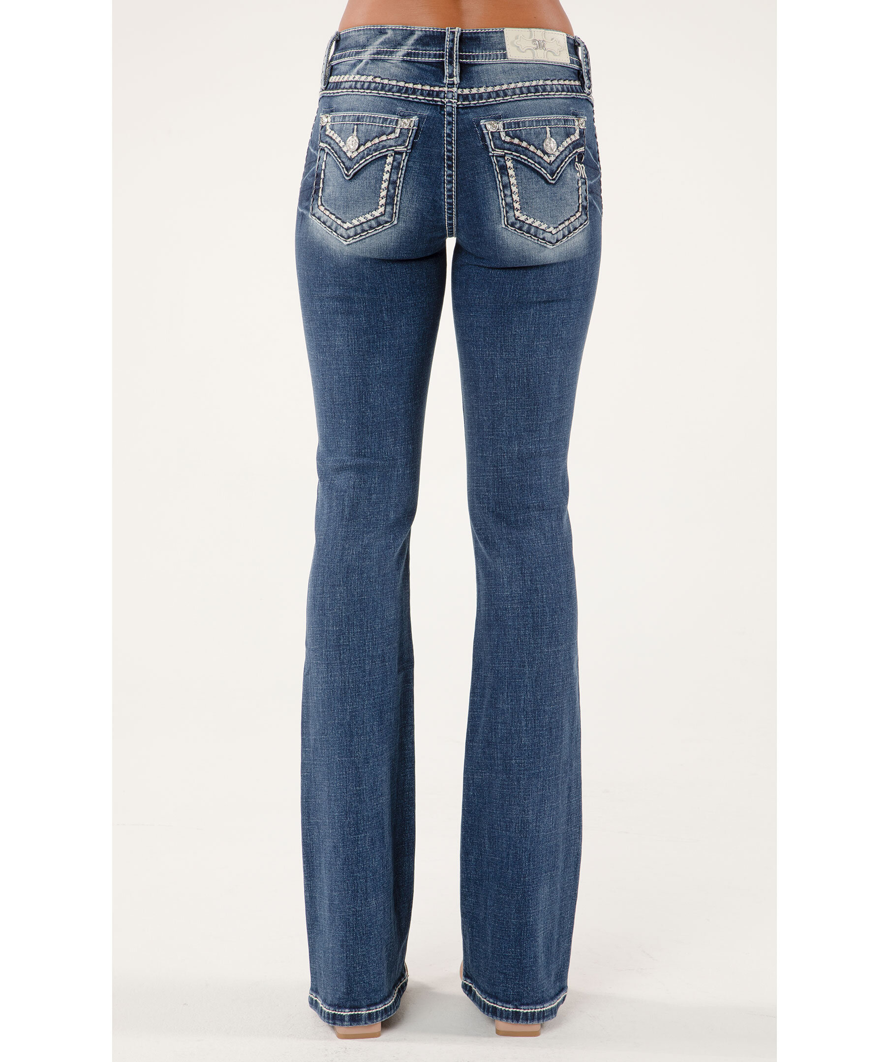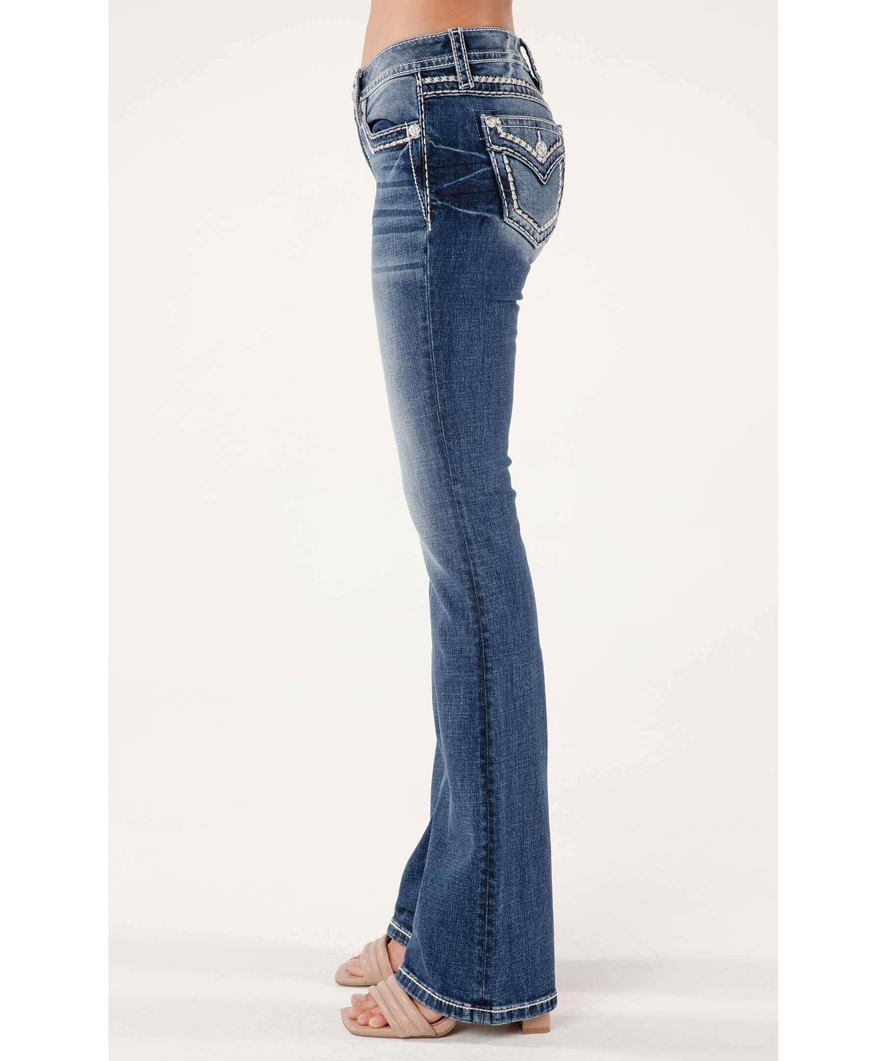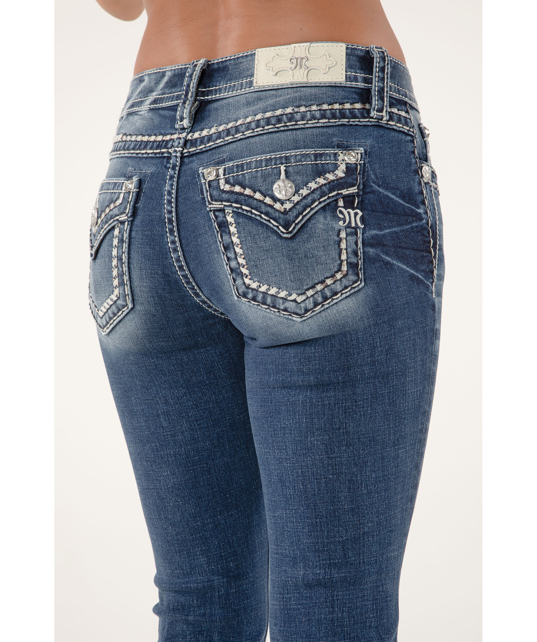 Blåa bootcut-jeans från Miss Me. Jeansen har en medelhög midja med bälteshällor, fem fickor samt broderad logotyp på ena bakfickan och vita sömdetaljer. Vit läderlapp baktill på linningen. Tillverkade i en bomullsblandning.