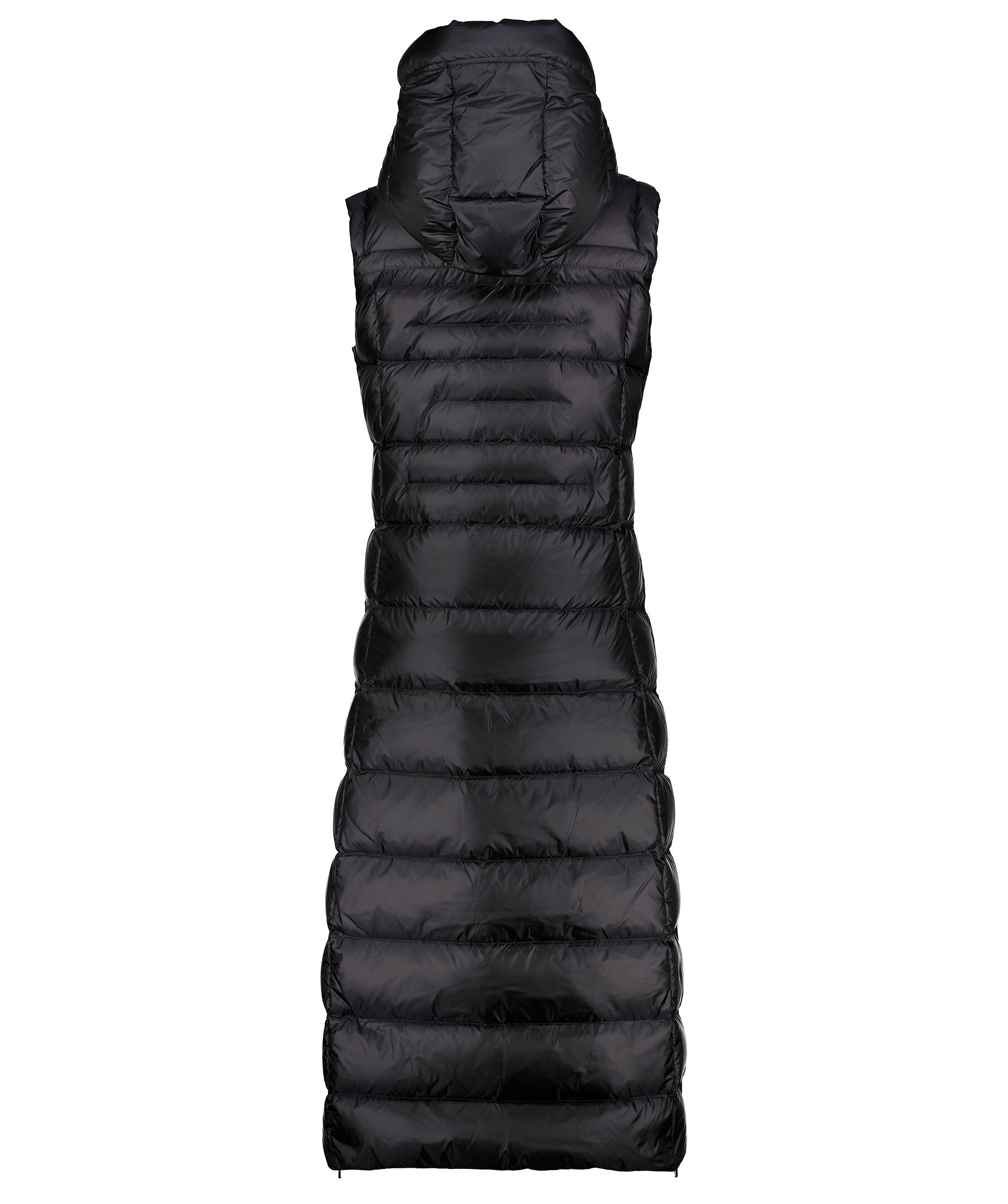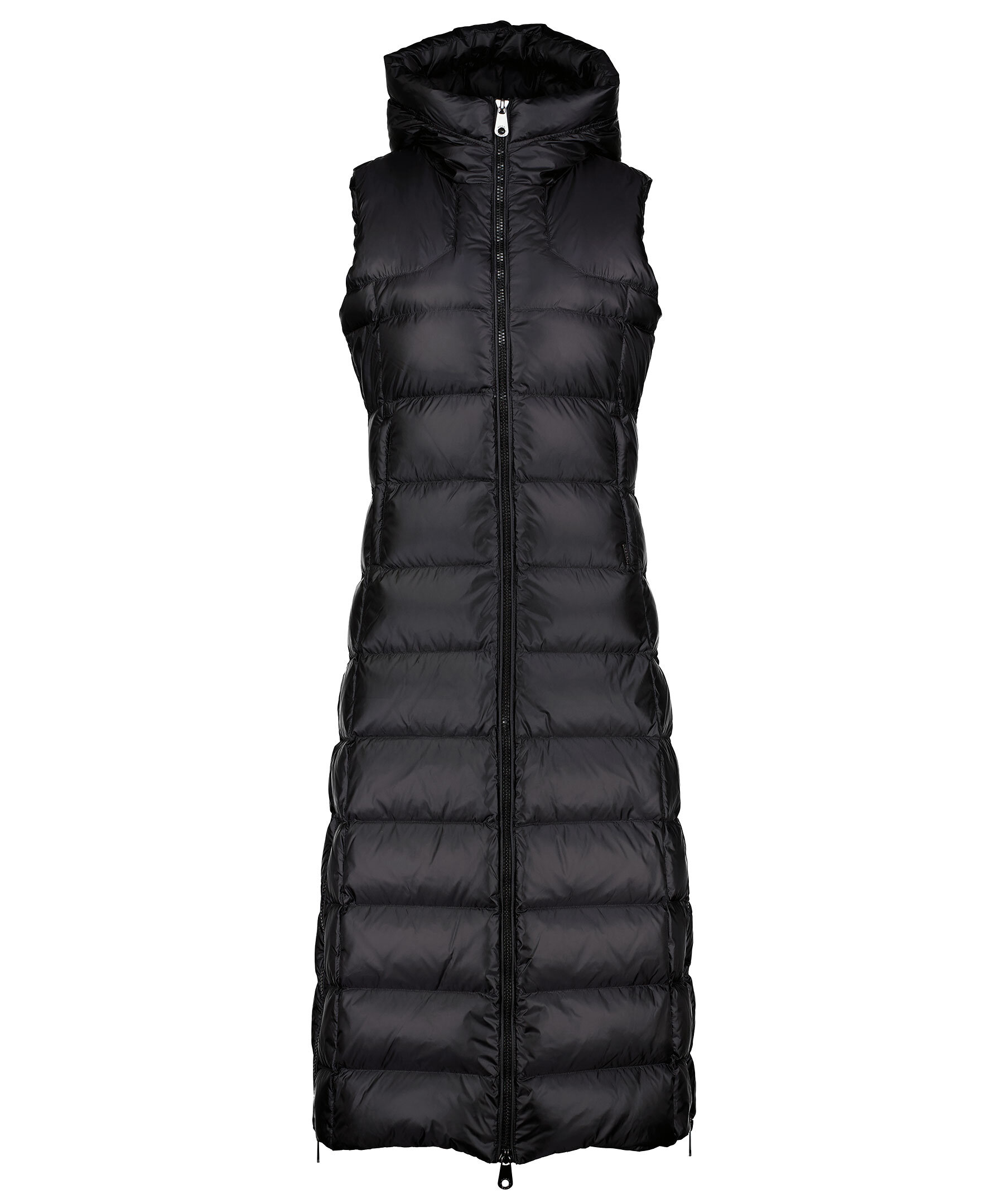 Svart, lång dunväst med figursydd midja från Monel. Yttermaterial i nylontyg med glansig finish. Stängs med tvåvägsdragkedja, har dragkedja i sidorna för att kunna öppna upp på sidorna. Två fickor framtill som stängs med dragkedja och en innerficka med dragkedja. Luva och hög krage samt patch i gummi med logotyp i metall på vänster ärm.