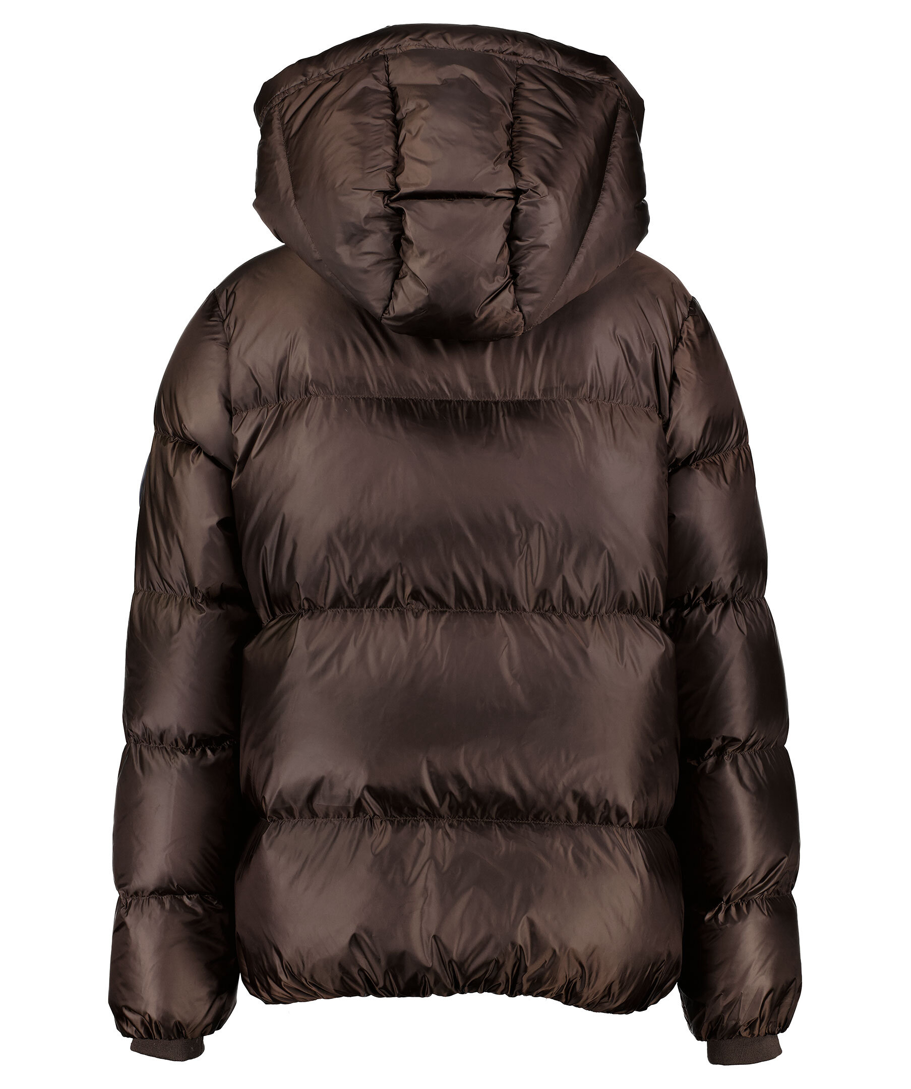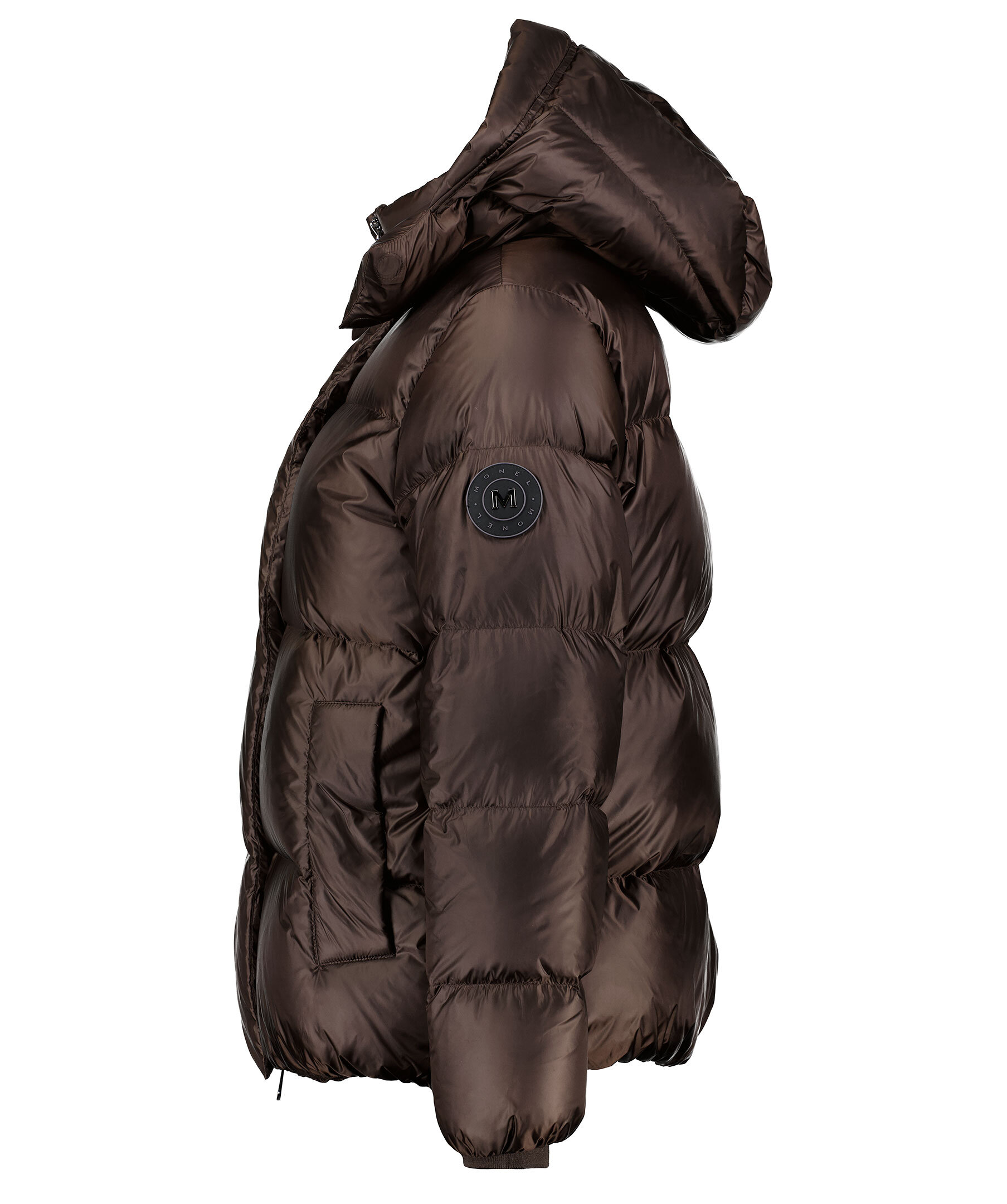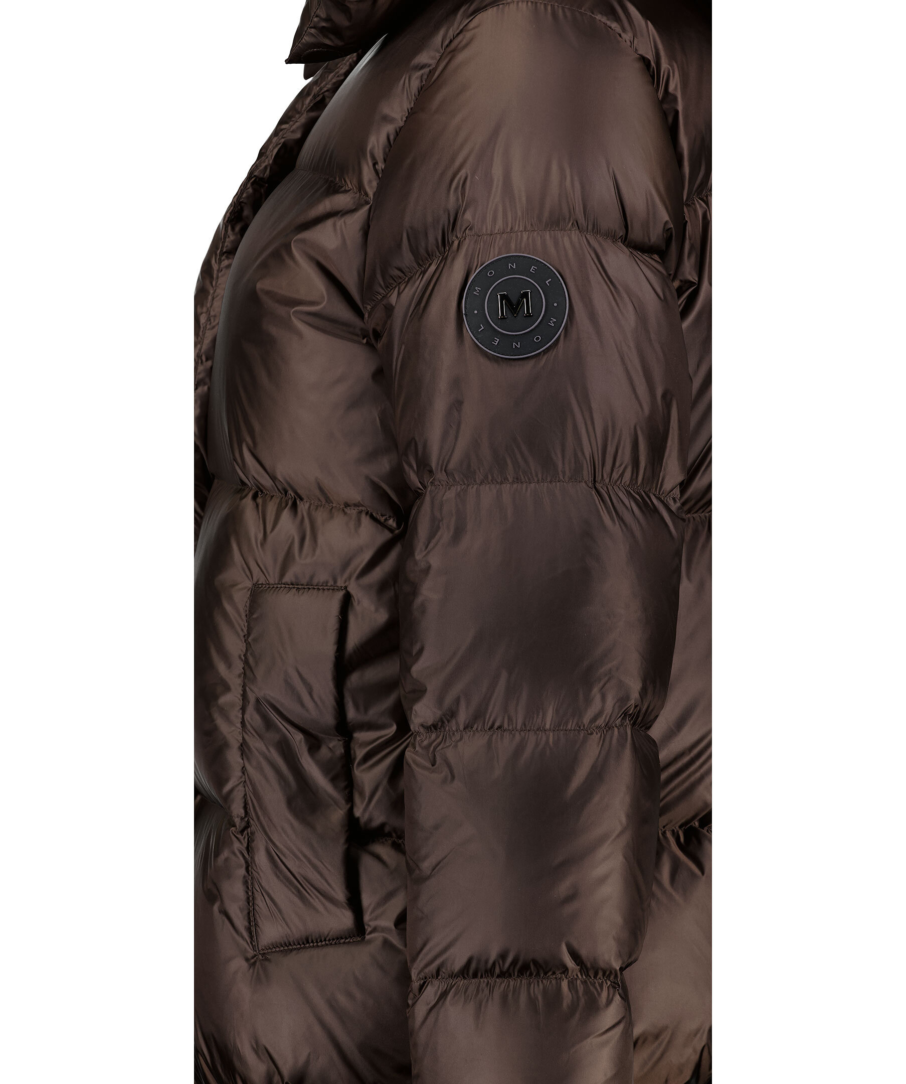 Mörkbrun pufferjacka från Monel. Yttermaterial nylontyg med glansig finish samt rak och oversize passform. Stängs med tvåvägsdragkedja och magneter, har två fickor i sidorna som stängs med tryckknapp och två innerfickor med dragkedja. Hög krage och luva, muddar i ärmslut samt patch i gummi med logotyp i metall på vänster ärm. Vi upplever att denna produkt är stor i storlek och rekommenderar att gå ner en storlek.
