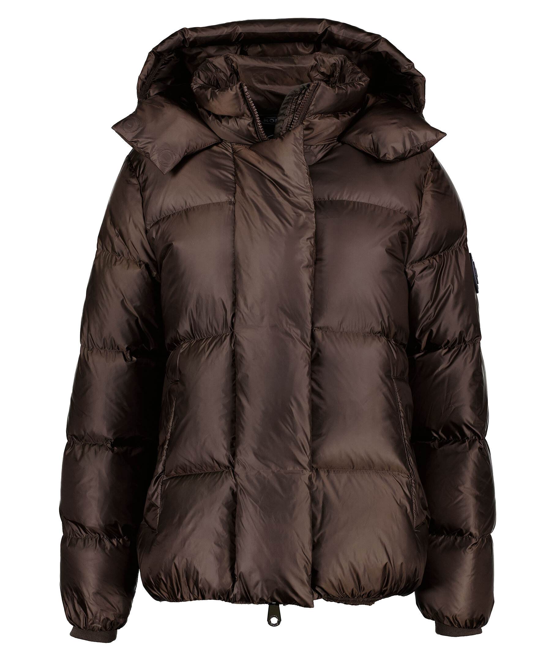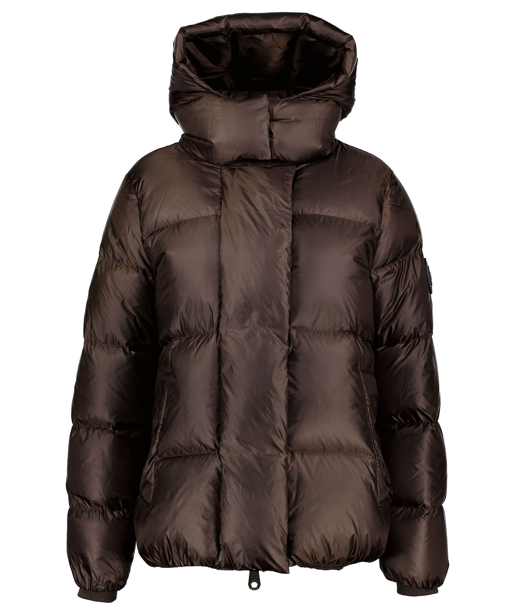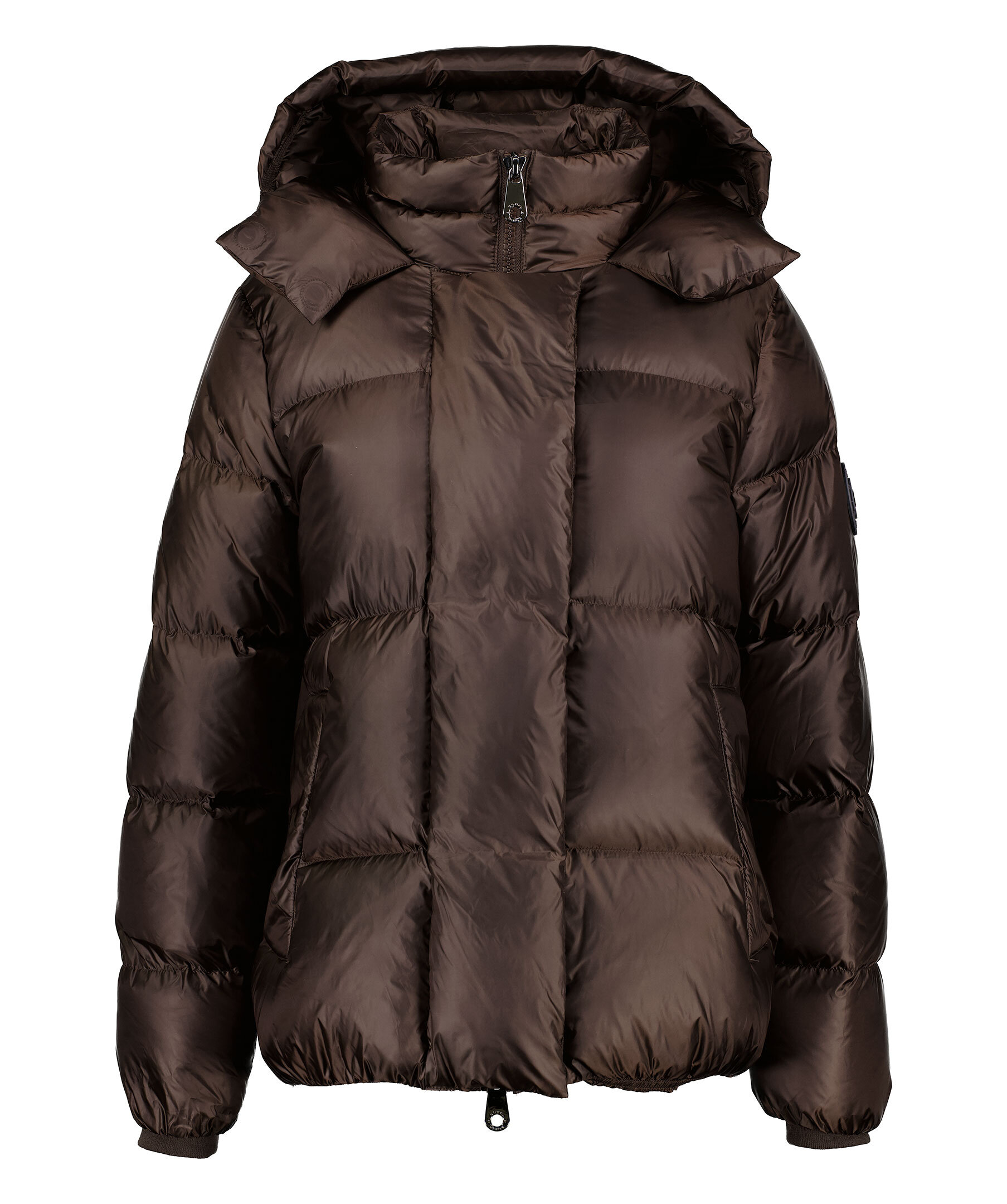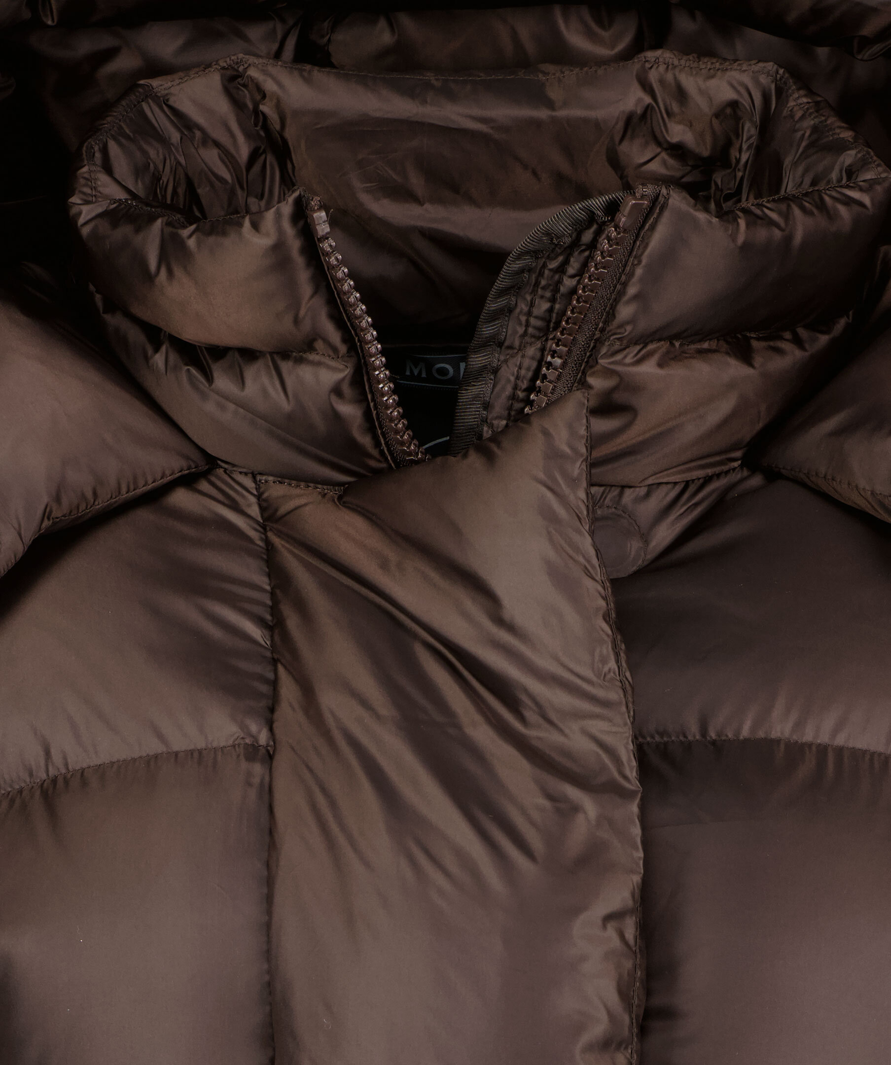 Mörkbrun pufferjacka från Monel. Yttermaterial nylontyg med glansig finish samt rak och oversize passform. Stängs med tvåvägsdragkedja och magneter, har två fickor i sidorna som stängs med tryckknapp och två innerfickor med dragkedja. Hög krage och luva, muddar i ärmslut samt patch i gummi med logotyp i metall på vänster ärm. Vi upplever att denna produkt är stor i storlek och rekommenderar att gå ner en storlek.