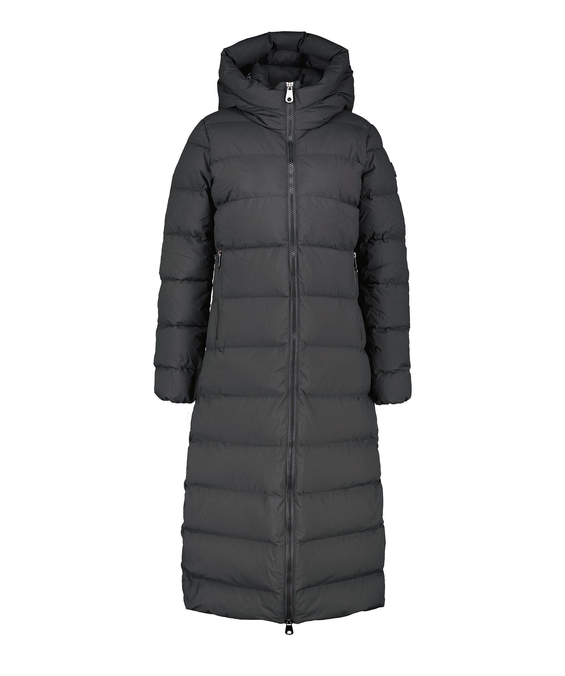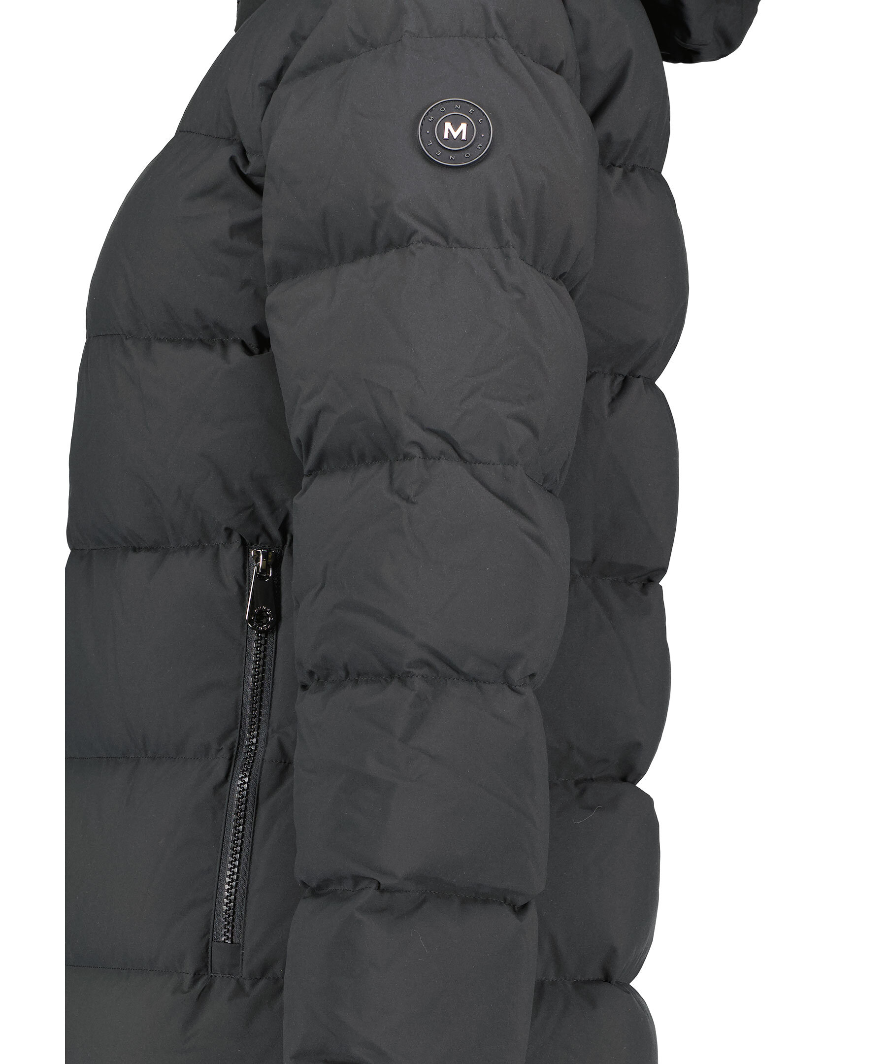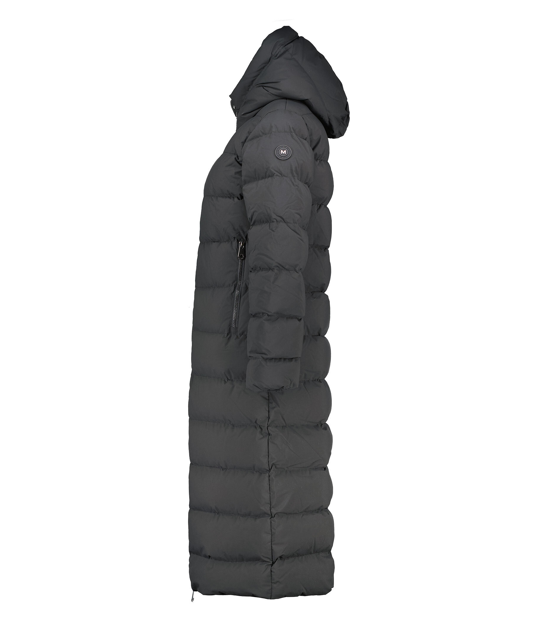 Svart lång jacka från Monel. Jackan har tvåvägsdragkedja, två sidfickor med dragkedja, en innerficka med dragkedja, hög krage med logotyp och huva samt liten logotyp i gummi och metall på vänster ärm. Tillverkad av polyester med dunstoppning.