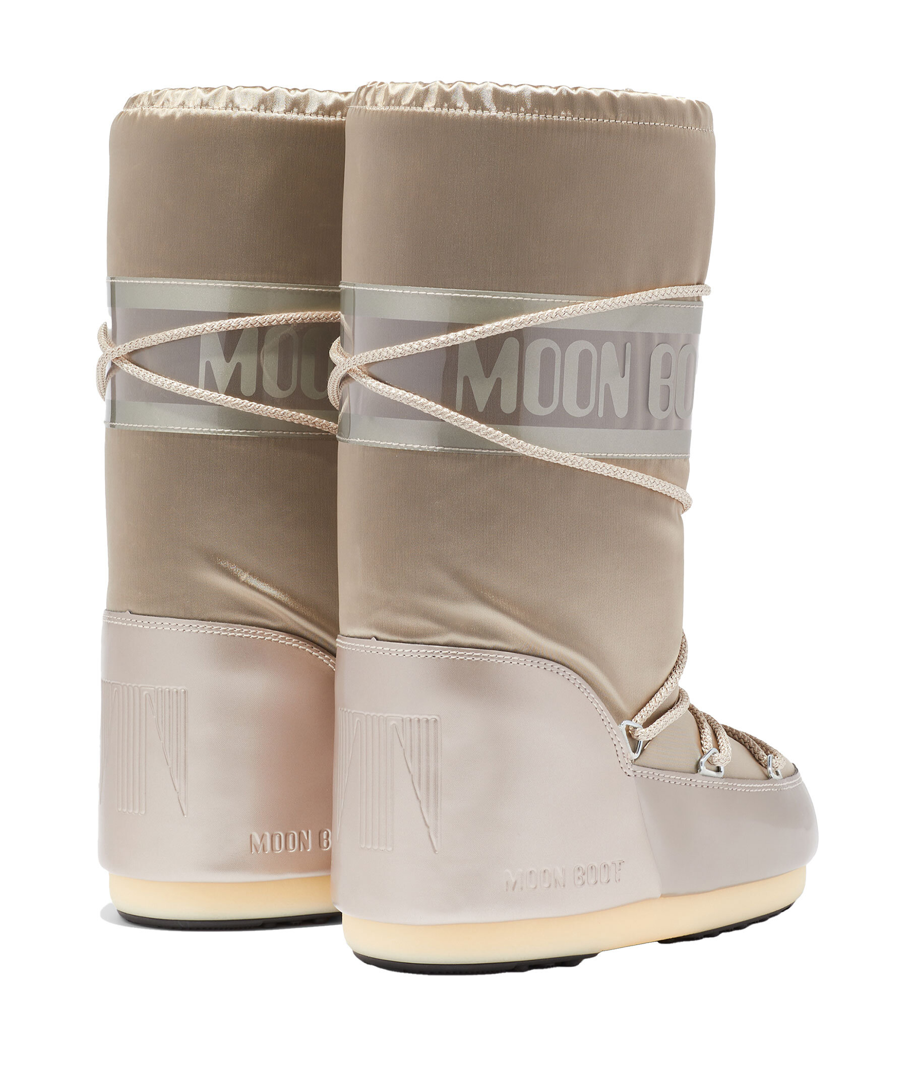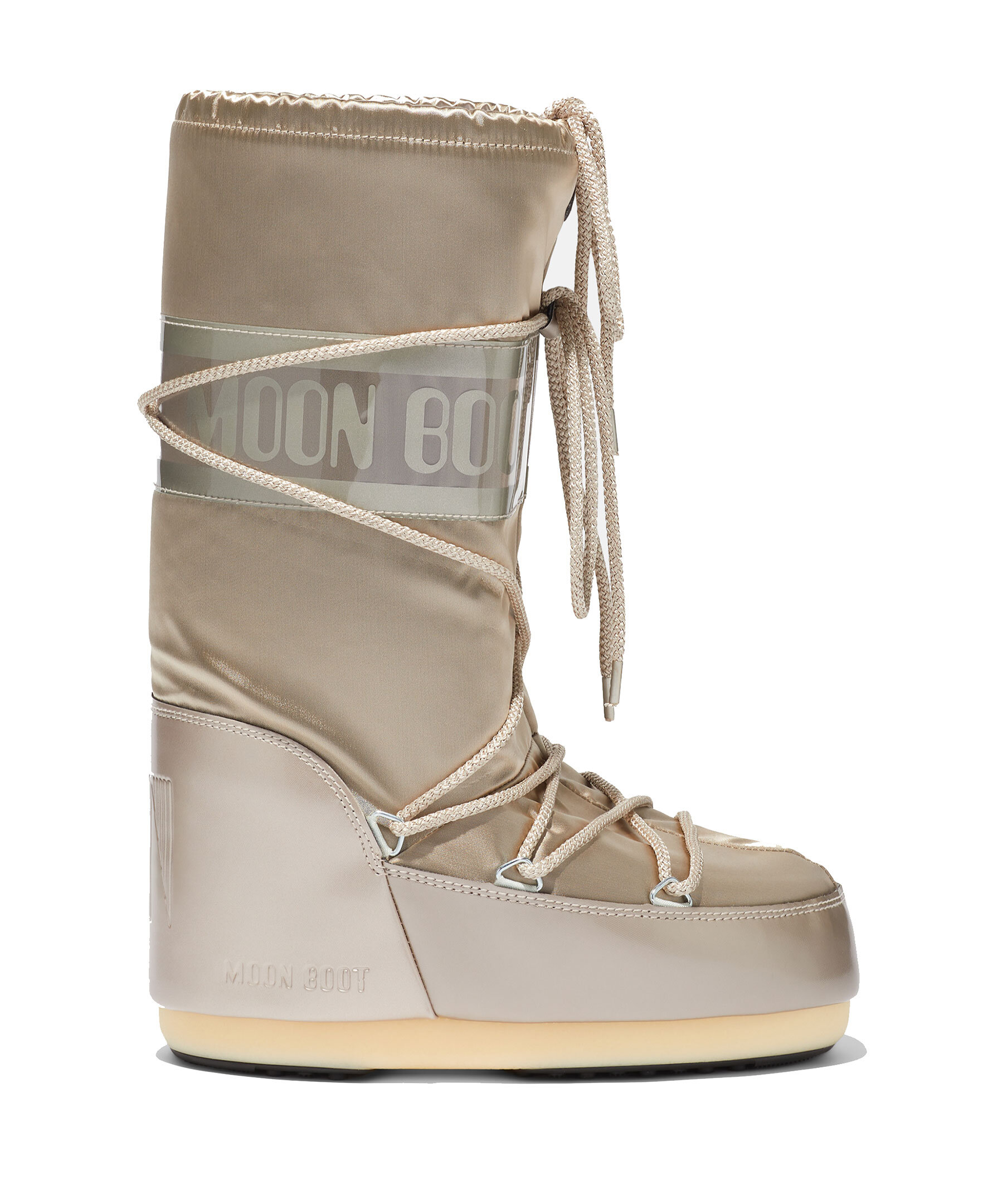 Beigea höga glansiga boots från Moon Boot. Skorna är isolerade och utrustade med en lätt mellansula samt sugkuddar på gummisulan som ger bättre markkontroll. Logotyp runt skon samt snörning framtill. Dragsko upptill. 100% vattenavvisande. Skorna är inspirerade av månlandningen 1969.