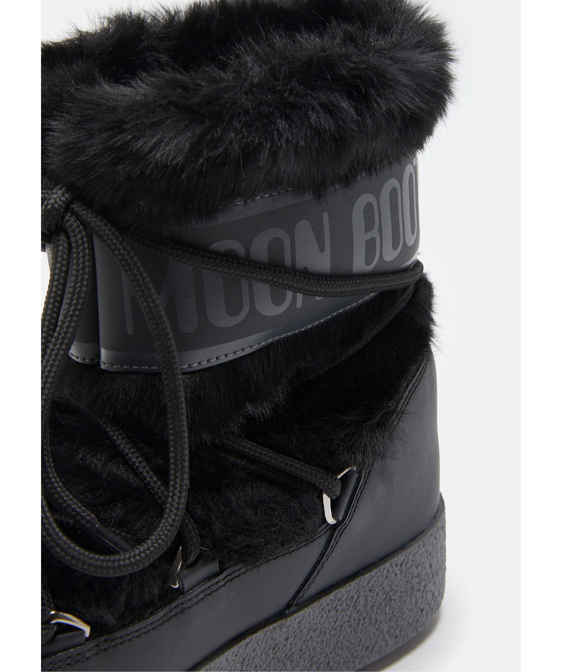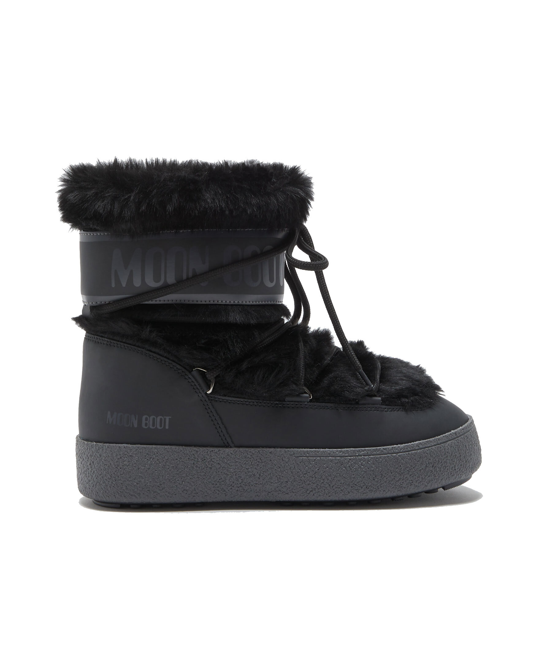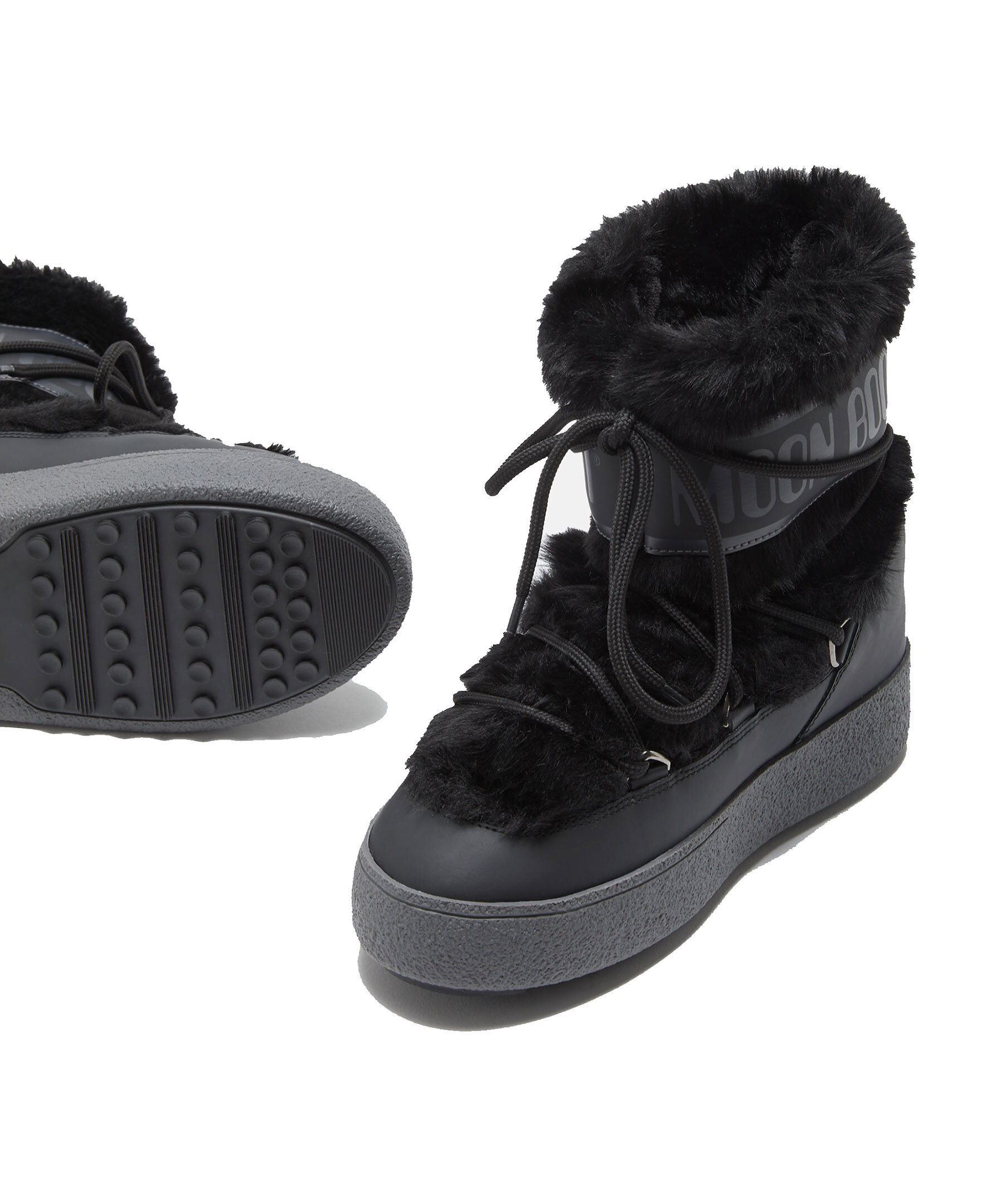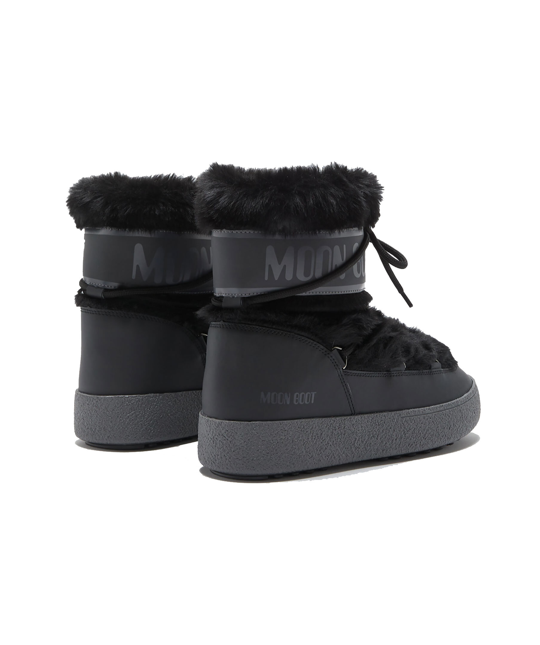 Svarta, fluffiga boots från Moon Boot i en låg modell. Skorna har en ovandel i mjuk fuskpäls och är isolerade och utrustade med en lätt mellansula samt sugkuddar på gummisulan som ger bättre markkontroll. Logotyp runt skon samt snörning framtill. Dragsko upptill. 100% vattenavvisande. Skorna är inspirerade av månlandningen 1969.