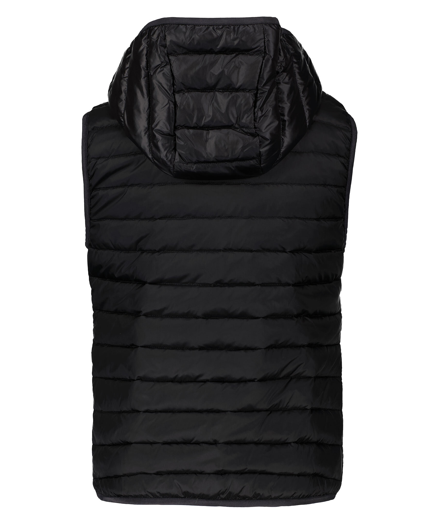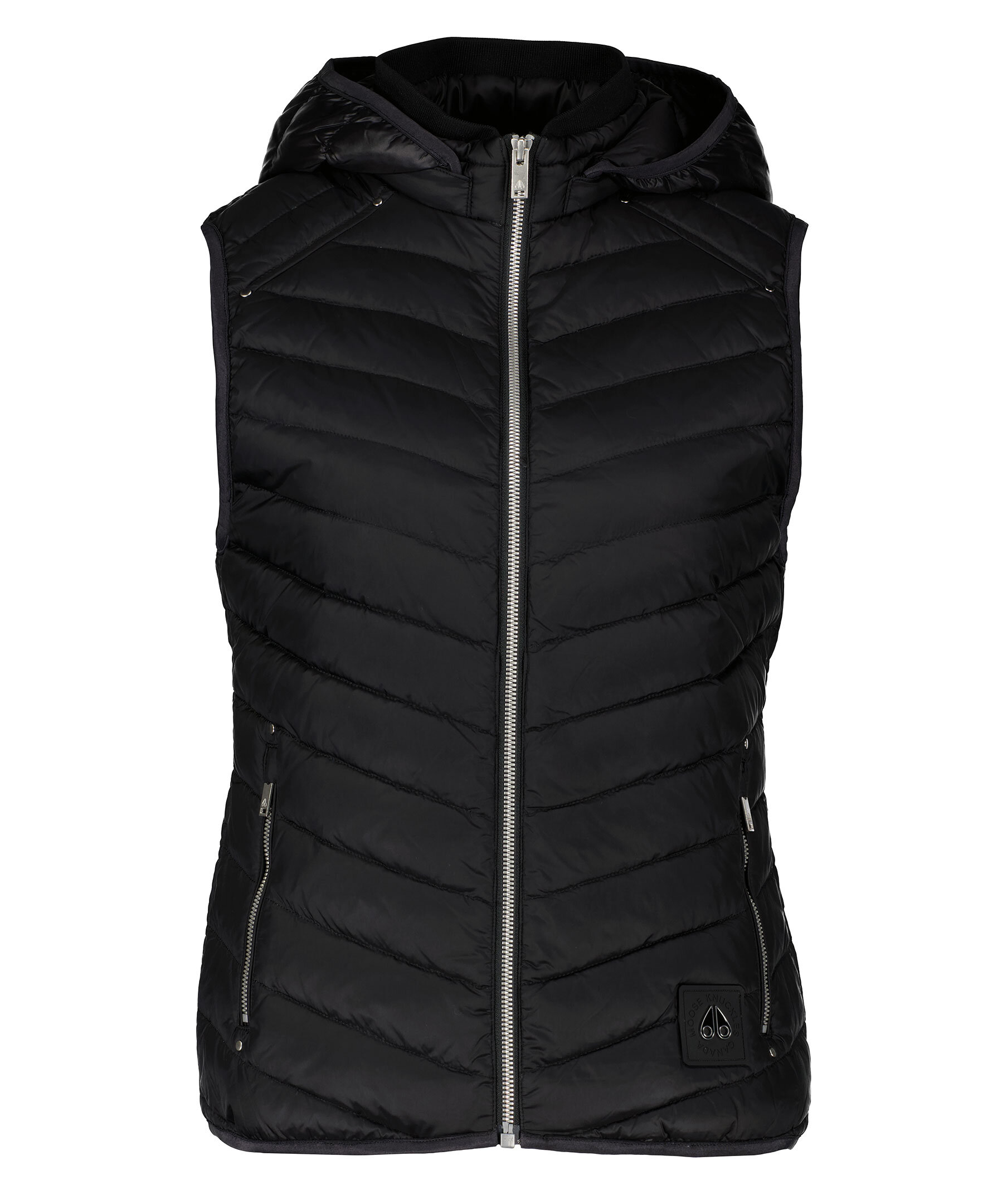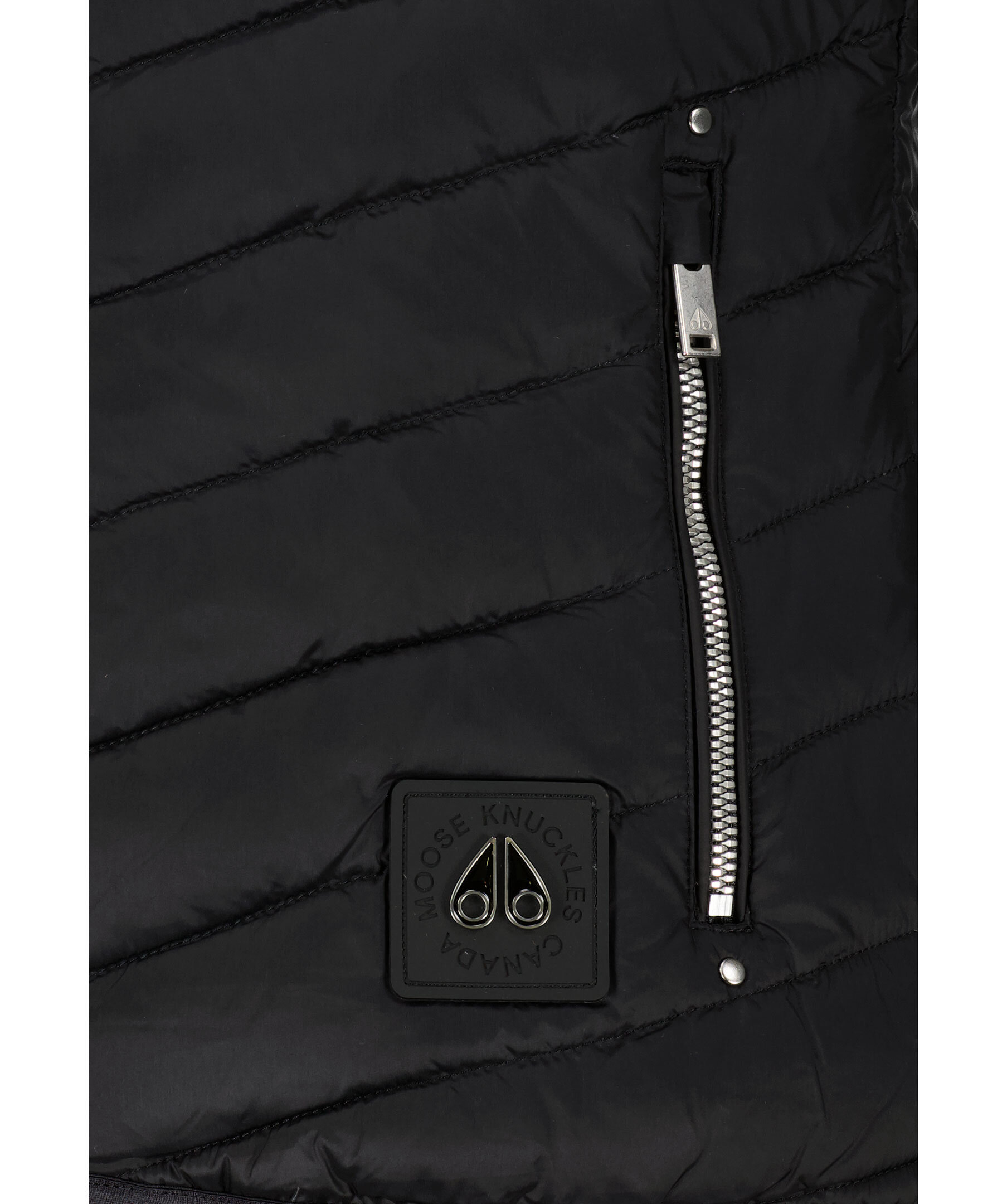 Svart quiltad väst med lätt fyllning från Moose Knuckles. Vatten avvisande och vind resistent. Slimmad passform, avtagbar luva med dragkedja och en kort krage. Patch i gummi med logotyp i silverfärgad metall på vänster framsida längst ner vid höften. Silverfärgad dragkedja fram, två framfickor med dragkedja i midjan och en innerficka med dragkedja. Svart mudd längst upp på kragen.