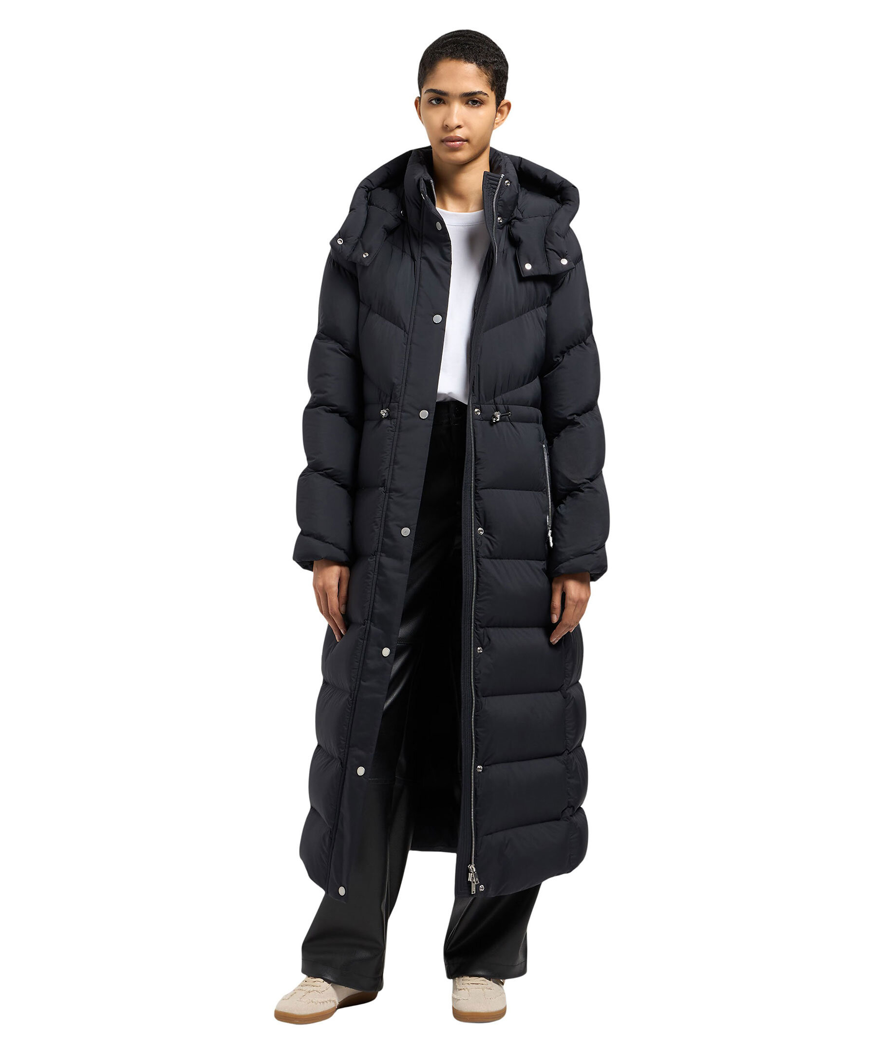 Lång, svart pufferjacka från Moose Knuckles. Jackan stängs med dold tvåvägsdragkedja och tryckknappar och har en avtagbar huva med dragsko, två sidfickor med dragkedja, två innerfickor med dragkedja och en dragsko i midjan för en mer figursydd passform. Patch med logotyp i metall på vänster ärm. Tillverkad i nylon med dunfyllning.