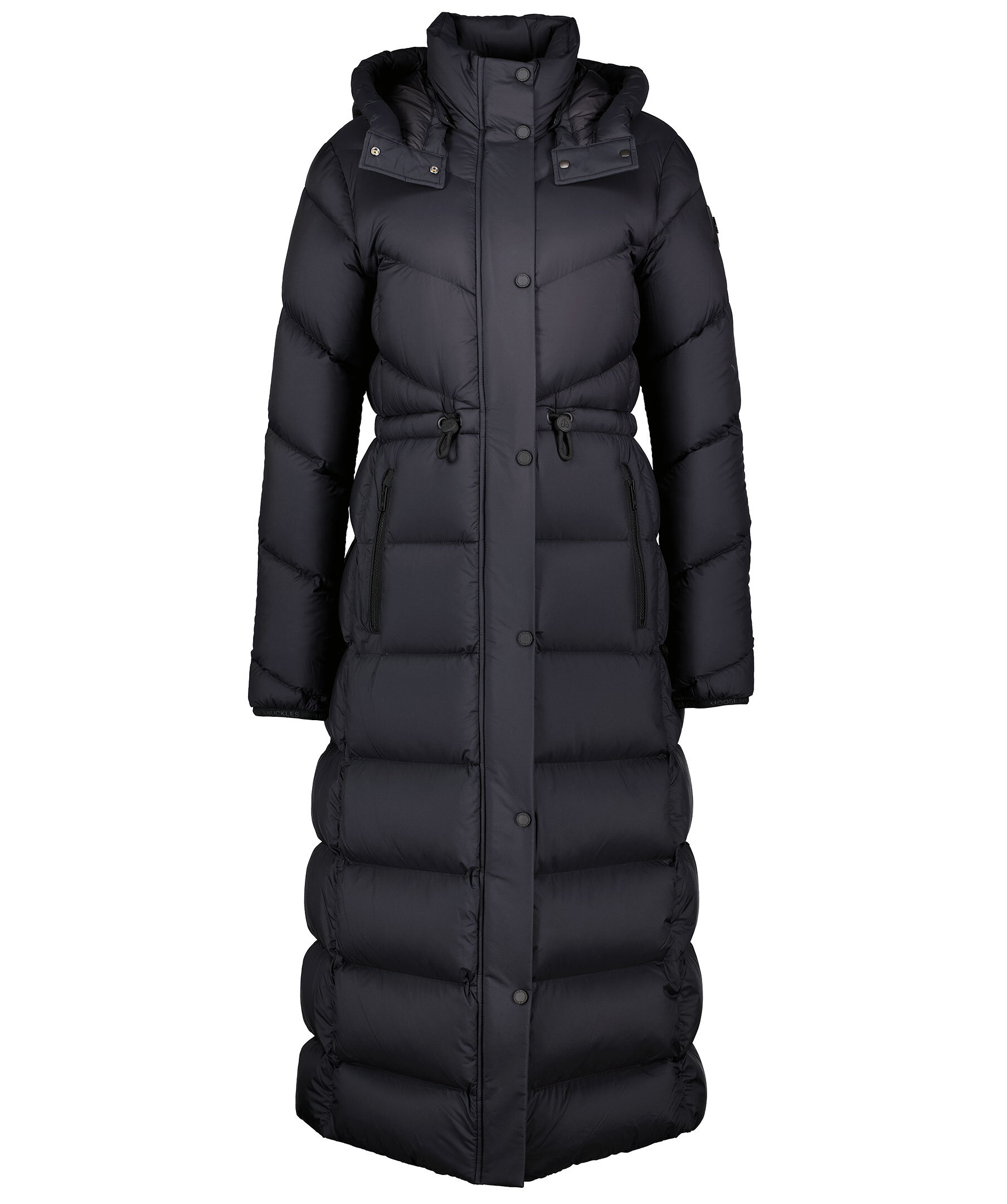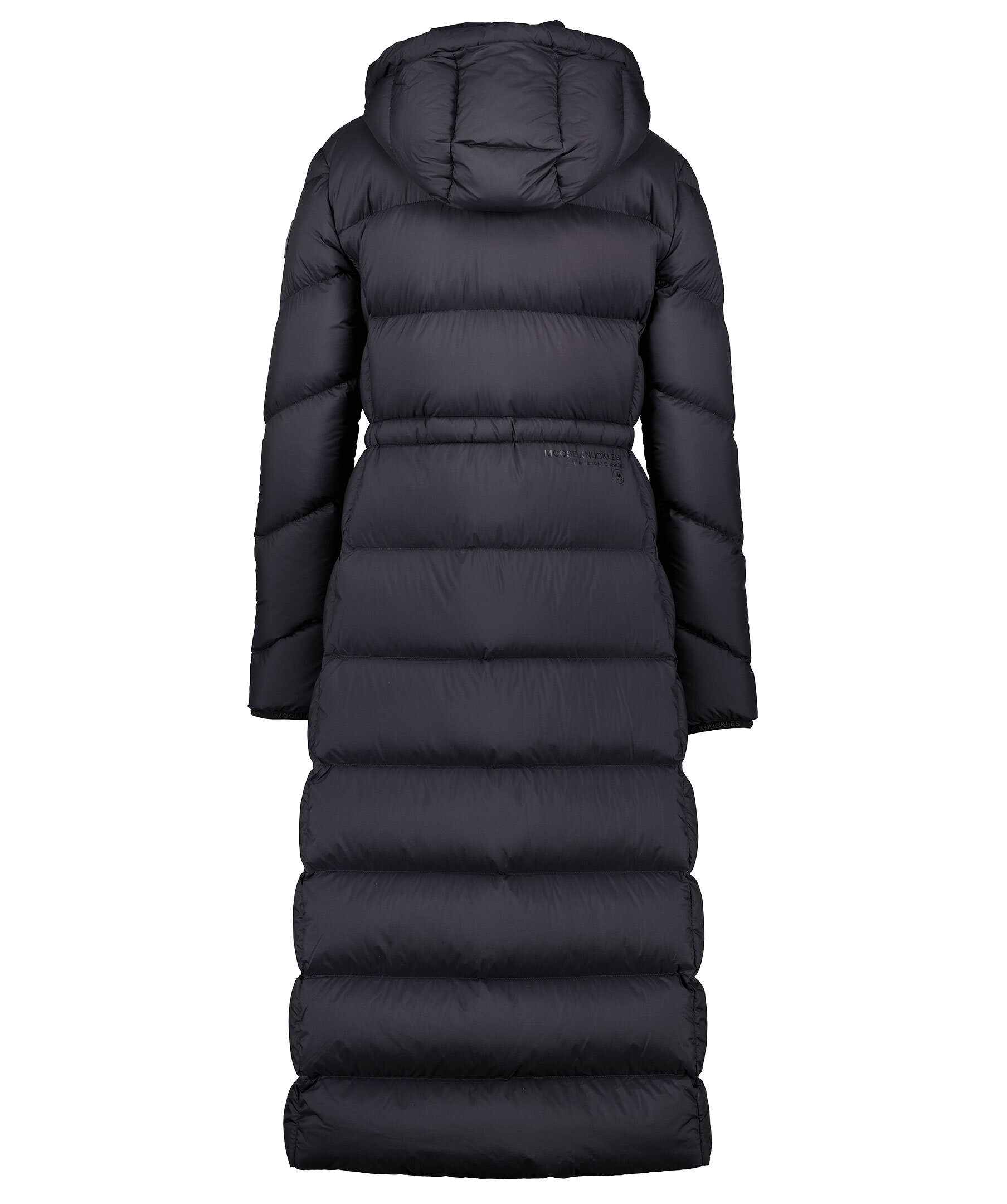 Svart lång dunkappa från Moose Knuckles. Löstagbar luva, dragsko i midjan, två fickor fram, två innerfickor.