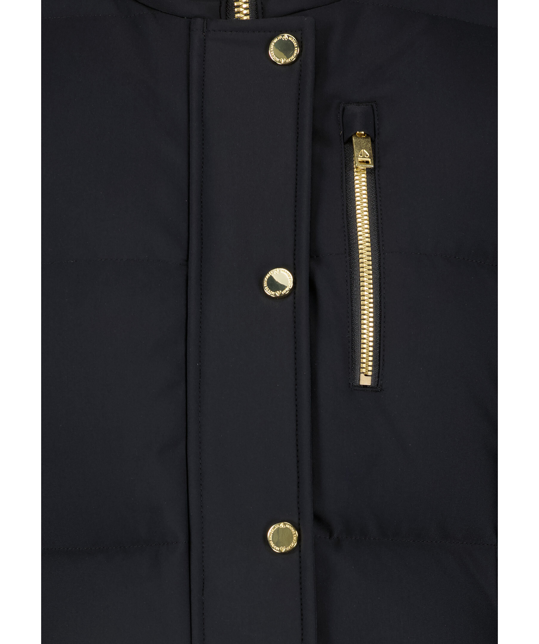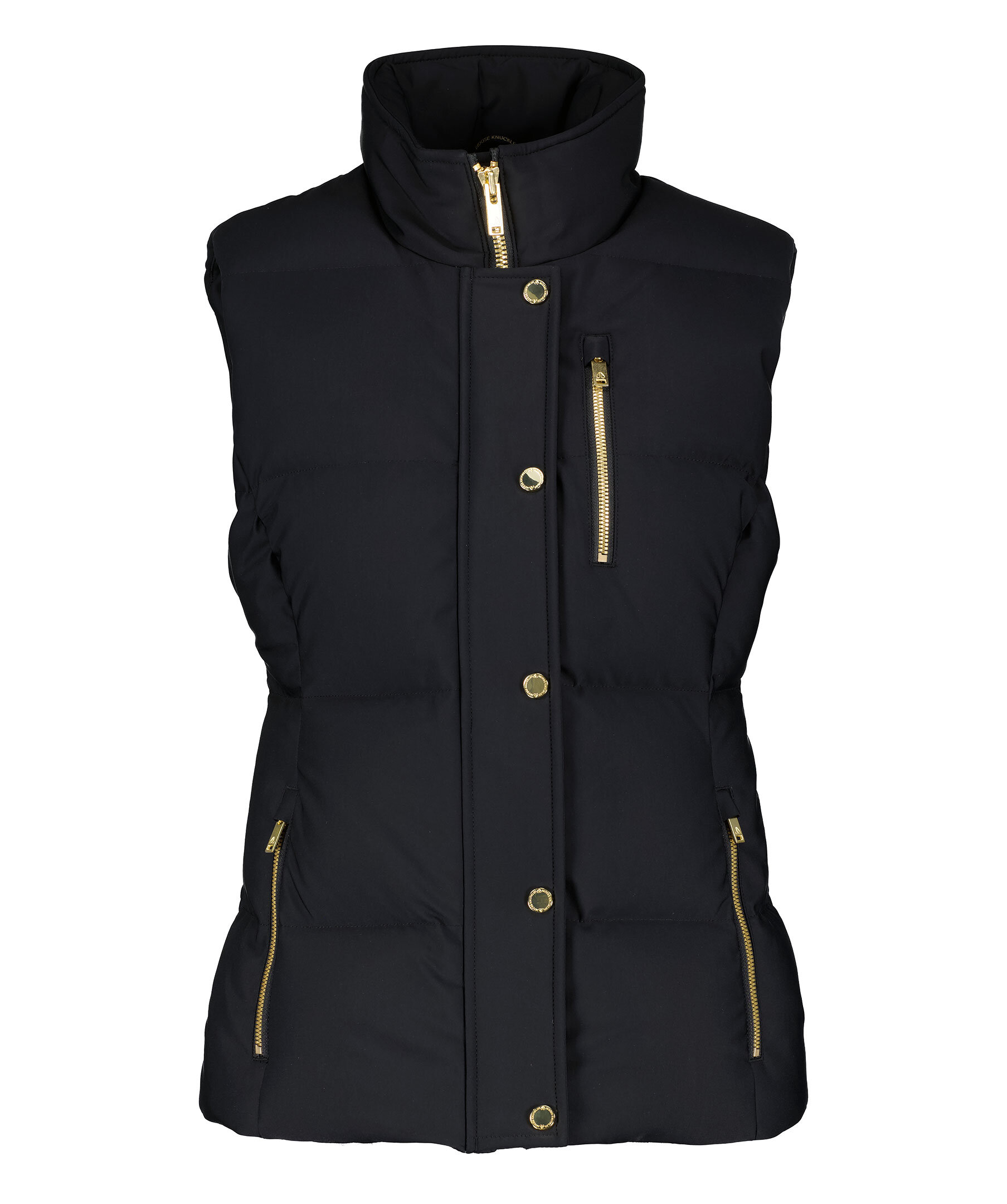 Svart quiltad dunväst från Moose Knuckles. Stängs framtill med dragkedja och tryckknappar. guldfärgade detaljer i metall. Tre fickor framtill som stängs med dragkedja. Två innerfickor som stängs med dragkedja.