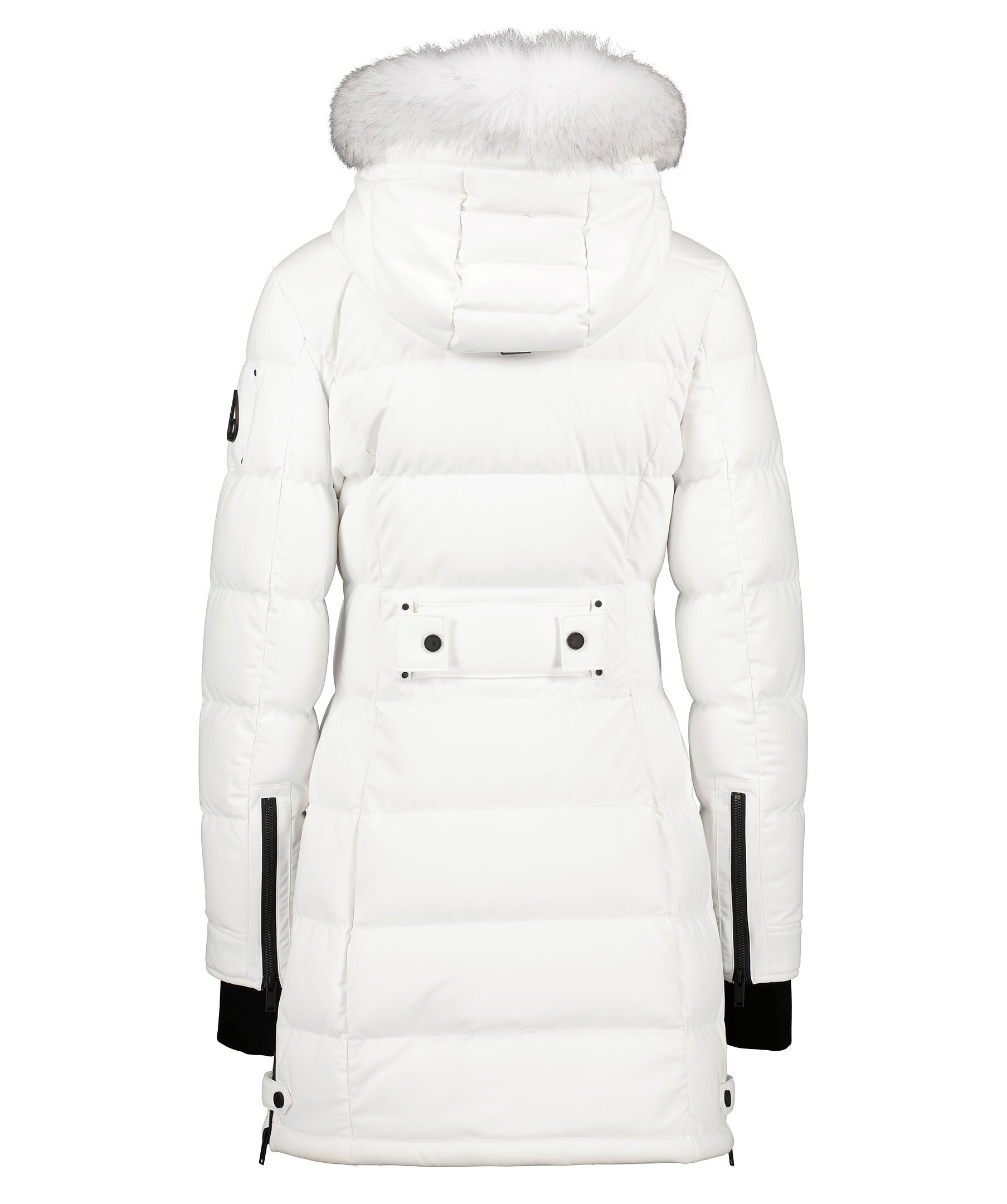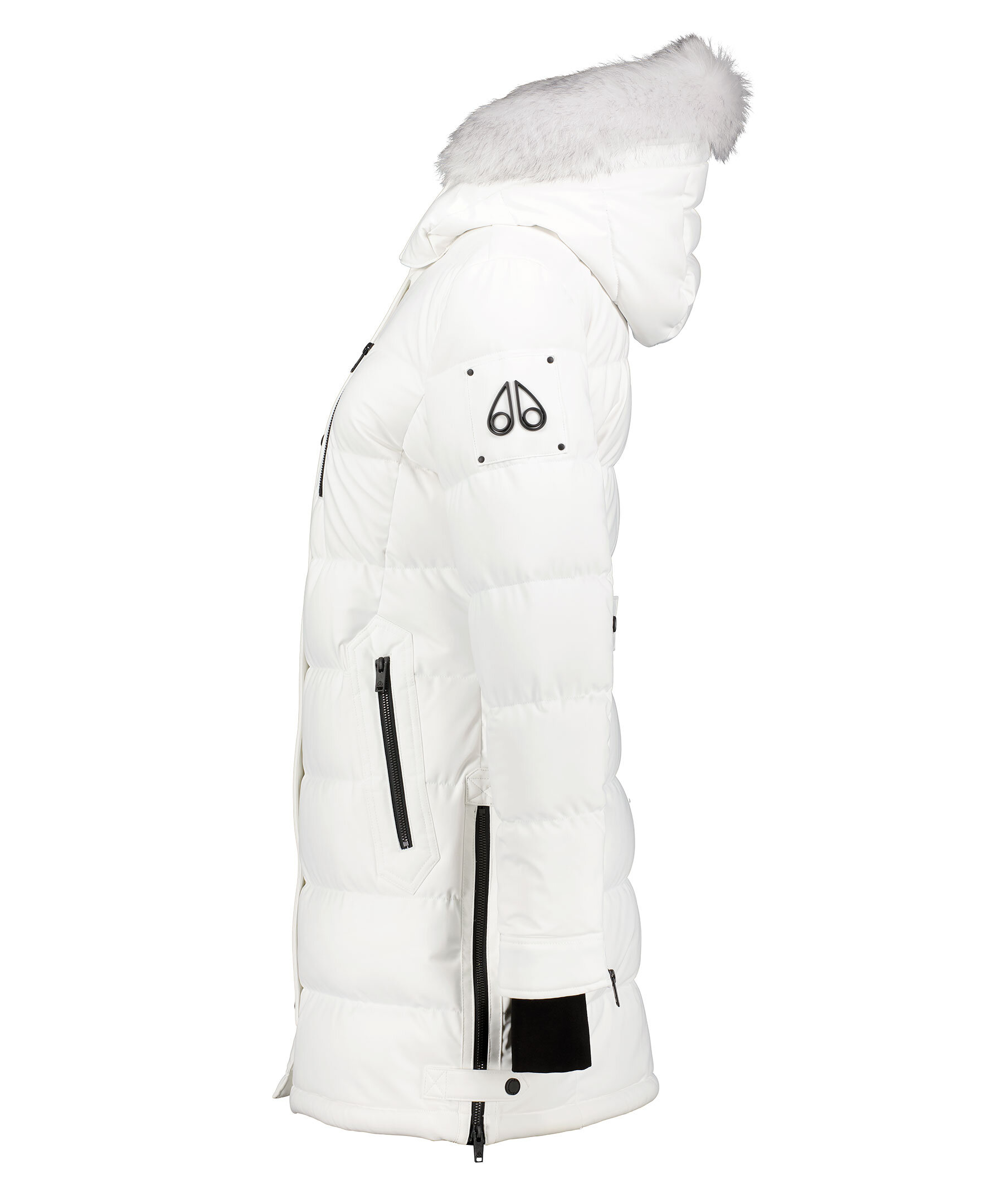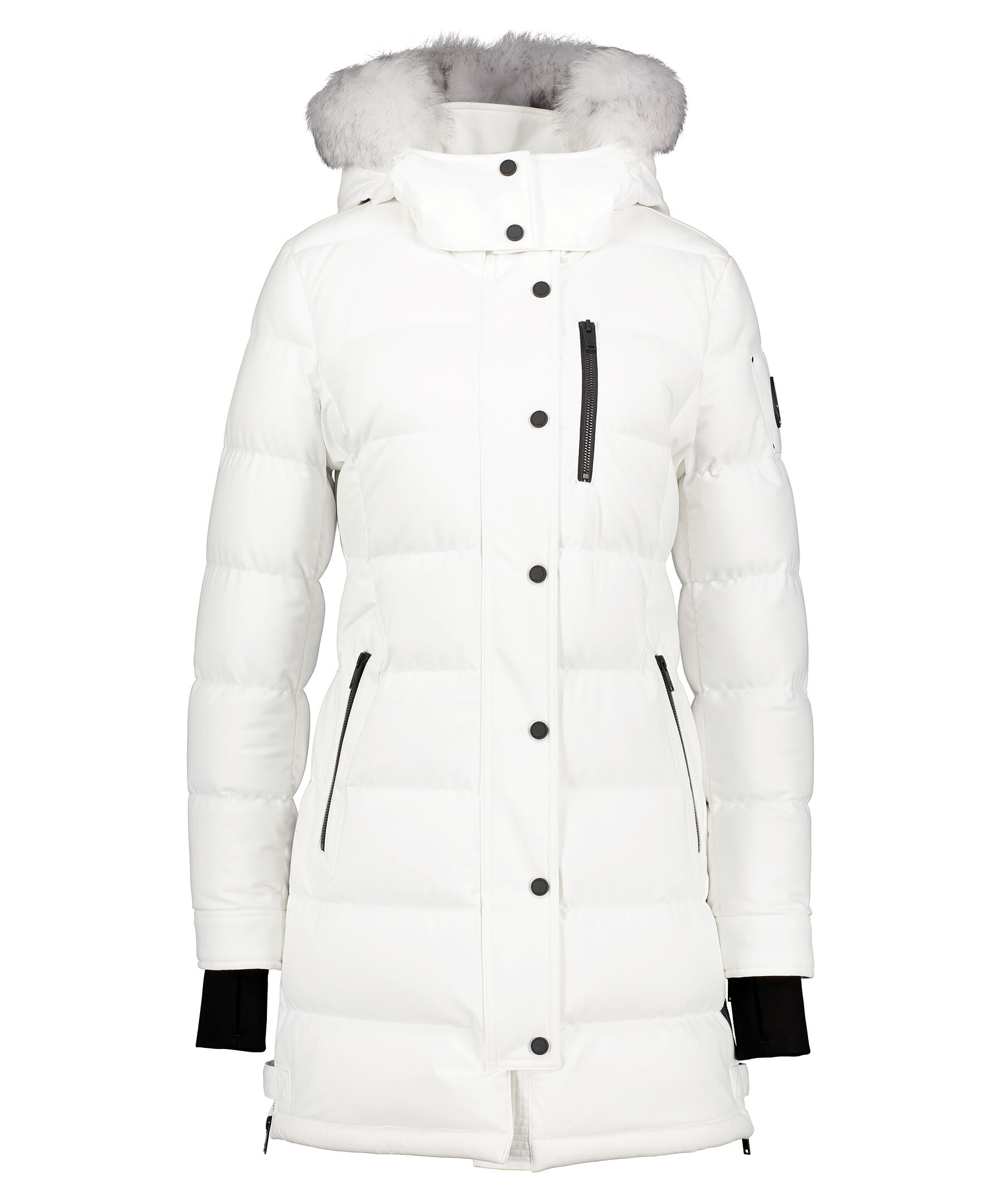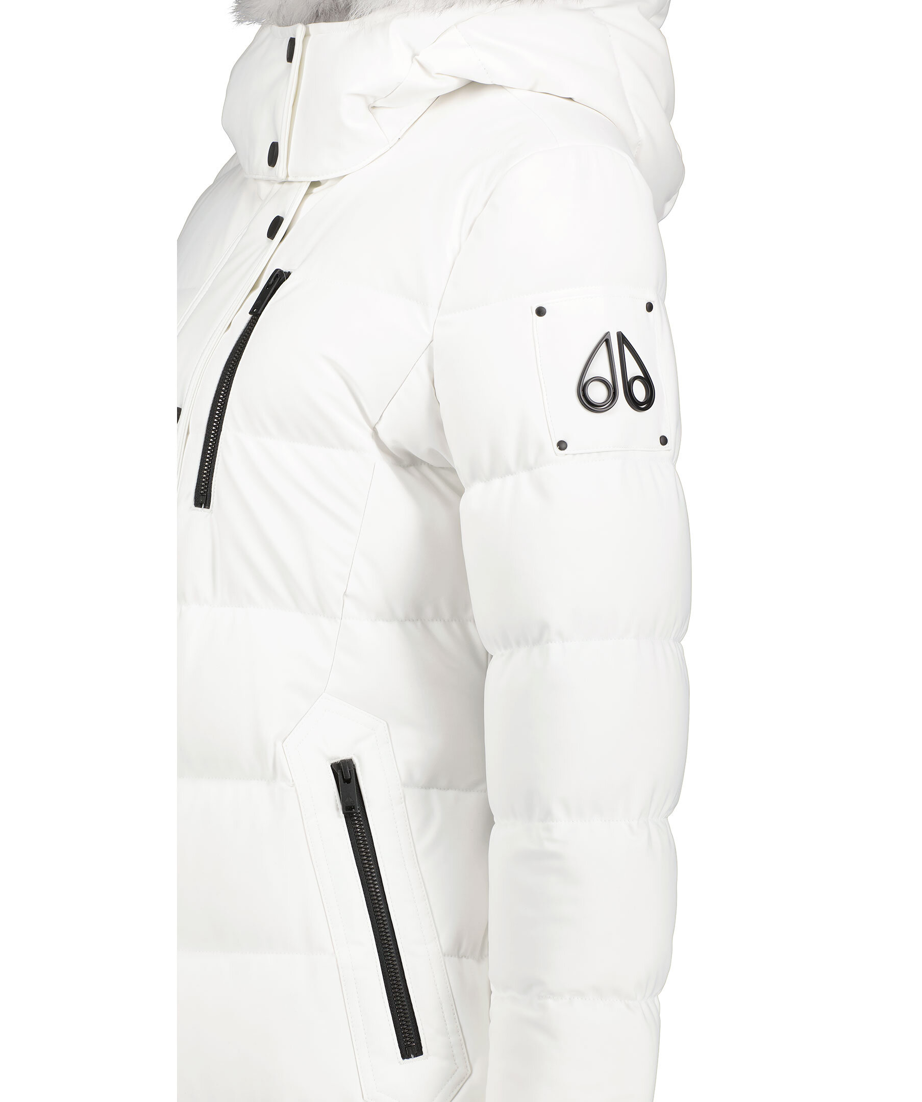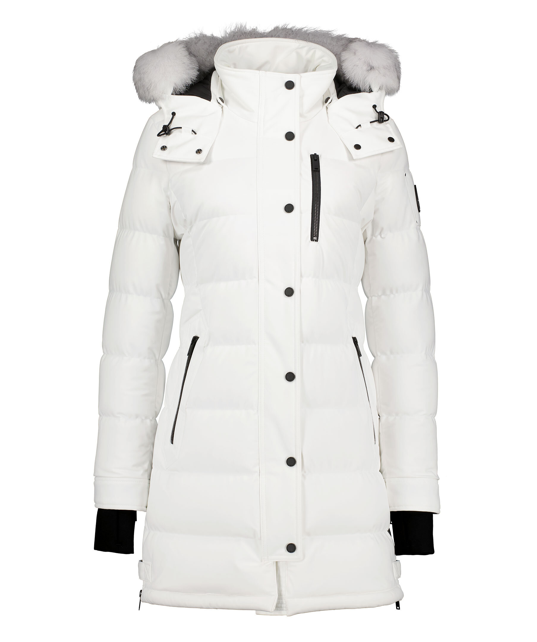Vit quiltad dunparka från Moose Knuckles. Stängs framtill med tvåvägsdragkedja och tryckknappar. Två snedställda fikcor framtill som stängs med dragkedja, bröstficka som stängs med dragkedja. Juster- och avtagbar luva med pälskrage. Patch med logotyp i metall på vänster ärm. Elastisk mudd vid ärmslut. Dragkedja på sidorna vid jackslut.