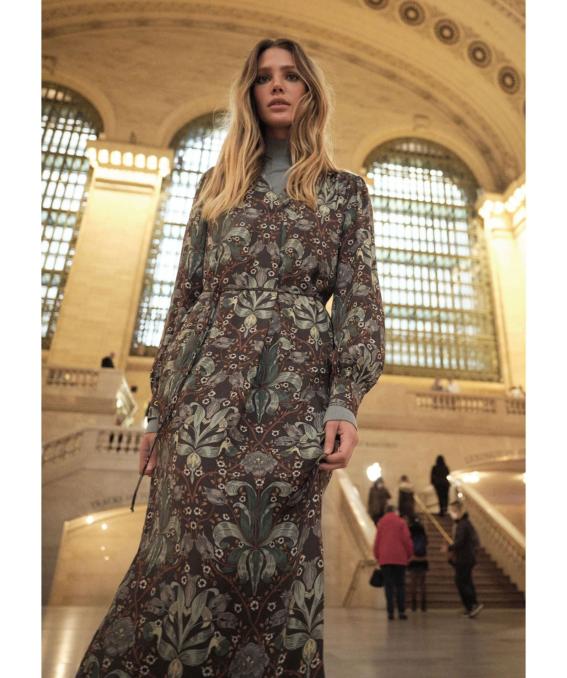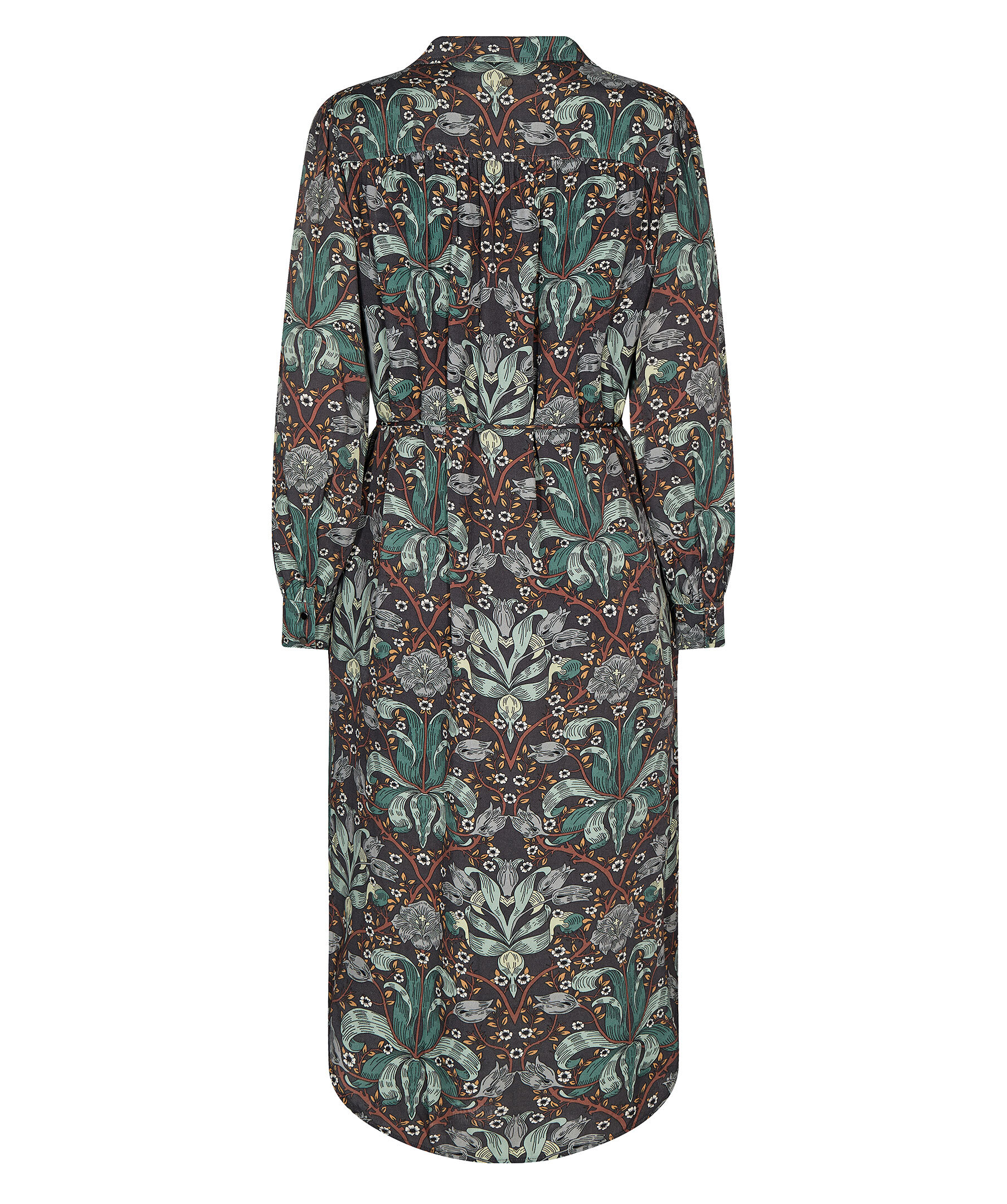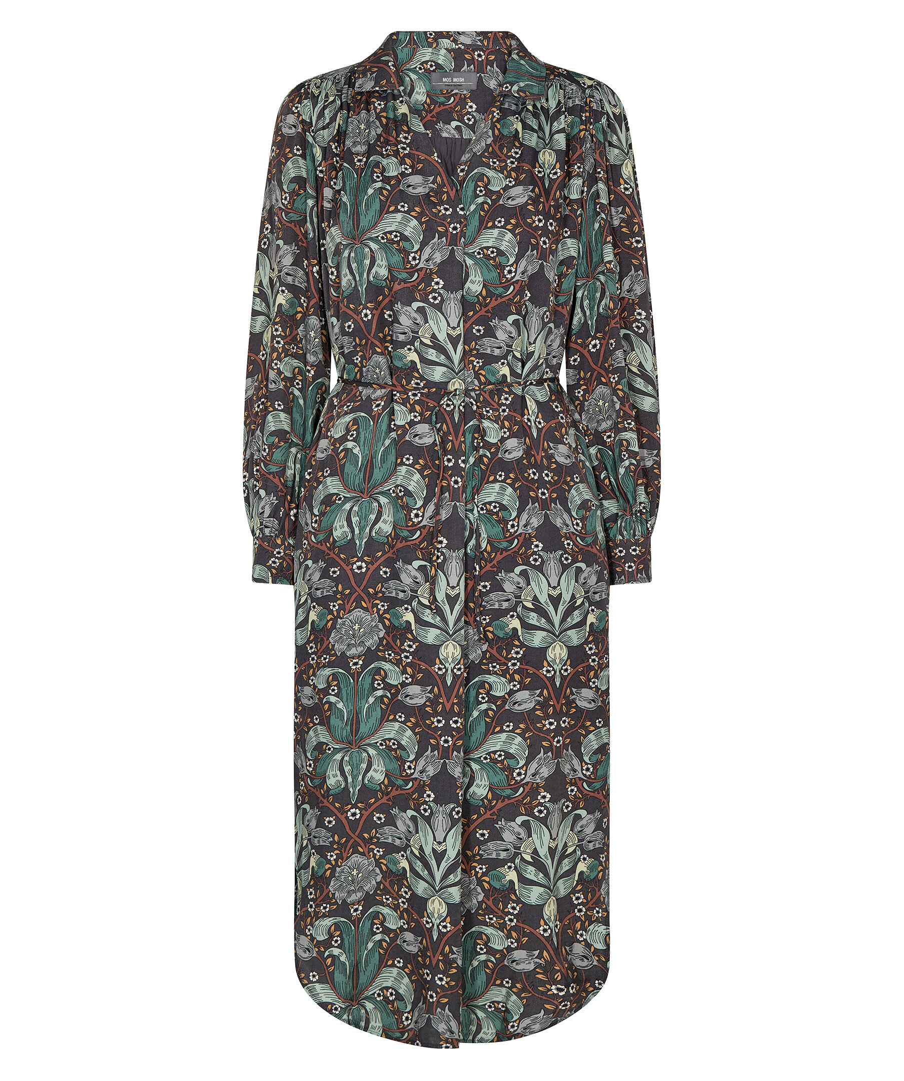 Duvblåa, feminin klänning med blommigt tryck från Mos Mosh. Den är designad i en lite avslappnad siluett med långa ballongärmar, böjd fåll och ett matchande bälte för att framhäva midjan. Den har vackra veck fram och bak som ger den en vacker effekt.