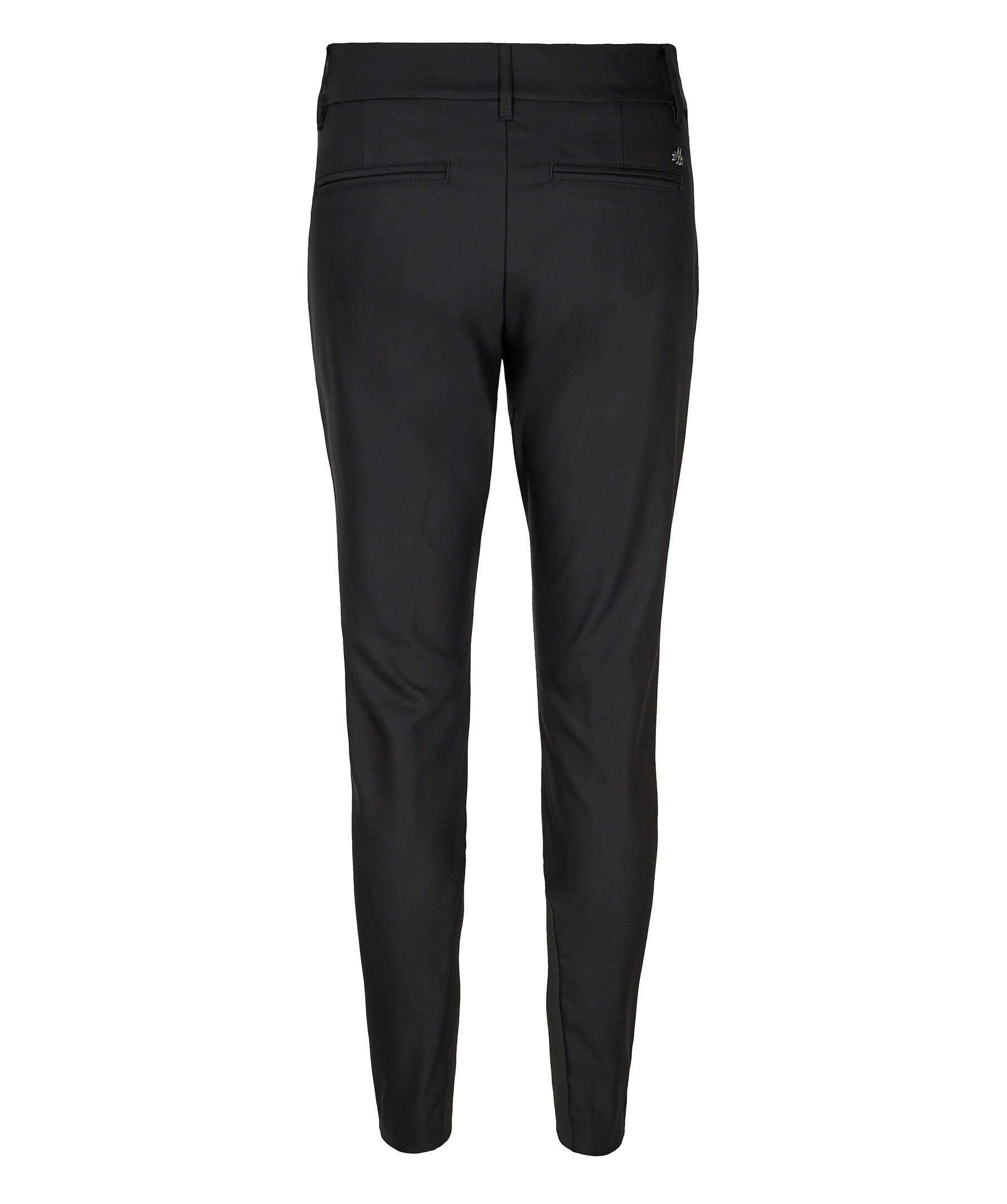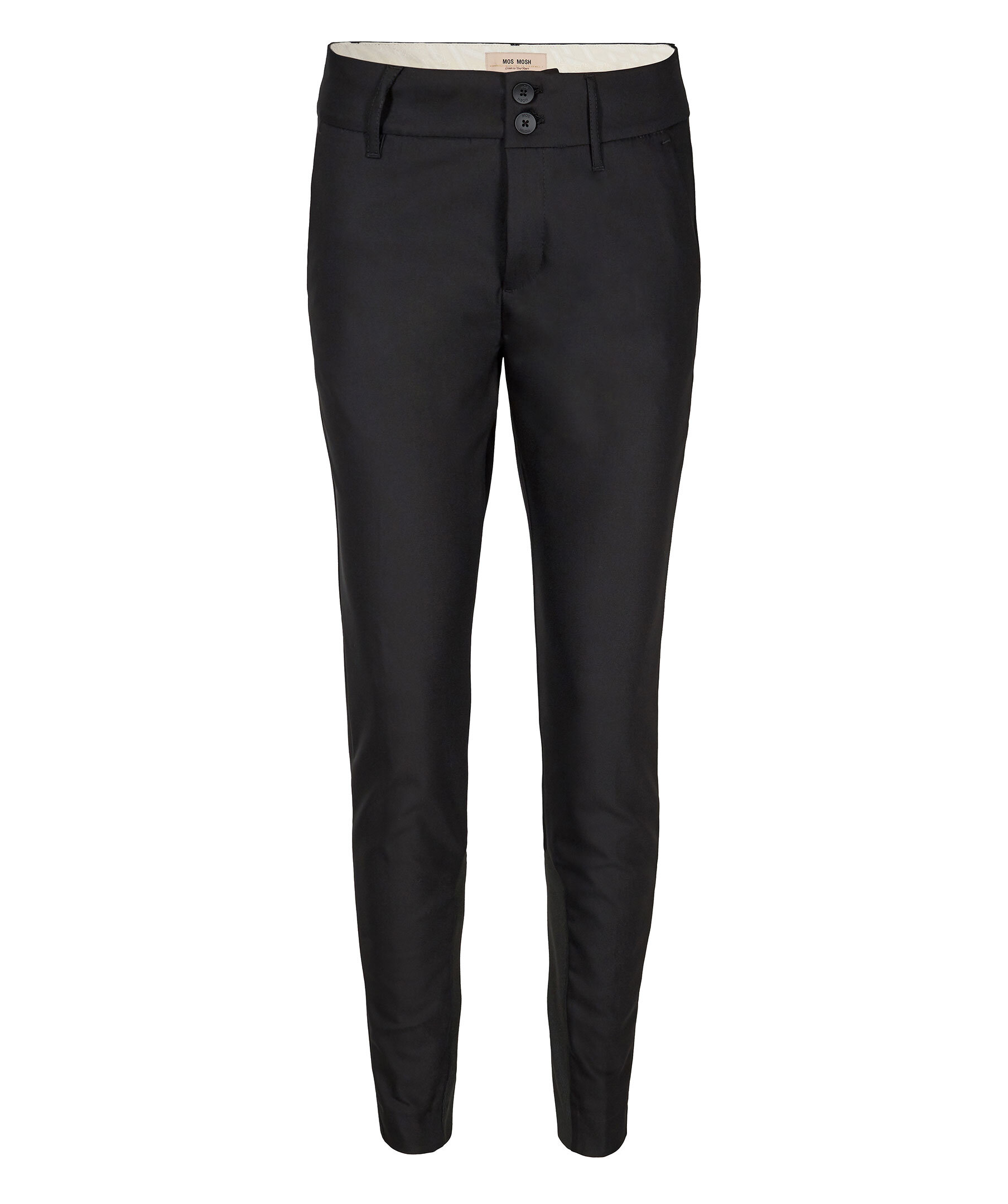 Svarta kostymbyxor från Mos Mosh. Den bästa känslan i världen kanske bara är byxor som ser smarta ut men har den bekväma känslan av träningsbyxor! Dessa är i avsmalnande passform med låg/hög resning, beroende på hur du bär dem. Designad med en skrynkelbeständig finish, gjord för att bäras hela dagen. Ribb i fållen för en chic men ändå sportig känsla.