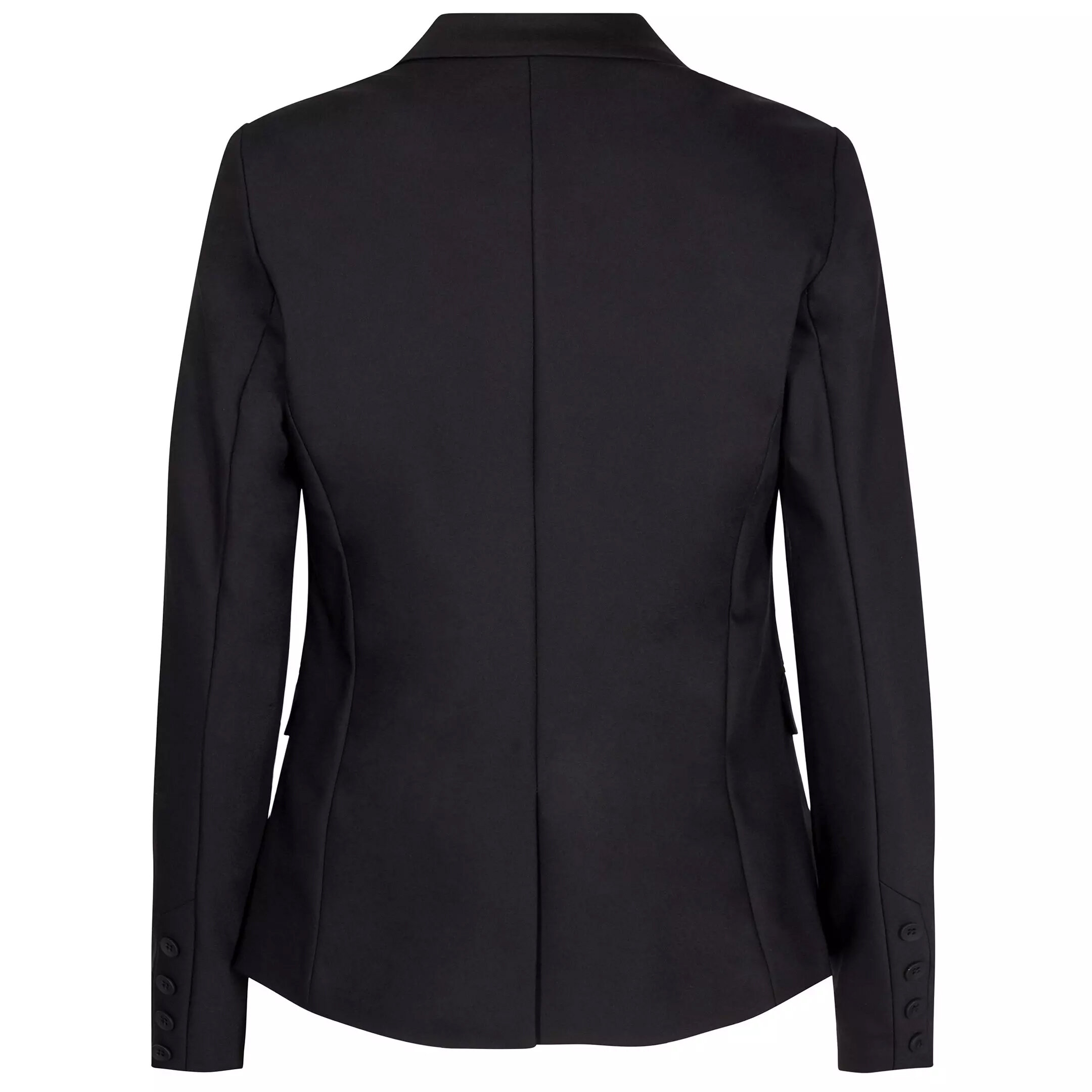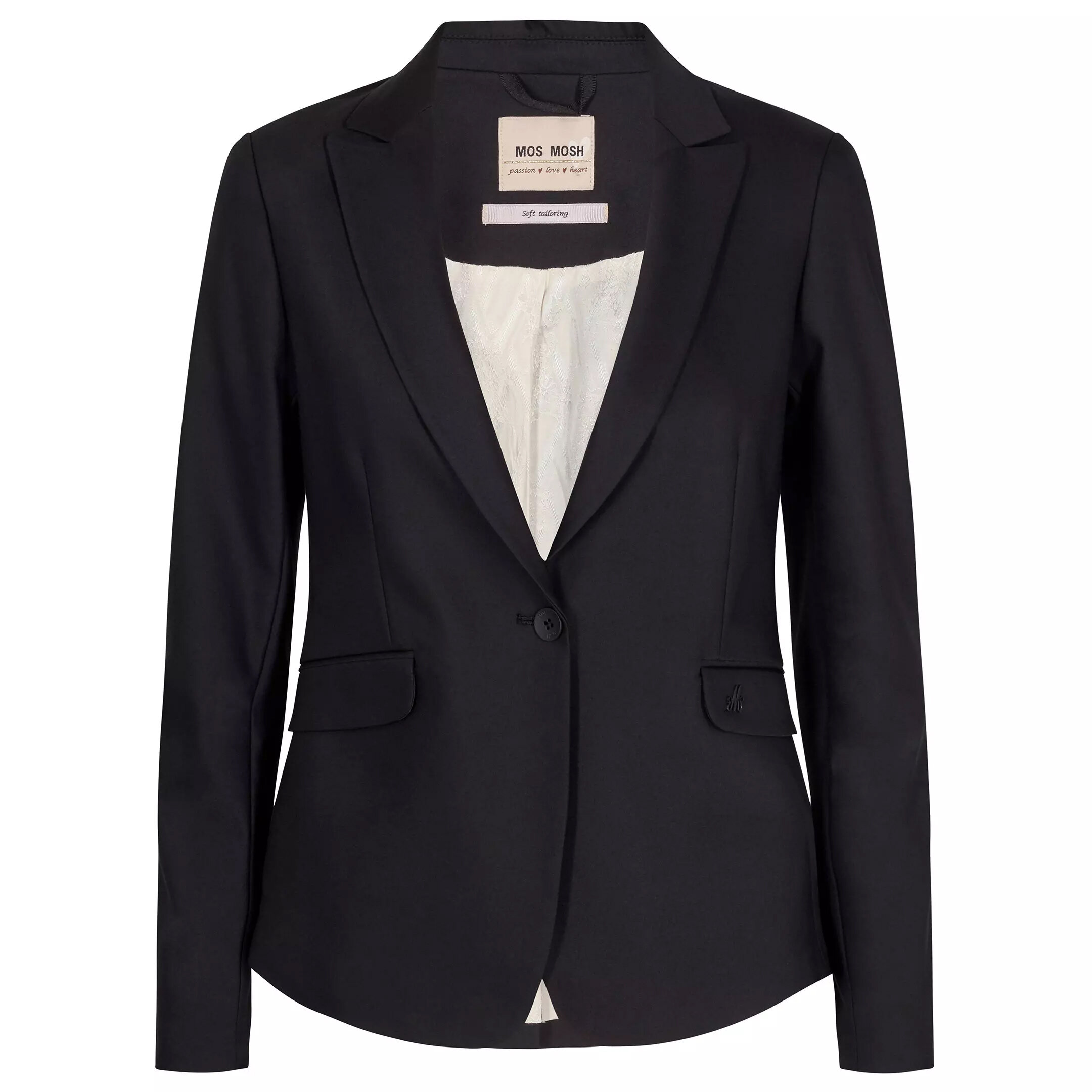 Svart kavaj från Mos Mosh tillverkad i stretchig bomull och återvunnen polyamid. Långärmad med fyra knappar längs ärmslut och stängs med en knapp i mitten fram. Två framfickor med lock.
