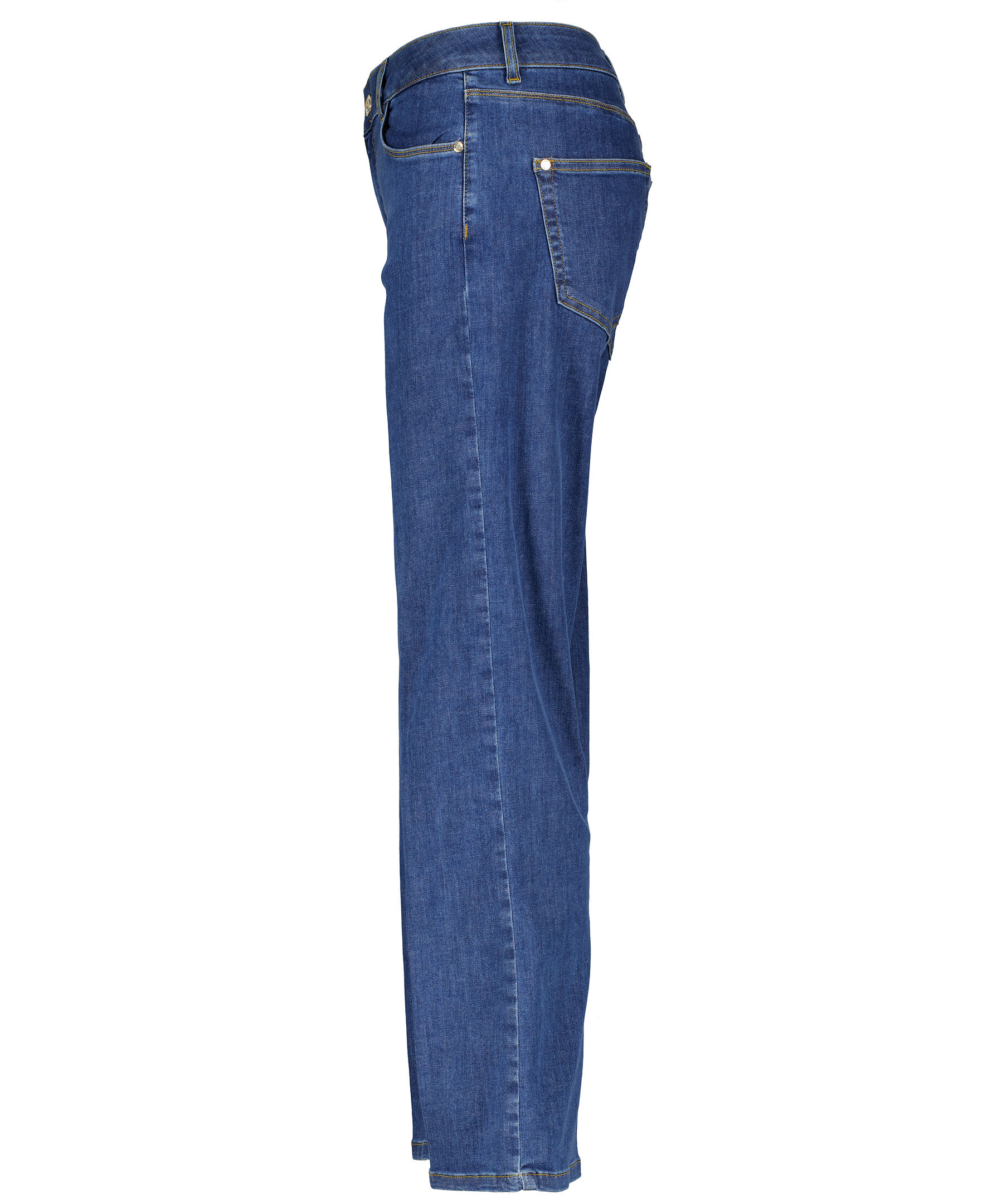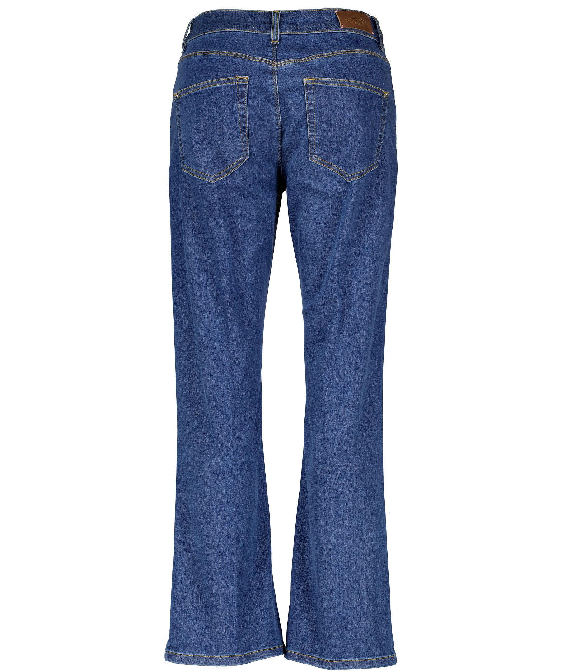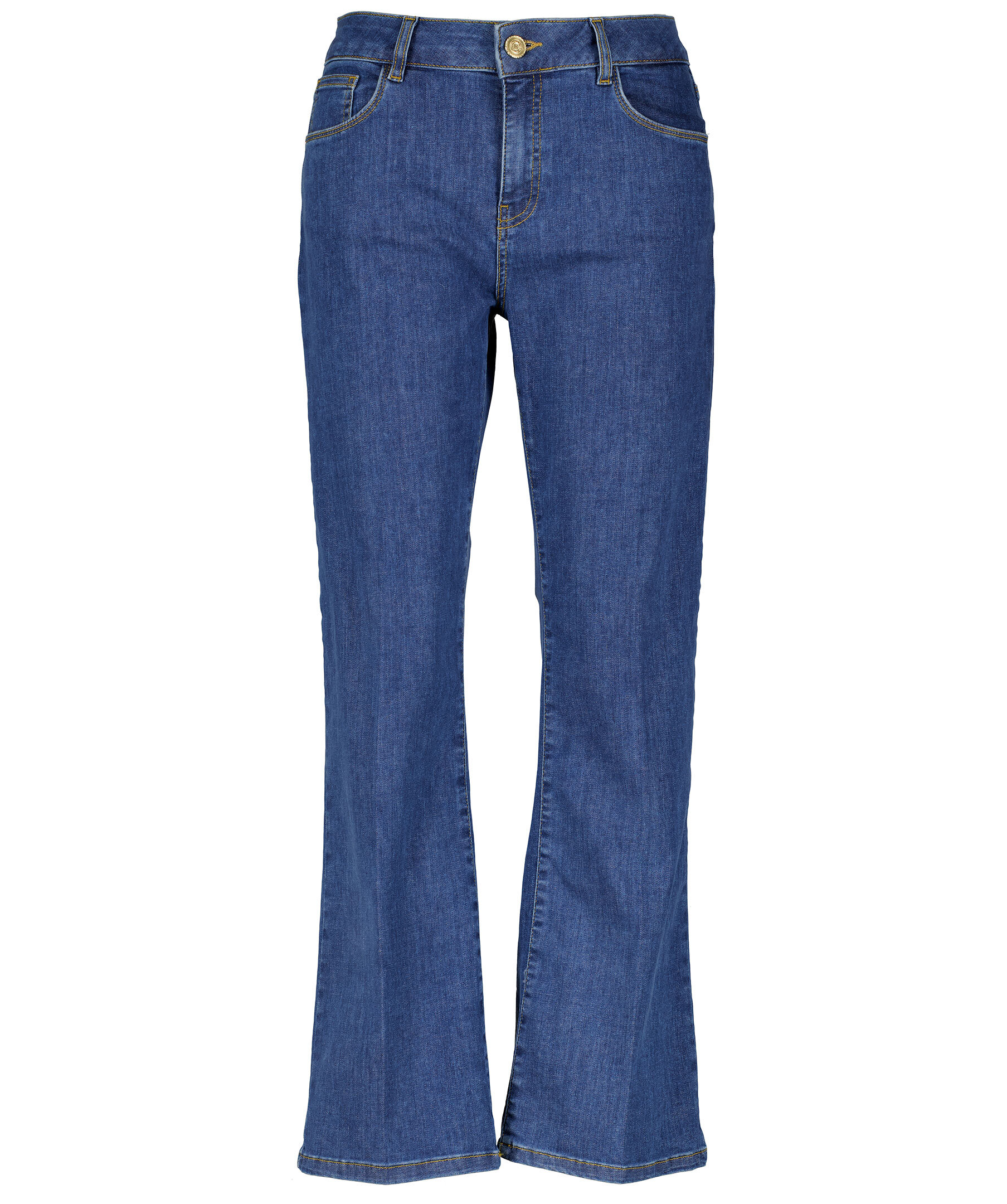 Blåa, avslappnade jeans från Mos Mosh i fem ficks modell. Hög midja med utsvängda croppade ben. Tvätten är en mellanblå denim. Guldfärgade nitar och dold gylf med dragkedja och guldfärgad knapp med logotyp på. Etikett med logotyp bak i midjan. Tillverkad i stretchig bomullsblandning. * Hällor för bälte * Stentvätt * Raka och croppade ben