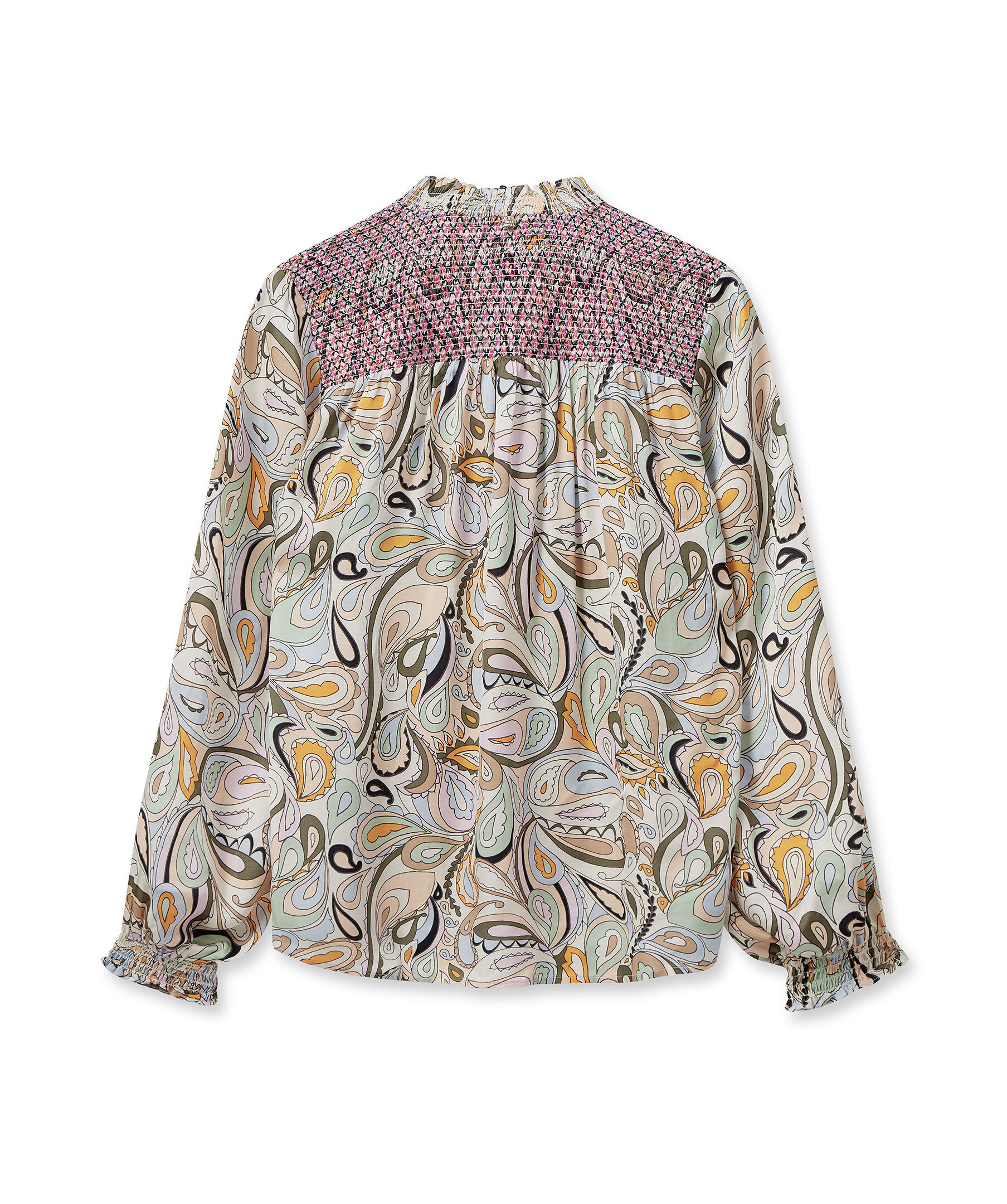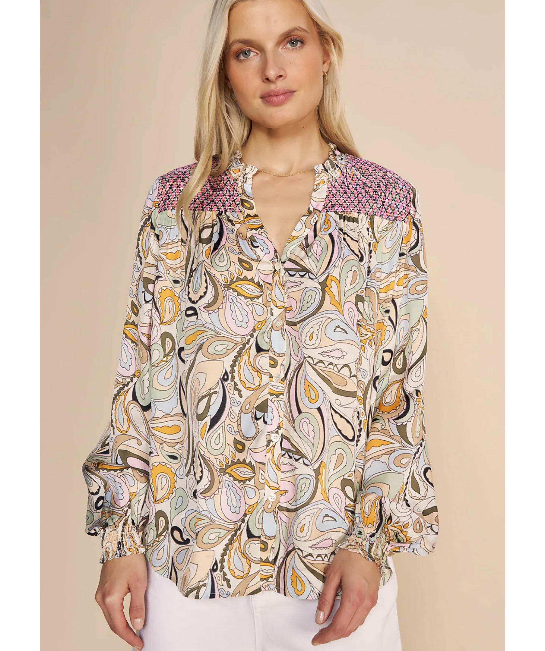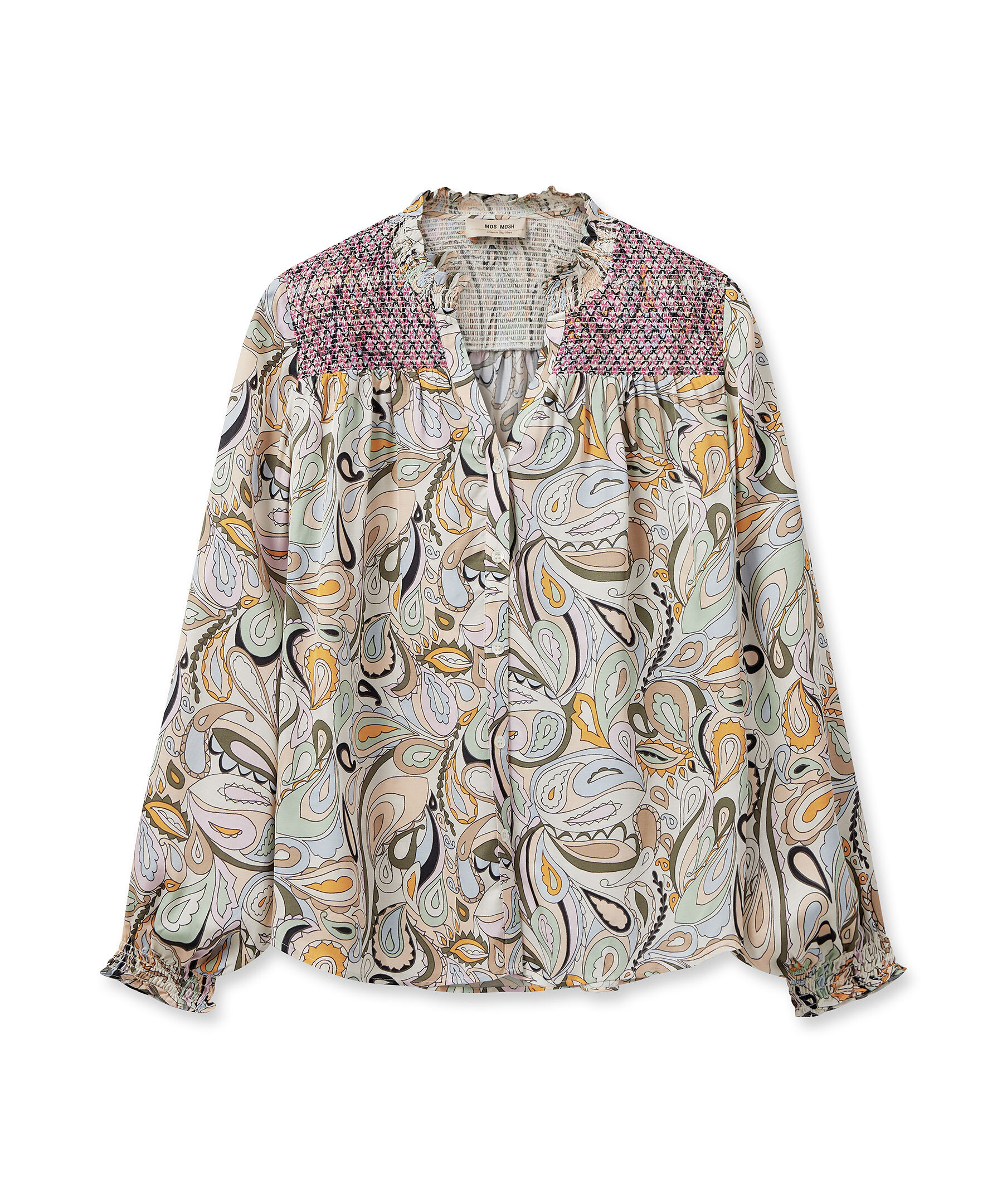 Multifärgad, mönstrad blus från Mos Mosh. Knappstängning framtill, kontrastfärgade smockdetaljer på axlar och smockdetaljer vid ärmslut. Tillverkad av mjuk viskos och designad i en avslappnad siluett.