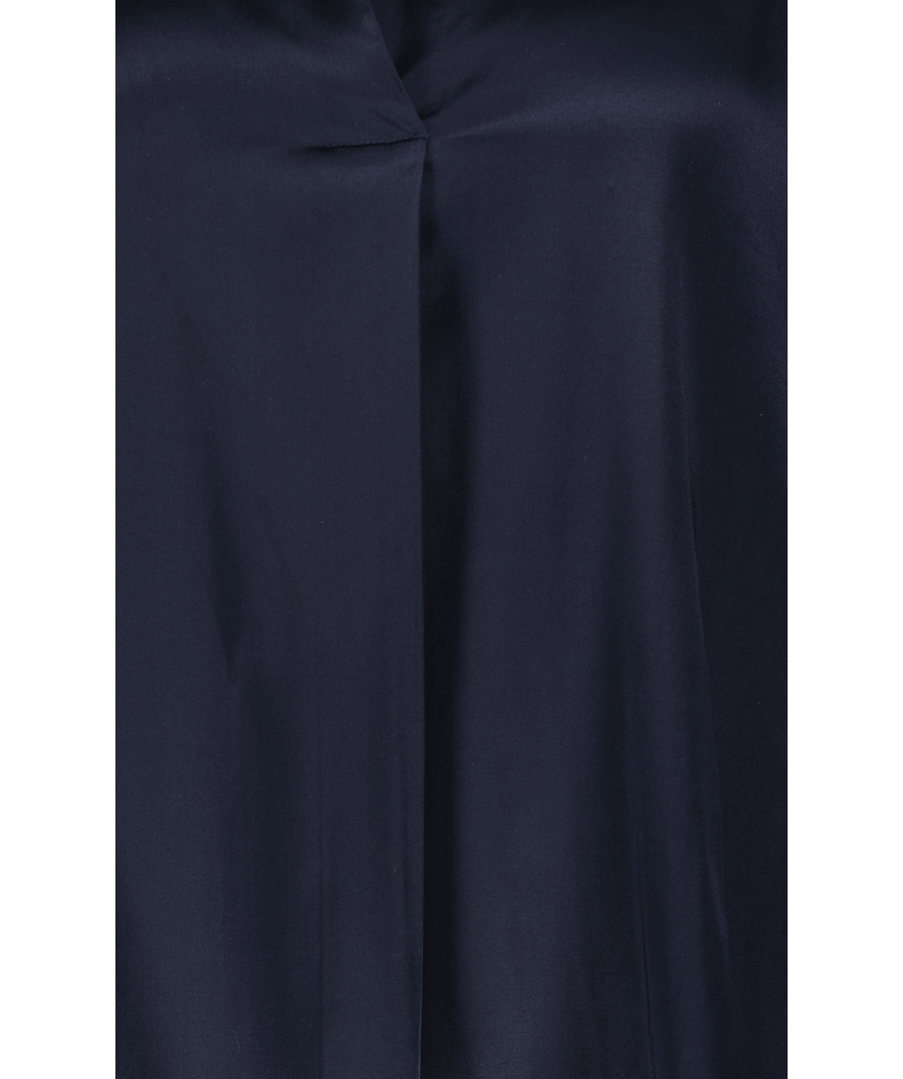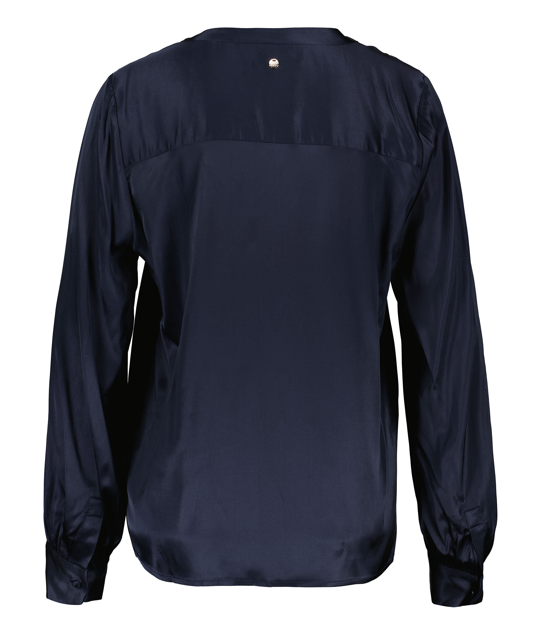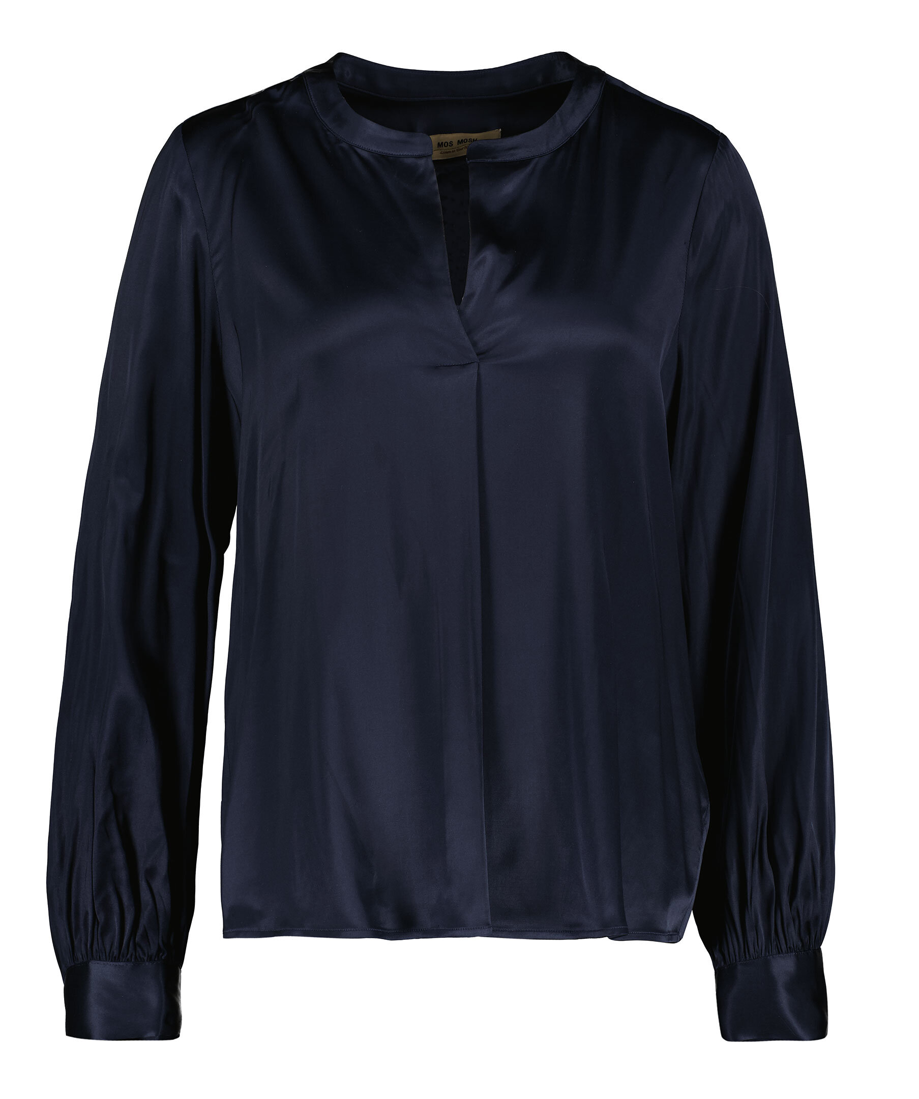 Marinblå, glansig satinblus från Mos Mosh. Lös passform, spetsig v-krage och tillverkad av en viskosblandning.