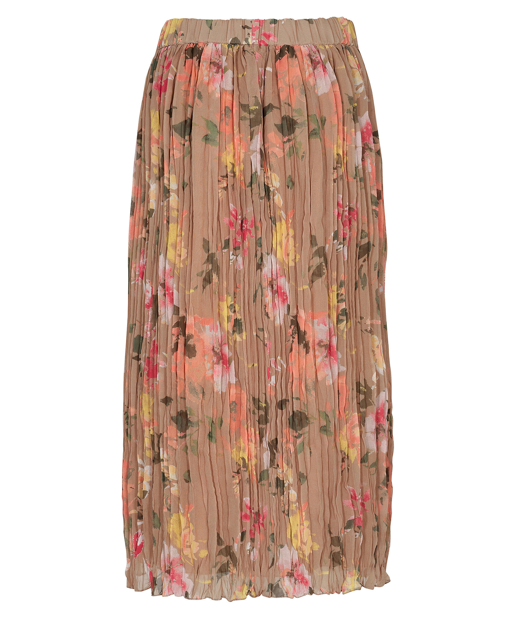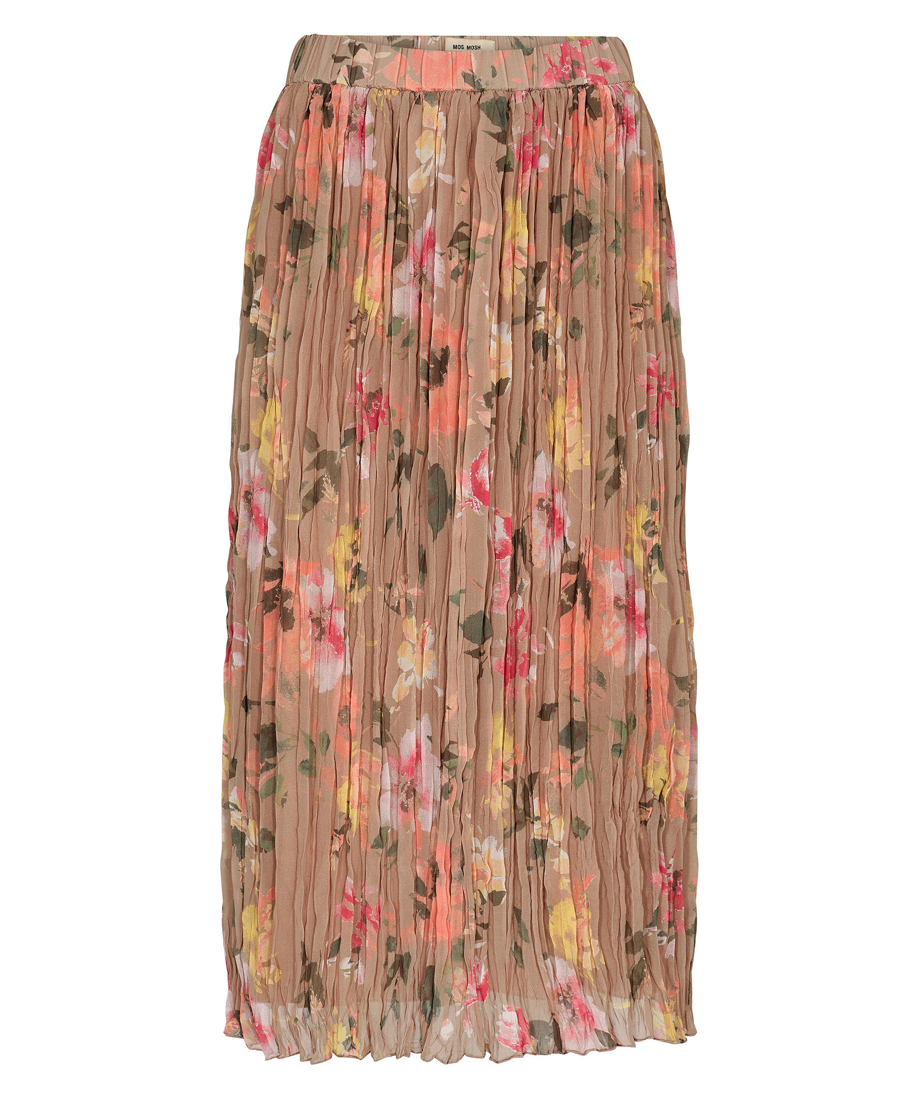 Beige, multifärgad mönstrad kjol i plisserat material från Mos Mosh. Elastisk resår i midjan. Plisserat transparent tyg, underkjol i polyester.